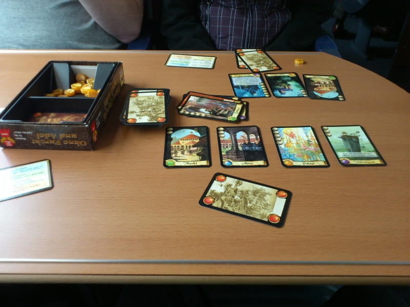 In Duisburg wartet eine Verspätung auf uns: Der ICE ist bisher fünf Minuten im Verzug. An sich sind die paar Minuten kein allzu großes Drama, allerdings müssen wir in Hannover noch einmal umsteigen und dort stehen uns nur acht Minuten zur Verfügung. Das könnte also knapp werden. Bis es soweit ist, lassen wir uns allerdings nicht die Laune verderben. Wir frühstücken zunächst ausgiebig und spielen u-build Monopoly und anschließend noch ein paar Runden Ohne Furcht und Adel.