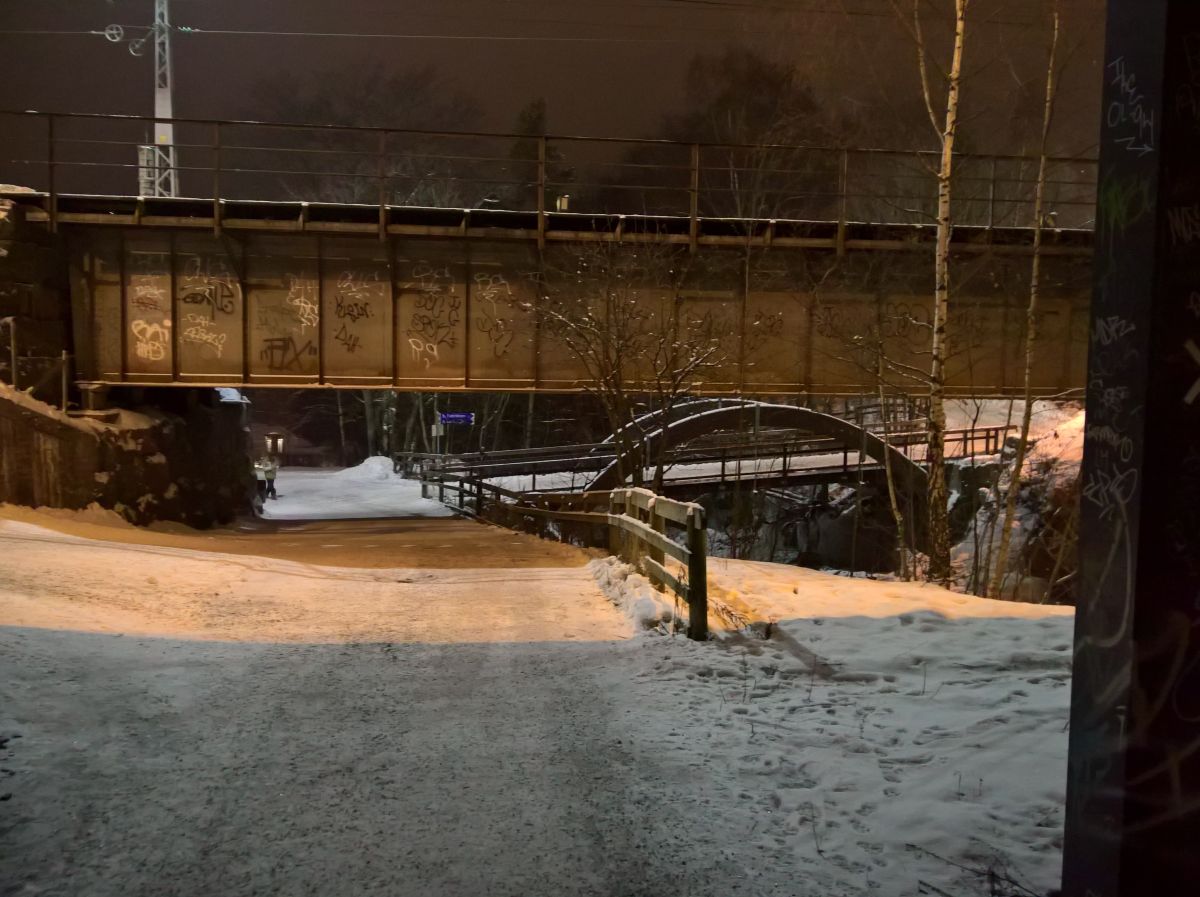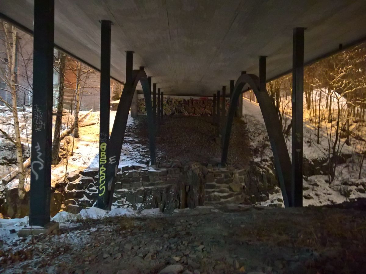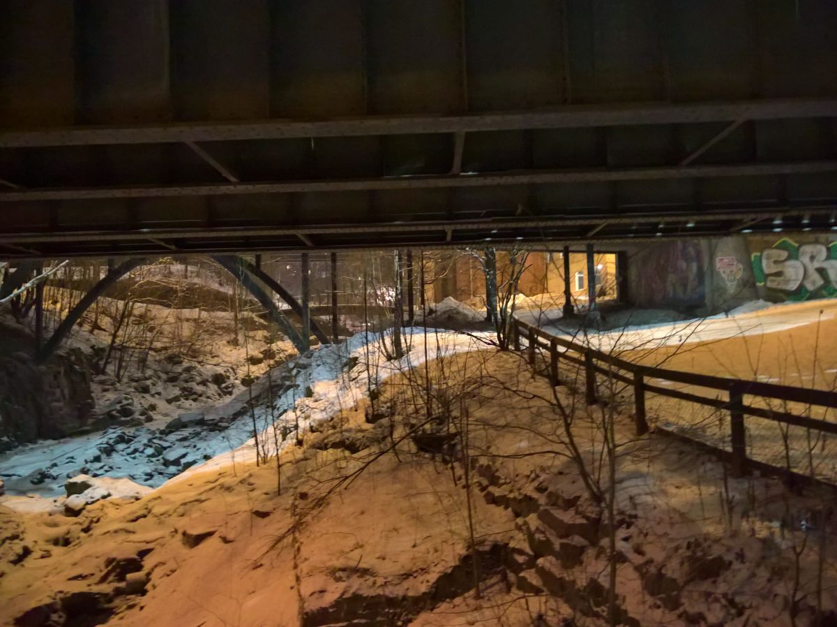 Wir hatten überlegt, noch runter zum See zu gehen. Die Wege waren teilweise sehr rutschig und verschlungen, gingen hin und her. Wir kamen wieder an dem zugefrorenen Bach vorbei, als wir einer Unterführung unter den Bahngleisen folgten.