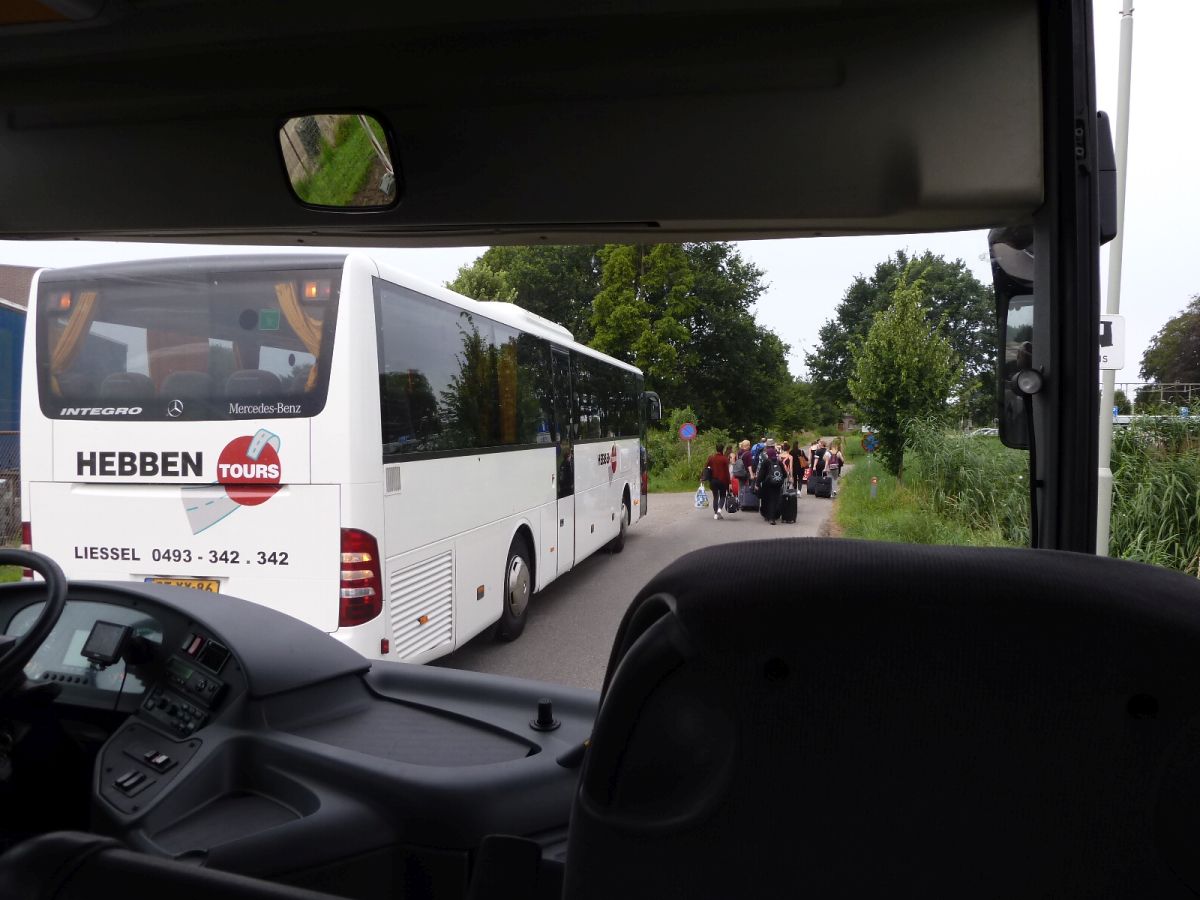 Beim Bus angekommen mussten wir warten. Der Busfahrer telephonierte mit irgendjemandem, der ihm offensichtlich das Okay gab, die Leute in den Bus einsteigen zu lassen. Wir fragten ihn dann, ob er uns denn auch mit unseren Fahrrädern mitnehmen würde. Das wollte er gerne, meinte aber, dass es für uns vielleicht bequemer sei, einfach mit dem nächsten Bus zu fahren, der gerade ankam und noch völlig leer war - und dies im großen und ganzen auch blieb. Unsere Fahrräder legten wir unten in den Gepäckraum, die Taschen daneben. Dann nahmen wir vorne im Bus Platz. Offenbar ging auch in die andere Richtung auf dem Bahngleis nichts, denn hinter uns hielt ein Bus, der eine dicke Menschentraube ausspuckte, die zum Bahnhof lief.