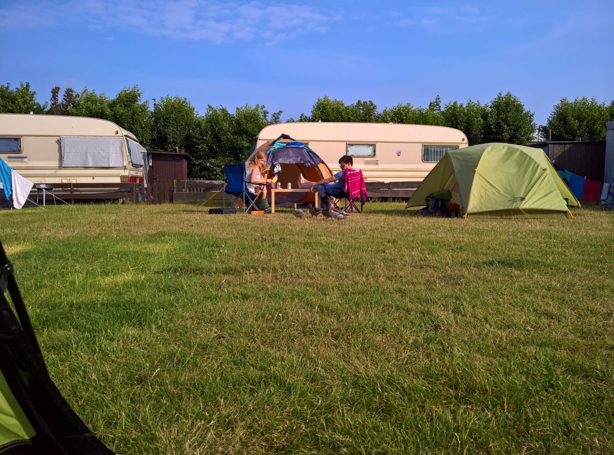 Wir bauten unser Zelt auf. Ich liebe dieses Teil. Auch wenn es bisweilen wenig komfortabel ist, auf allen Vieren in die Dackelgarage zu kriechen und sich auf der schmalen Leichtgewicht-Iso-Luftmatratze im Schlafsack der Bewegungsmöglichkeiten beraubt gemütlich hinzulegen, mag ich unser Zelt und generell das Camping an sich. Für Touren mit dem Auto habe ich ja noch das große Zelt, eine komfortablere Luftmatratze, Sitzmöbel und noch einiges mehr, das sich auf dem Fahrrad schlecht transportieren lässt.