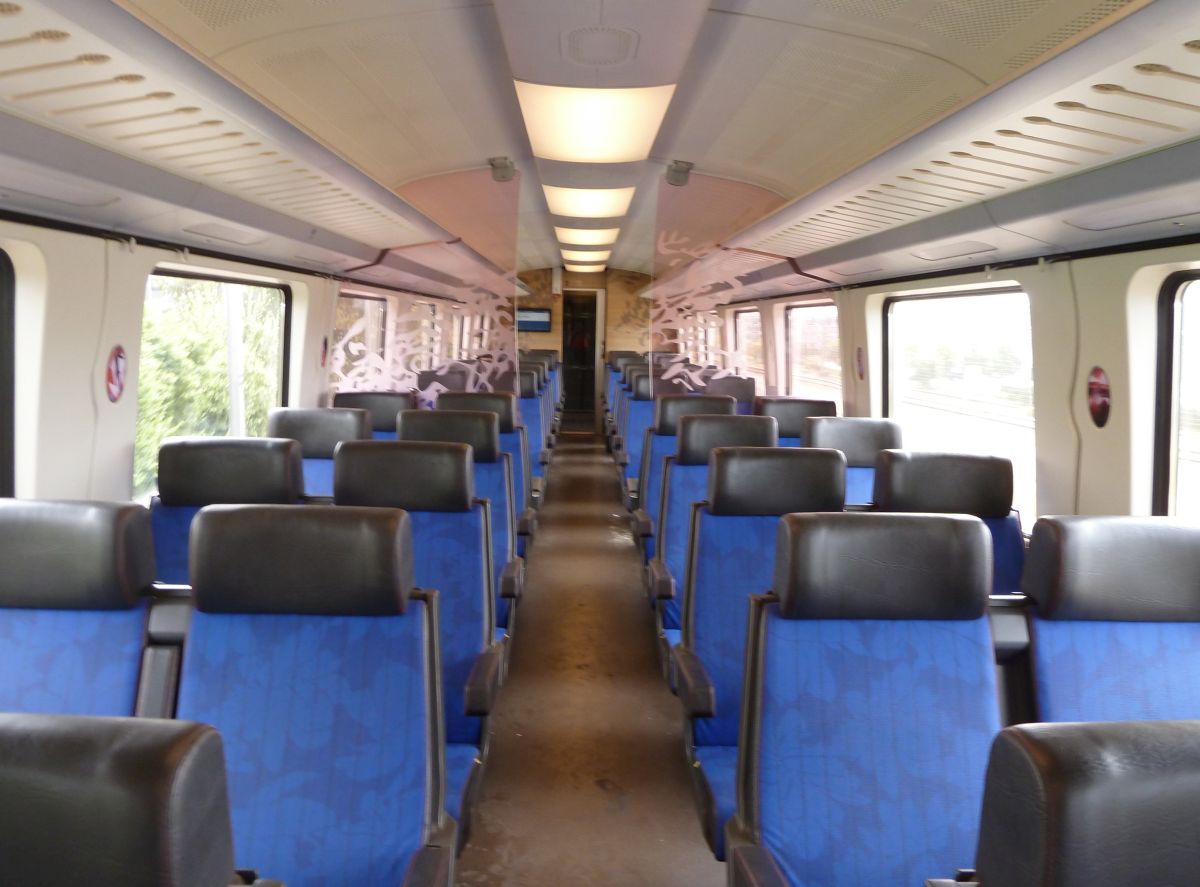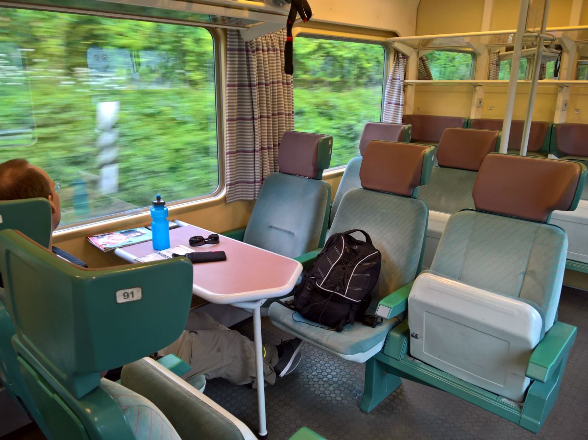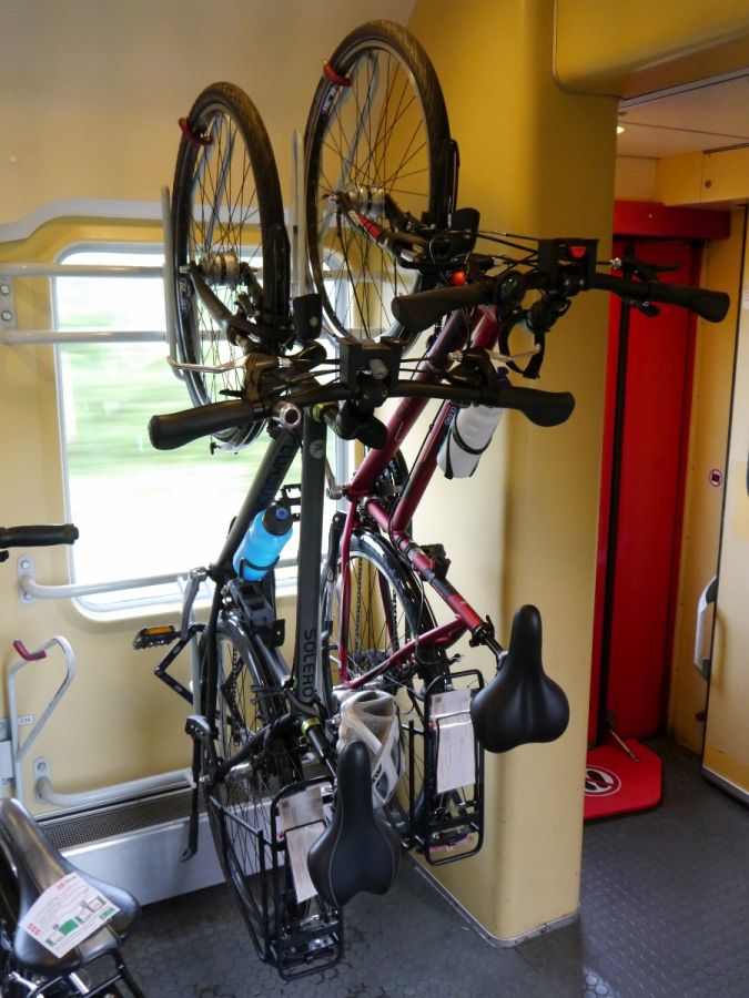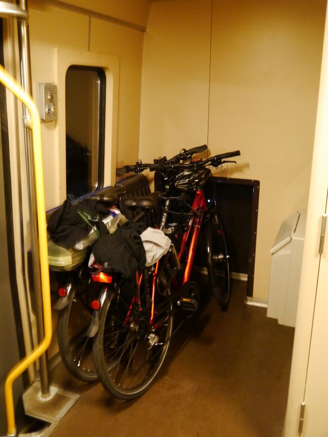 Leider hatte ich vorher nicht herausfinden können, wo sich die Fahrradabteile befinden. So etwas wie Wagenstandsanzeiger habe ich nicht gefunden. Wir mussten uns überraschen lassen. Das Fahrradabteil, in dessen Nähe wir standen, war ziemlich voll. So liefen wir den Zug entlang bis ans Ende, wo ein weiteres Fahrradabteil war, in dem noch Platz für uns war. Wir stellten unsere Räder ab, nahmen Platz und hatten nun wiederum etwa eine Stunde Zeit, uns für den nächsten Teil der Reise auszuruhen.