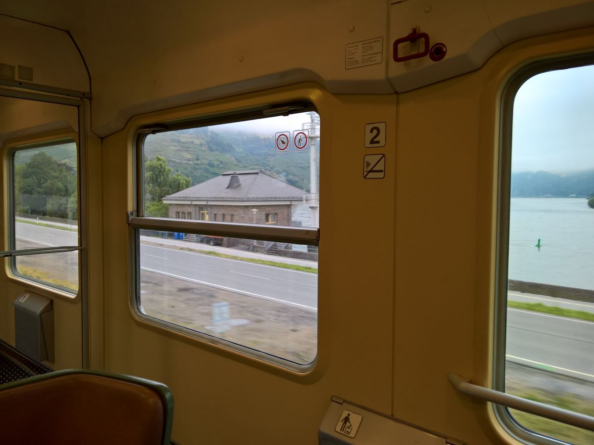 Unsere erste Etappe führte uns über Mainz, wo wir umsteigen mussten, am Rhein entlang nach Köln. Unsere Fahrräder hingen im Fahrradabteil und wir saßen im Großraumwagen nebendran. Es war ein alter IC, mit ziemlich alter Ausstattung. Aber ich mag diese Züge. Und das Beste an ihnen: Man kann sogar noch die Fenster öffnen!