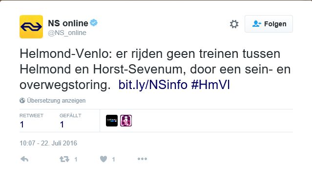 Während wir noch unsere Fahrräder abstellten, kam ein eben solcher aus dem Nooduitgang für den Machinisten. Und ich fragte vorsichtshalber noch einmal nach, ob dieser Zug wirklich nach Rotterdam fahren würde. Die Antwort missfiel mir: “Nein.” Ich dachte erst, der verarscht mich. Aber dann kam die Erklärung in einer Mischung aus Niederländisch, Deutsch und Englisch, dass auf der Strecke zwischen Venlo und Eindhoven wohl eine Störung vorläge. Dieser Zug würde nur bist Horst-Sevenum fahren. Dazu gab es auch einen Tweet auf Twitter.
