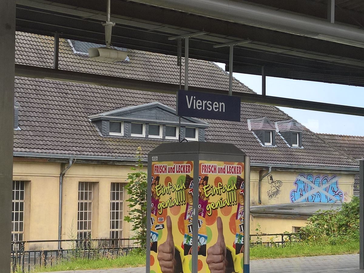 Ursprünglich hatten wir vor, noch im Café Reichard zu frühstücken. Aber das Wetter lud nicht wirklich zum Draußen Sitzen ein und unser ganzes Gepäck von den Fahrrädern abzumachen, war uns zu lästig. Kurz entschlossen fuhren wir zum Bahnhof zurück, besorgten uns Proviant für die Weiterreise und nahmen den Zug eine Stunde früher nach Venlo. Dabei fuhren wir durch Viersen, von wo aus ich einen nostalgischen Gruß an das darkinchen schickte.