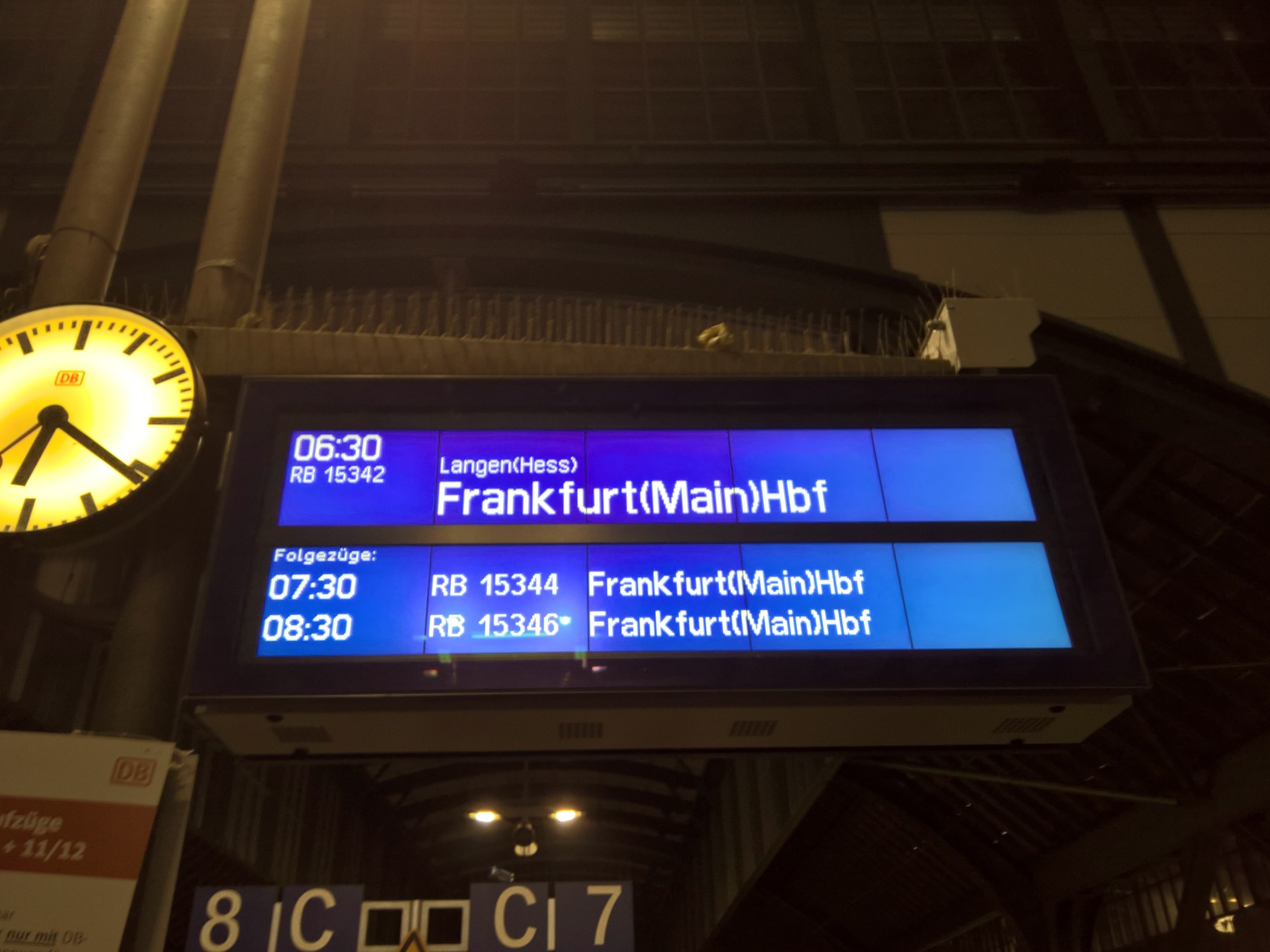 Wie üblich machen wir uns früh auf den Weg. Zurzeit werden in Darmstadt Straßenbahngleise neu verlegt, weswegen die Tram durch einen Bus ersetzt wird. Gut für uns, denn der Bus fährt an unserem Haus vorbei, der Weg ist somit um sagenhafte zwei Minuten kürzer. Wir warten in Allerherrgottsfrühe im verregneten und kalten Darmstadt also auf den Bus, der uns zum Haupbahnhof bringt.