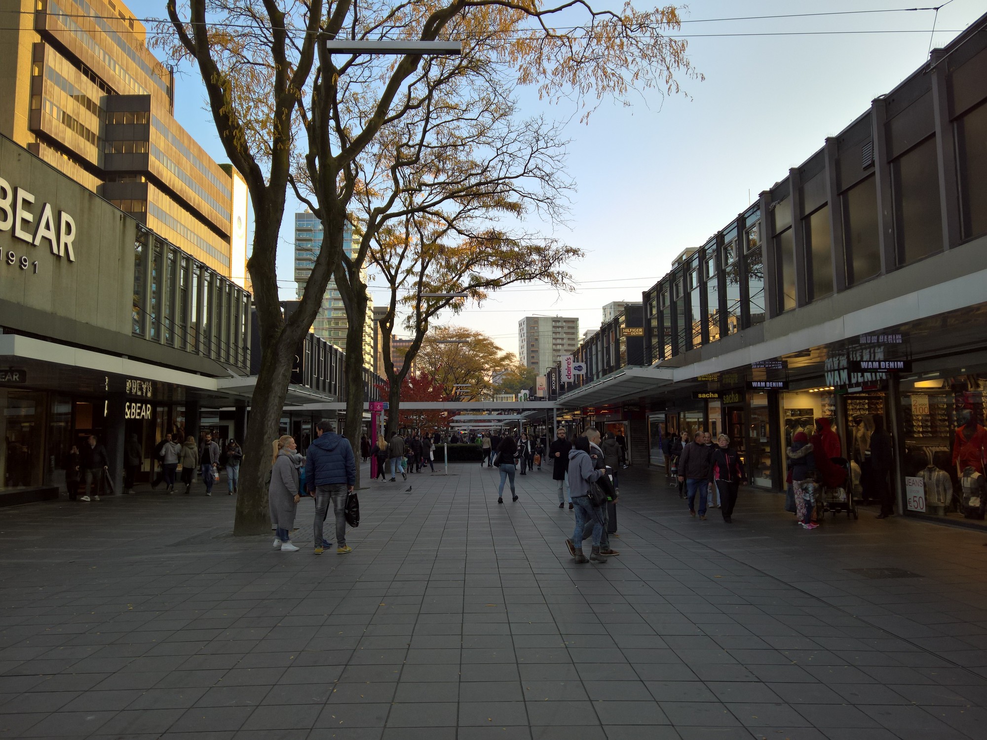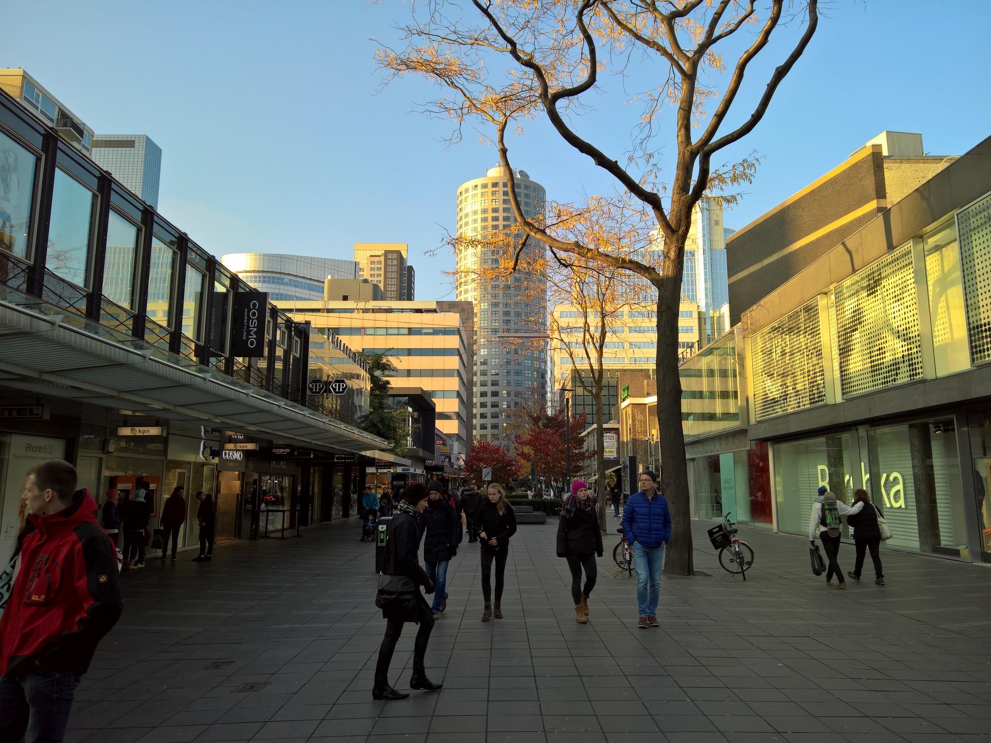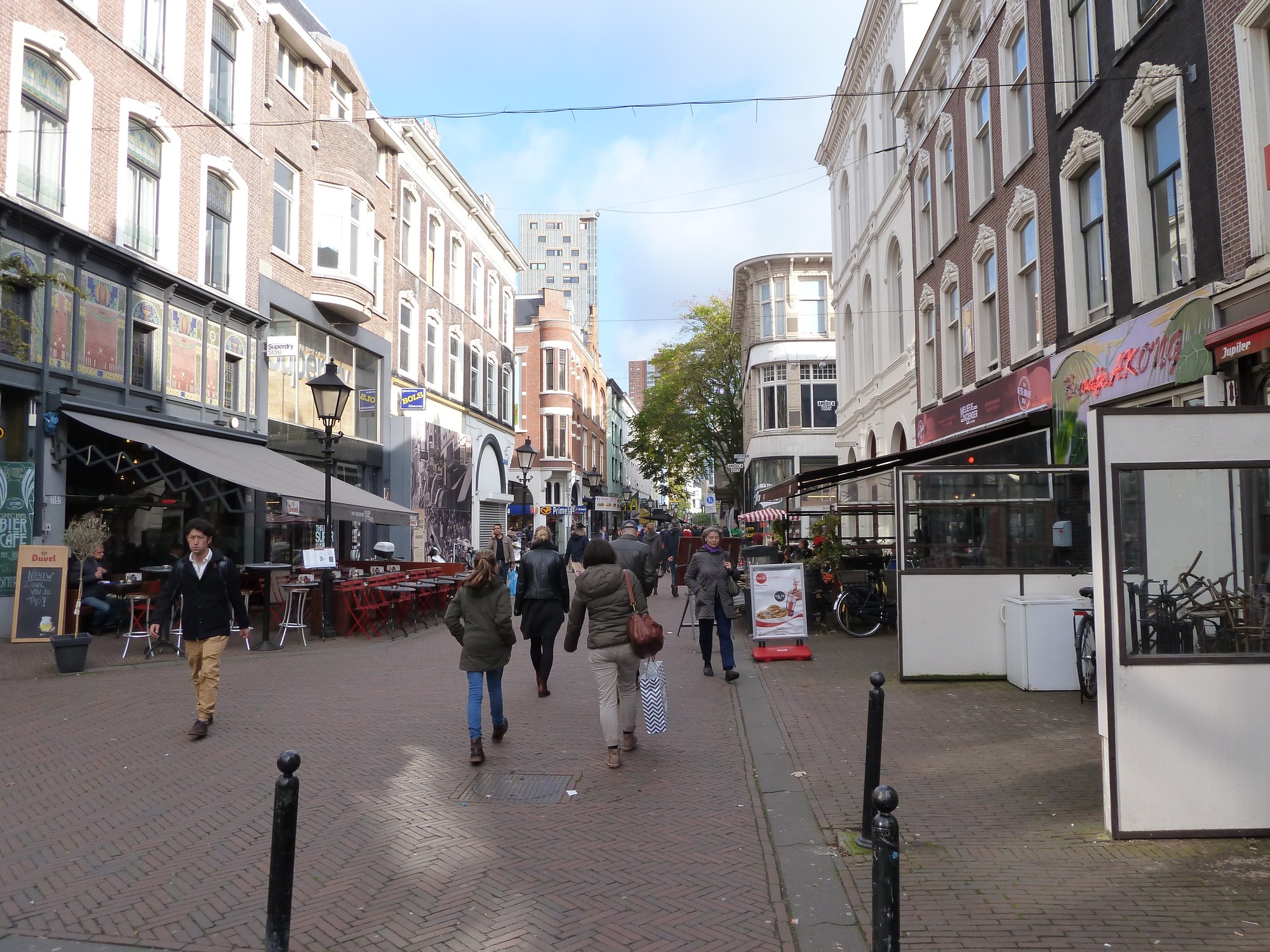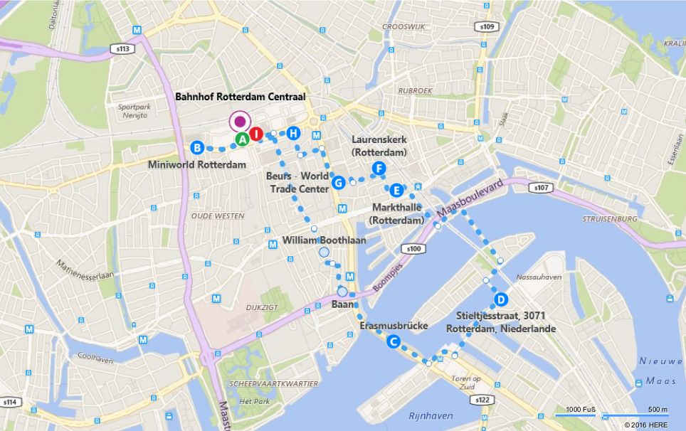Nachdem wir gegessen haben und noch ein wenig zwecks Erholung dort mitten in der Fußgängerzone saßen, machen wir uns nun auf den Weg durch Rotterdam. Wir hatten zuvor zuhause schon geschaut, was wir alles sehen wollen, und uns eine Karte ausgedruckt.