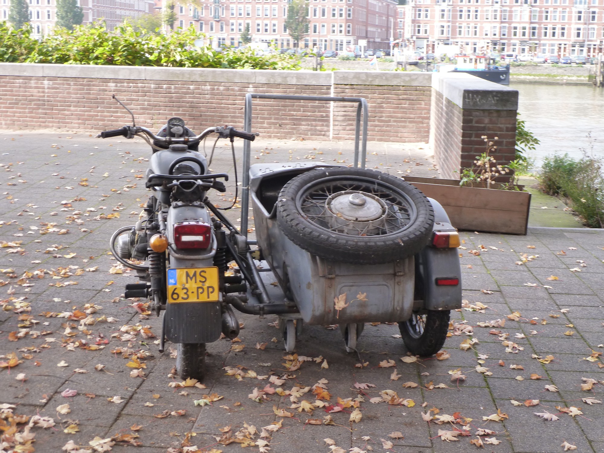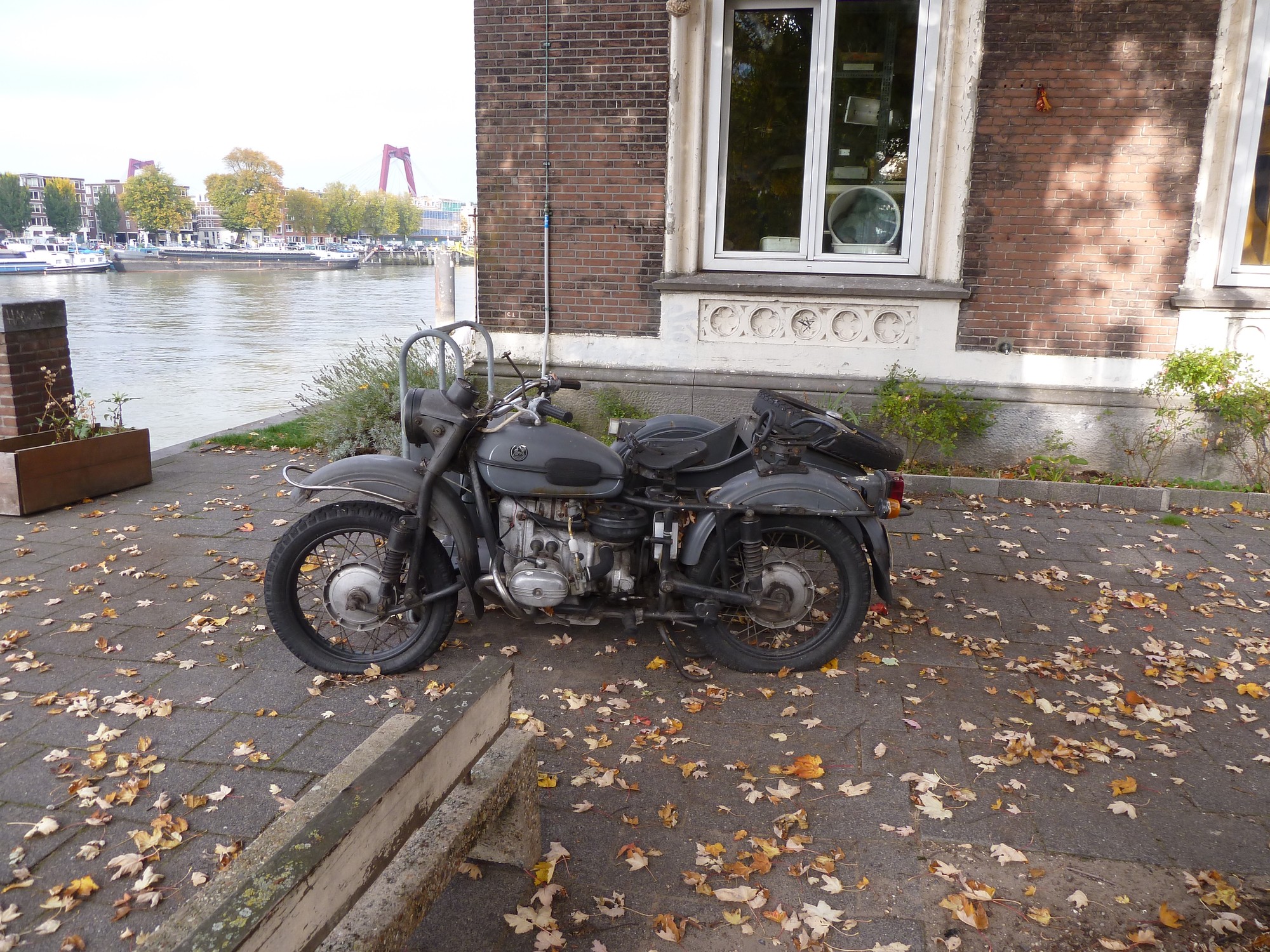 Aber es gibt nicht nur Wasser, Brücken und witzige Architektur in Rotterdam zu sehen, auch ein Motorrad der Marke Ural steht am Wegesrand herum und will geknipst werden.