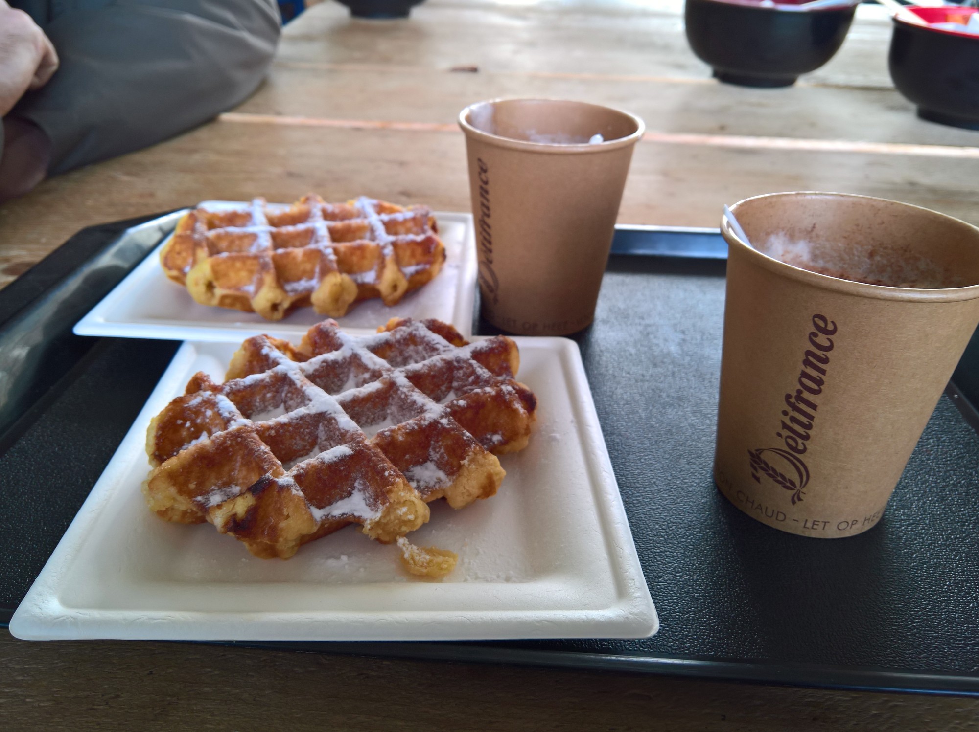 Es braucht eine Weile, bis wir einen Platz gefunden haben in diesem unübersichtlichen Ding. Es ist voll und laut, aber irgendwie auch kultig. Und deswegen gibt es hier für uns jetzt Kaffee bzw. heiße Schokolade und Waffeln.