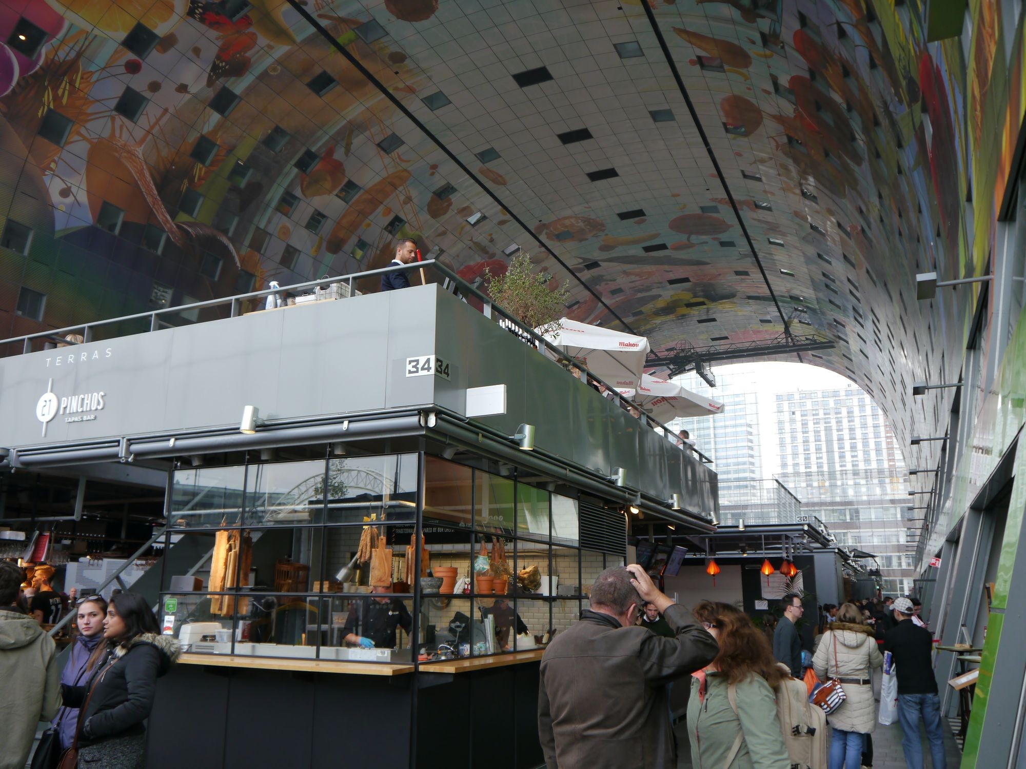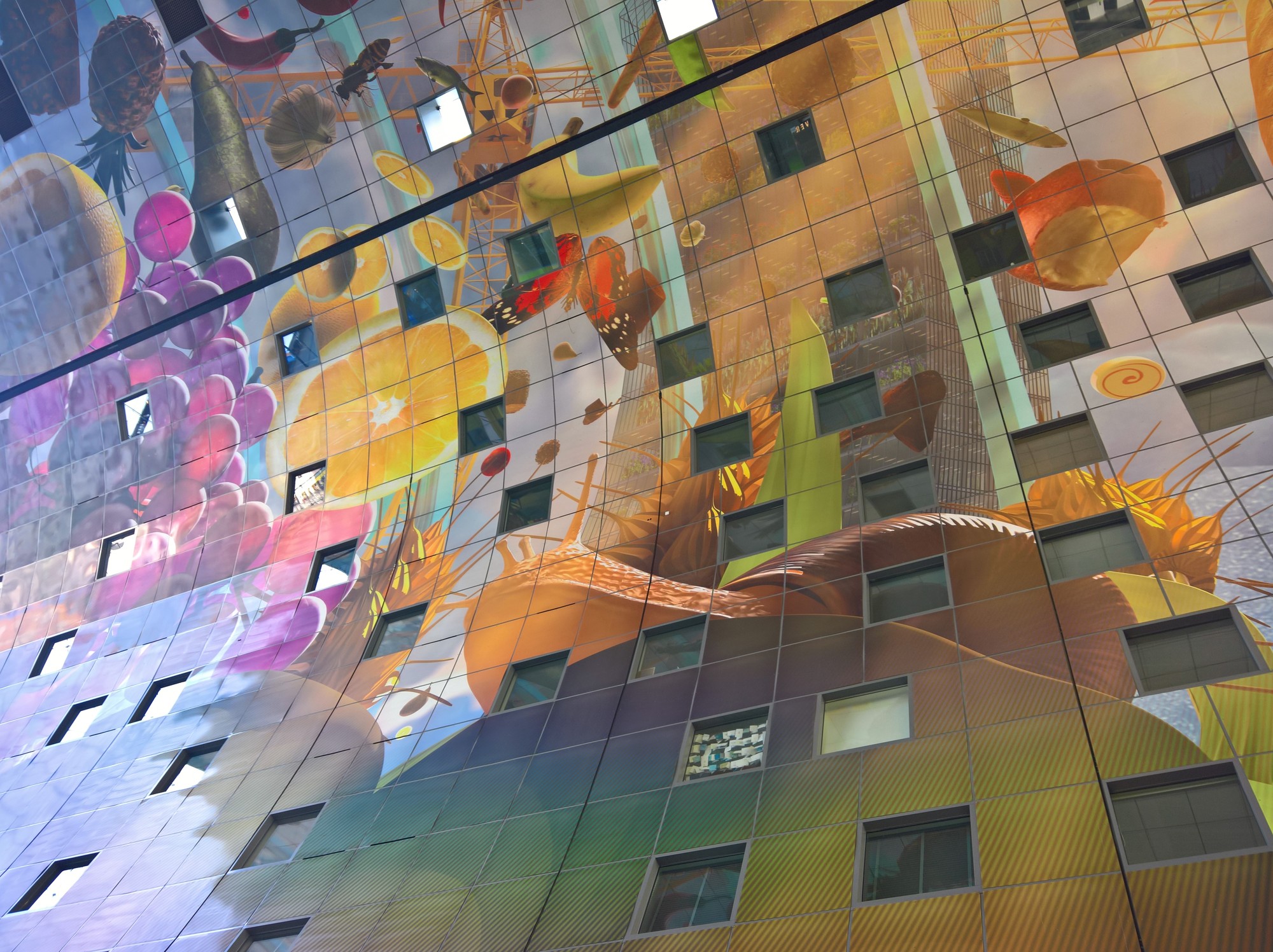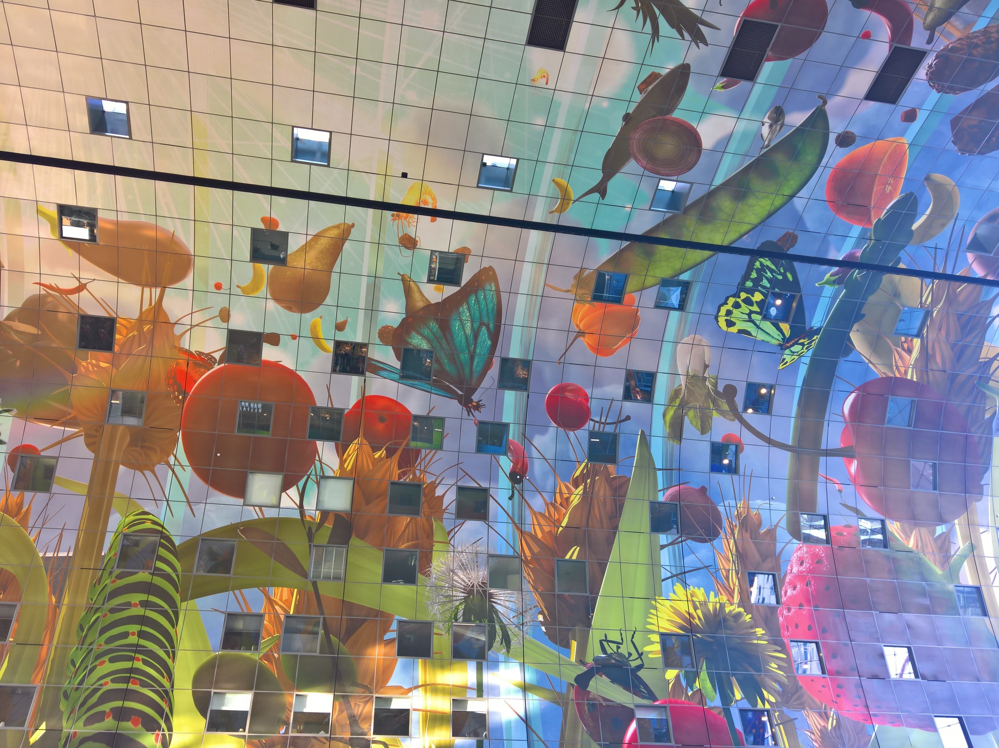 Dieses Ding ist auch wieder irre, Fresstempel, Wohnhaus, architektonisches Highlight und Kunst zugleich. 11 Stockwerke ist die Markthalle hoch, es gibt 228 Wohnungen, alle mit Blick in die Markthalle. Im Erdgeschoss, Untergeschoss und der ersten Etage sind Geschäfte, Marktbuden und Fressstände. Und eine riesige Tiefgarage gibt es laut Wikipedia auch noch. Die Kunst befindet sich an der Decke.