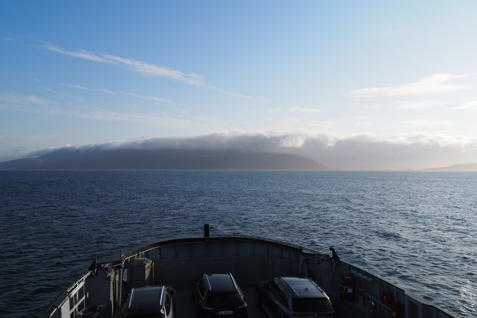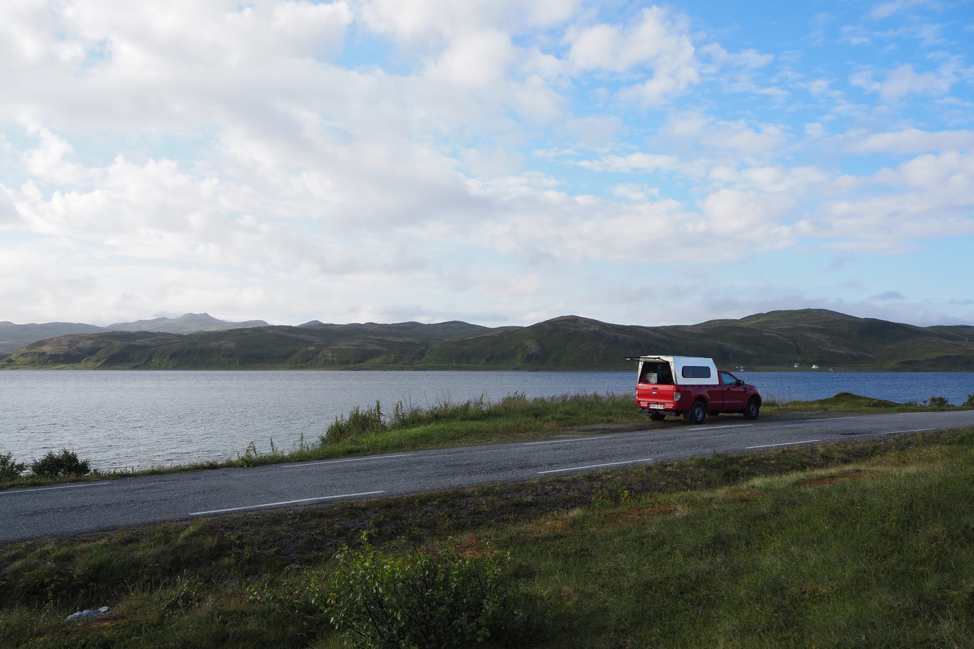 Aufgrund der für uns ungünstigen Fährzeiten beschlossen wir, die Mittagsfähre zu nehmen und auf Ringvassøya einen Platz zum Arbeiten zu suchen. Ich räumte den Camper auf, spülte das Geschirr usw. Dann platzierte ich den Herrn Lebensabschnittsgefährten mit dem Laptop und dem Router auf dem Beifahrersitz, räumte hinten den letzten Kram noch weg und fuhr los zum Fährhafen.