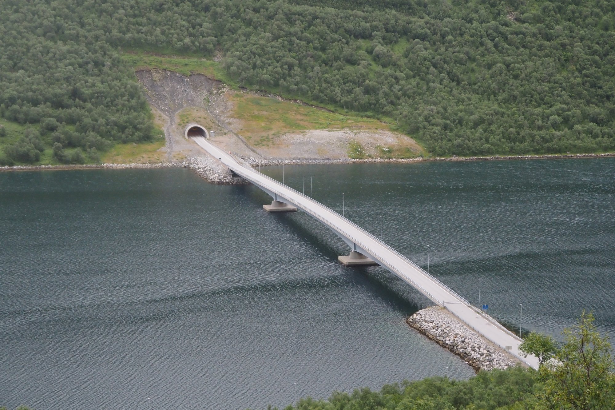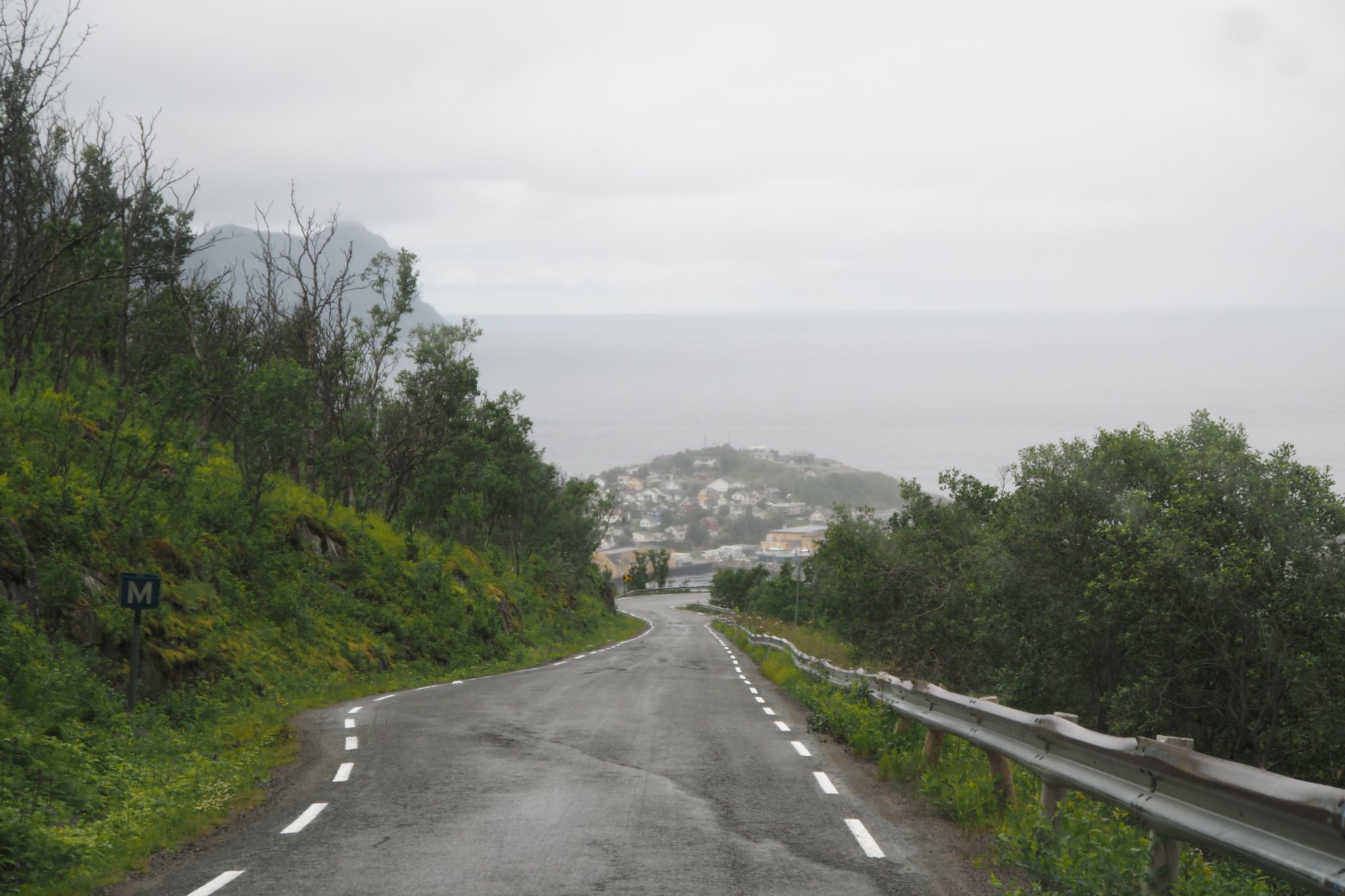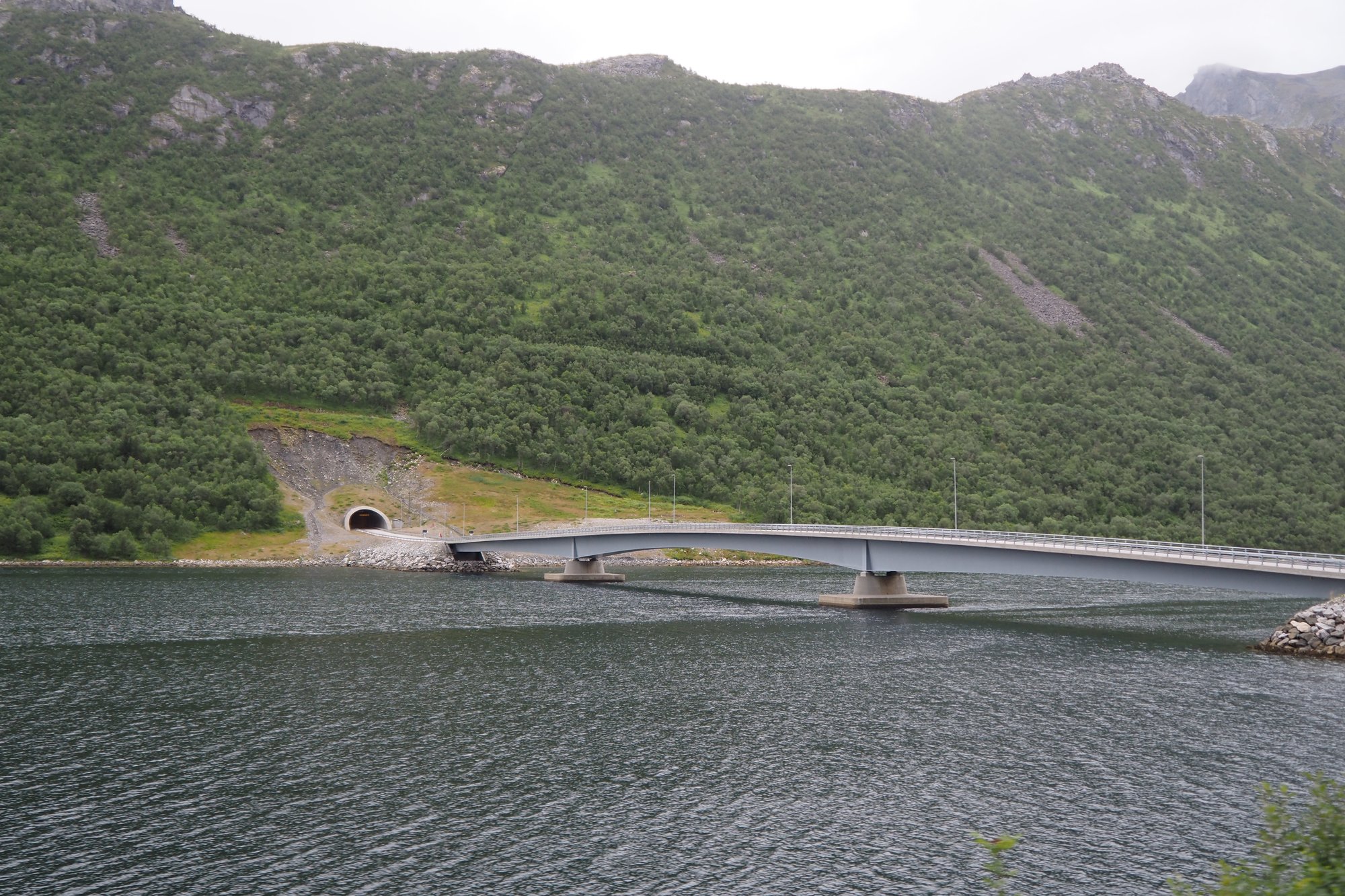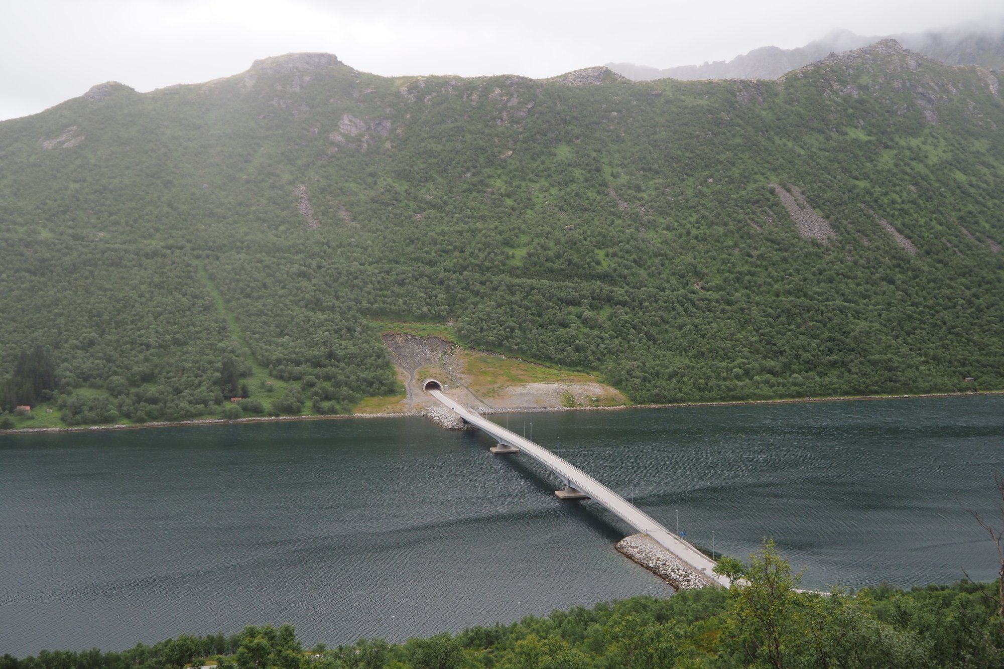 Wir hatten noch viel Zeit, die Fähre fuhr erst in knapp drei Stunden und wir waren schon wenige Kilometer vor Gryllefjorden, wo die Fähre abfuhr. Nach der Brücke, die über den Gryllefjord führt, führte eine Straße den Berg hinauf. In der engen Kurve genau über der Brücke gibt es eine Parkbucht, in der wir nochmal kurz gehalten haben.