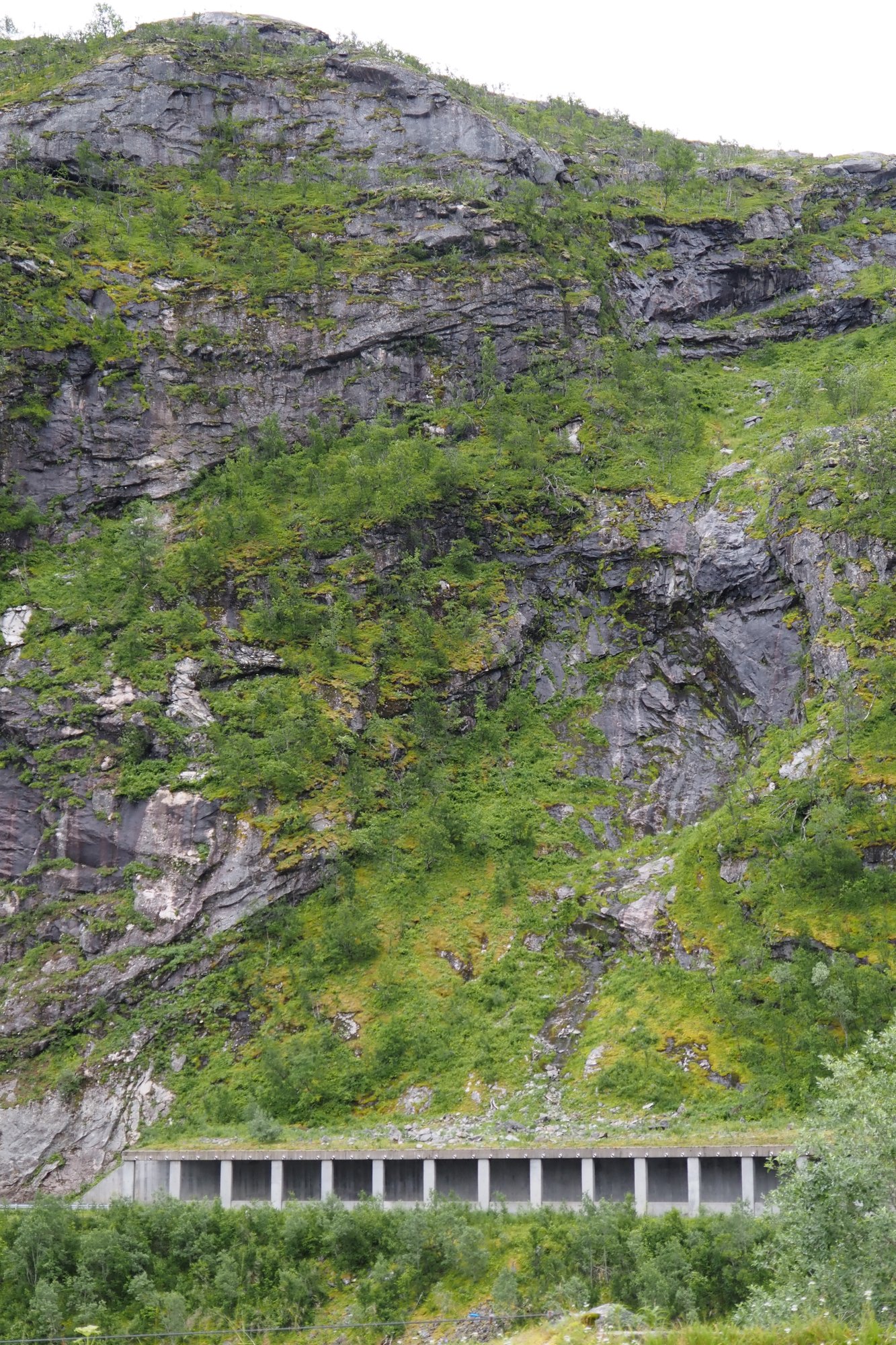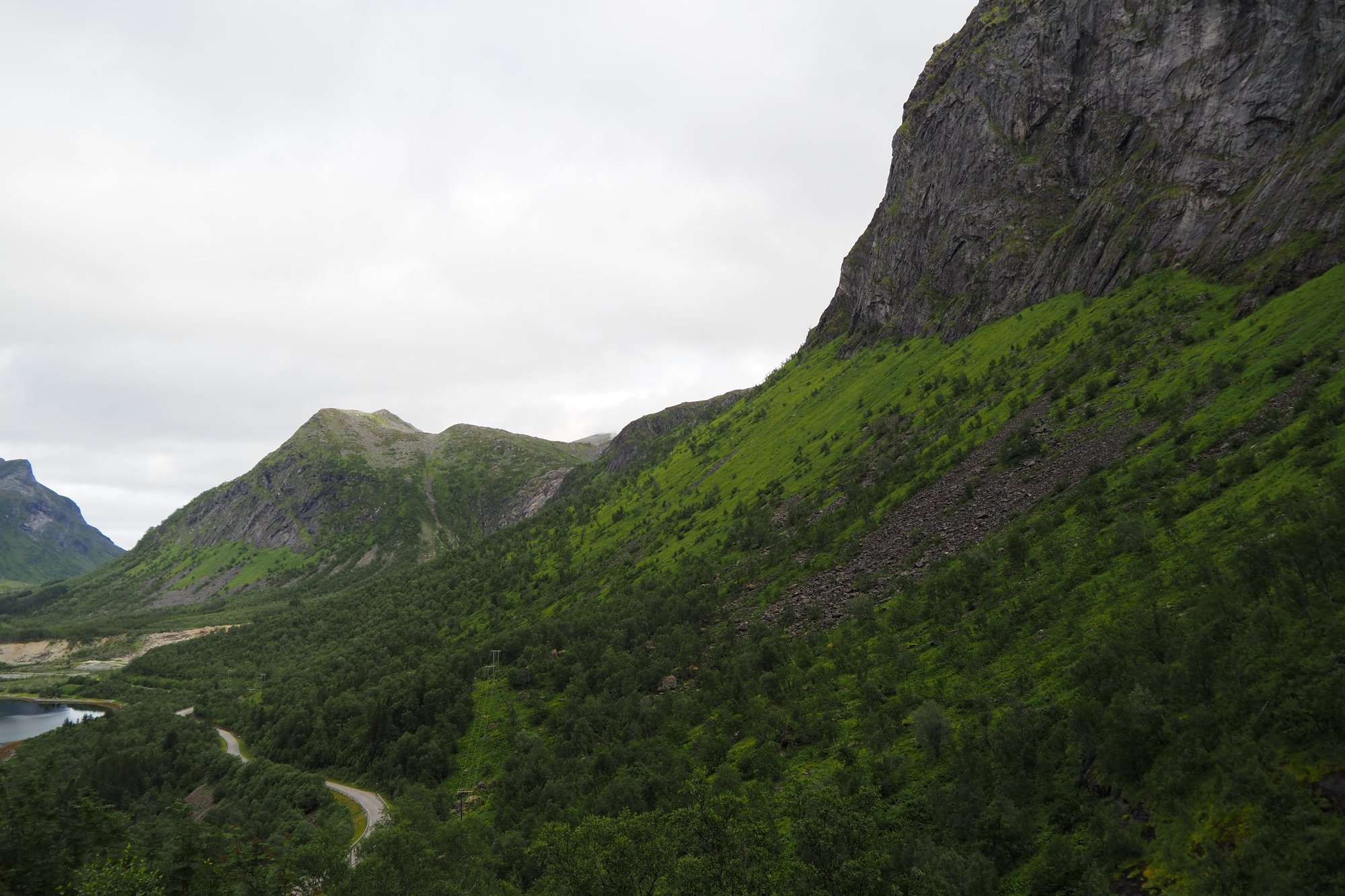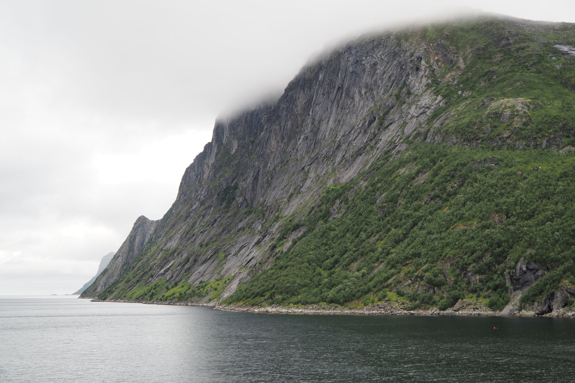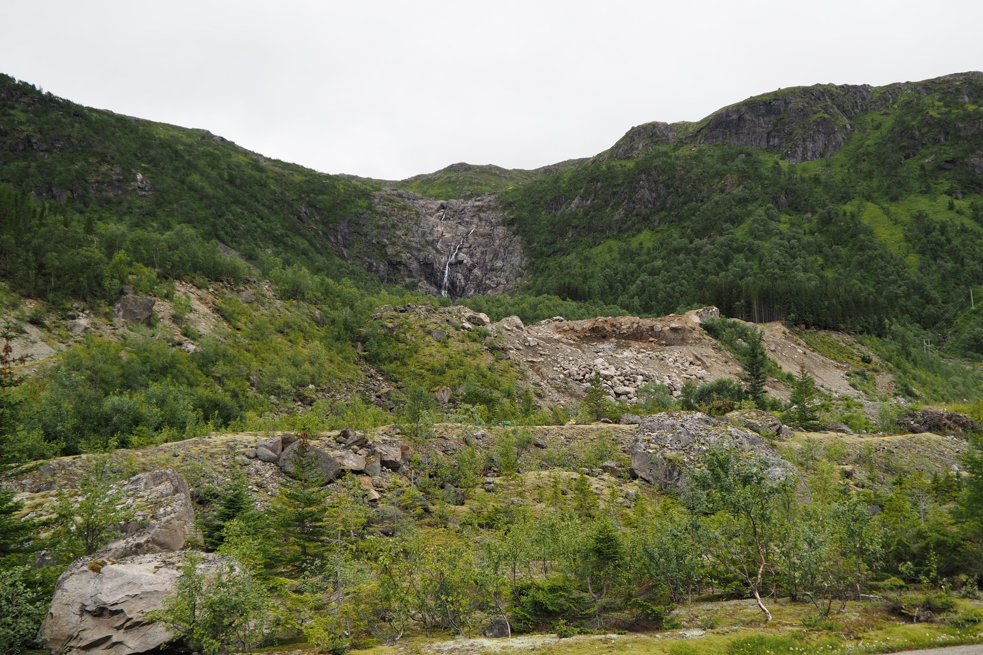 Wir hatten noch viel Zeit, die Fähre fuhr erst in knapp drei Stunden und wir waren schon wenige Kilometer vor Gryllefjorden, wo die Fähre abfuhr. Nach der Brücke, die über den Gryllefjord führt, führte eine Straße den Berg hinauf. In der engen Kurve genau über der Brücke gibt es eine Parkbucht, in der wir nochmal kurz gehalten haben.