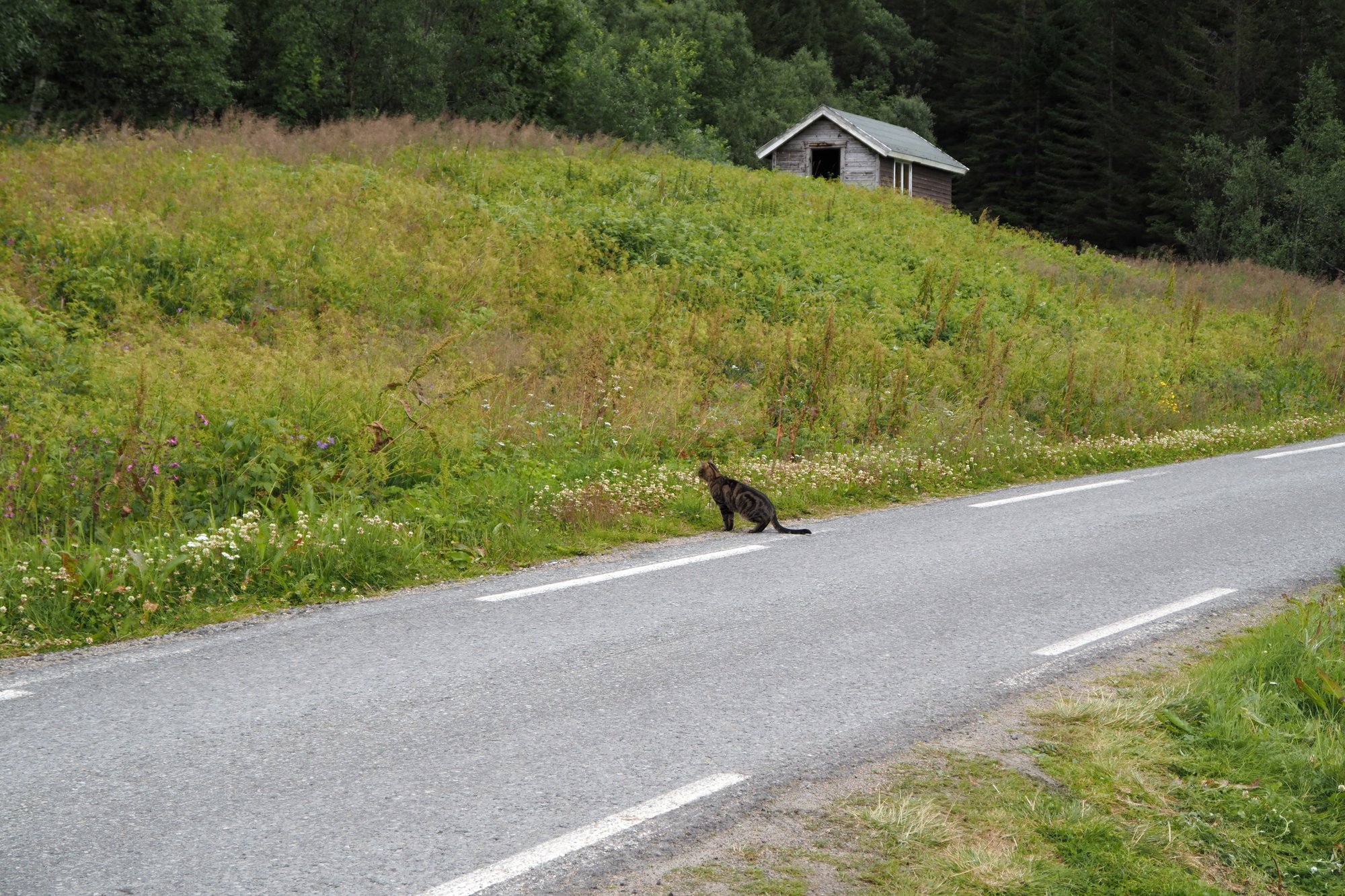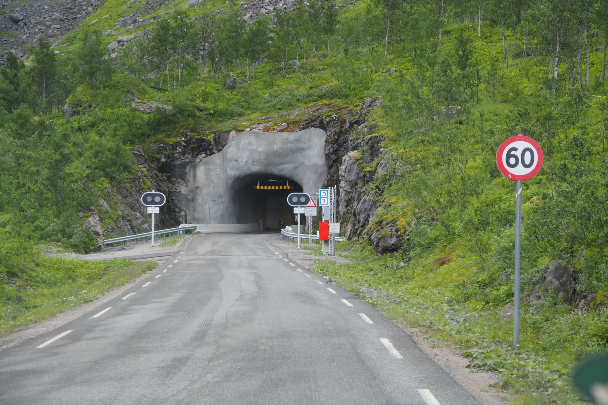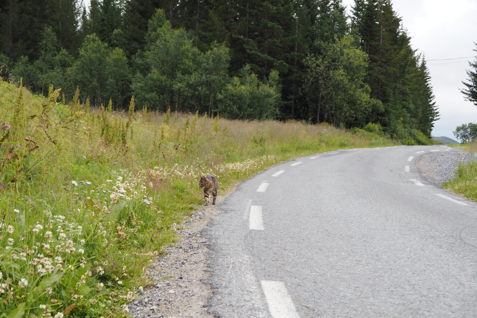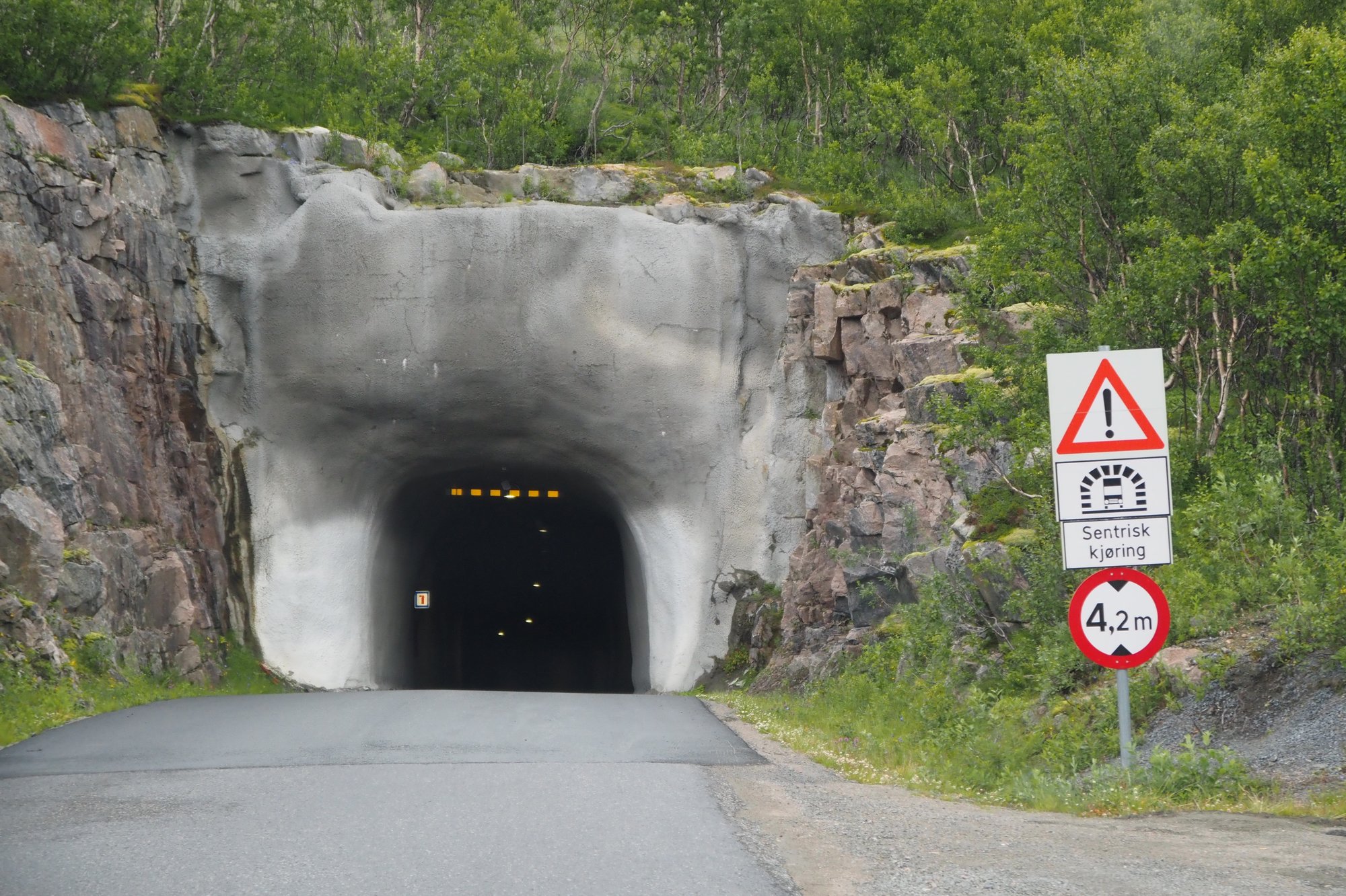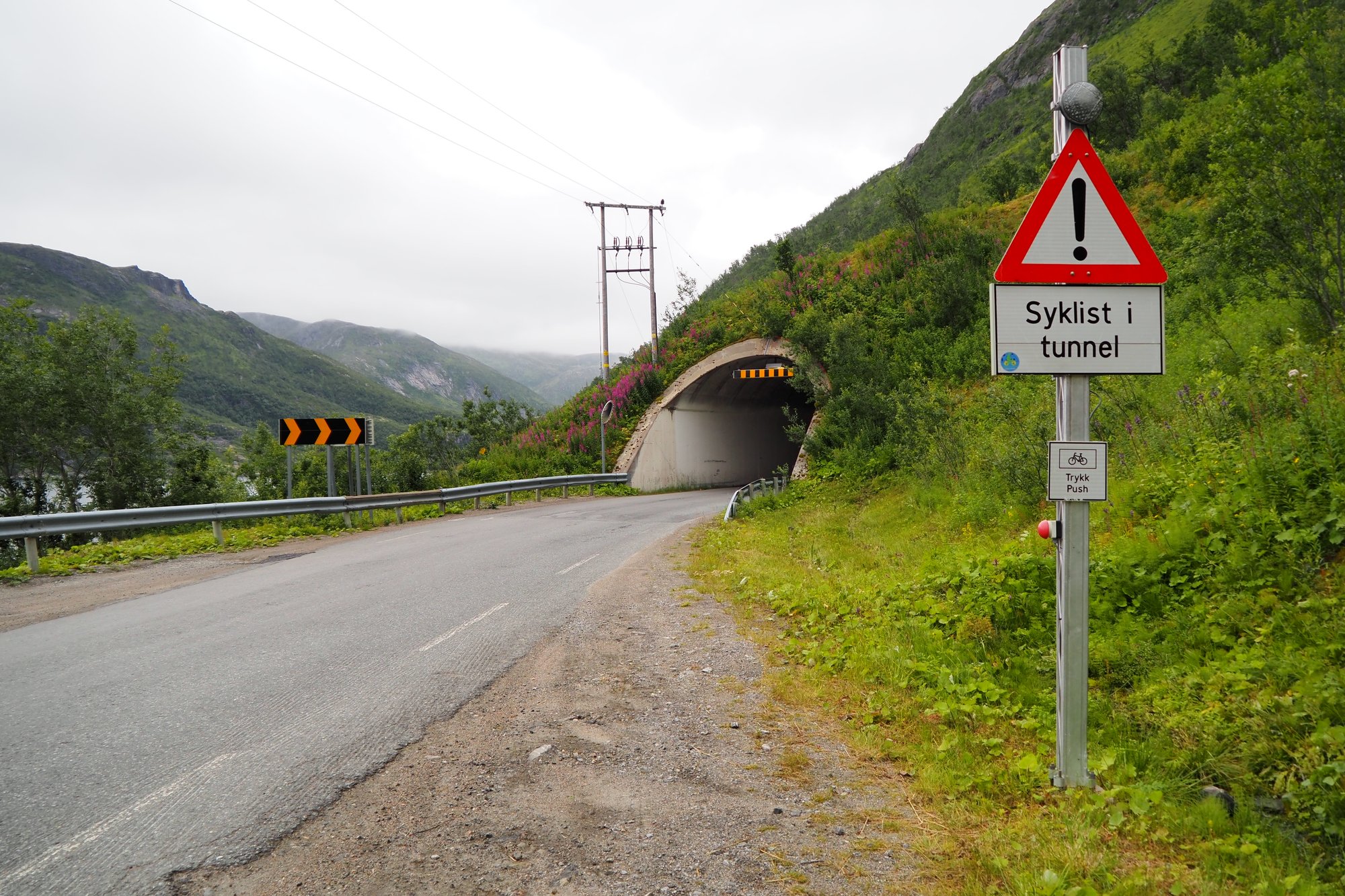 Auf dem Weg weiter Richtung Süden kamen wir tatsächlich an einen Tunnel, in dem die Fahrradfahrer-Warnleuchte eingeschaltet war. In Svanelvmoen bogen wir auf eine Schotterpiste ab. Diese war teils geschottert, teils asphaltiert.