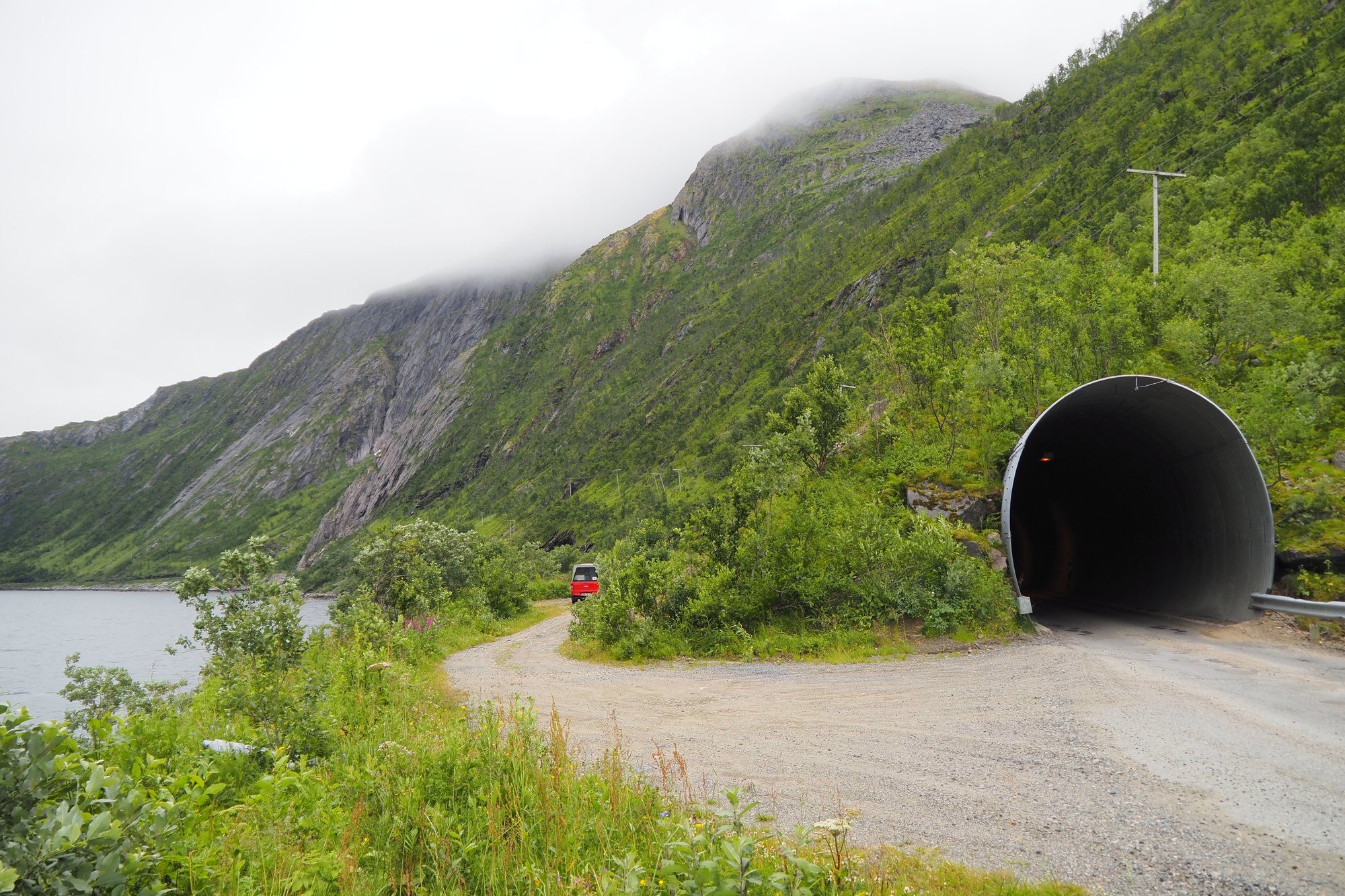 Wir fuhren bis zum Ørnfjord, wofür wir einen großen Teil der Strecke wieder zurück fahren mussten. Am Ende der Straße in Fjordgård machten wir kehrt. Eigentlich waren wir auf der Suche nach einem ruhigen Parkplatz für die Mittagspause. Den fanden wir aber erst auf dem Rückweg an der alten Straße neben dem Tunnel.