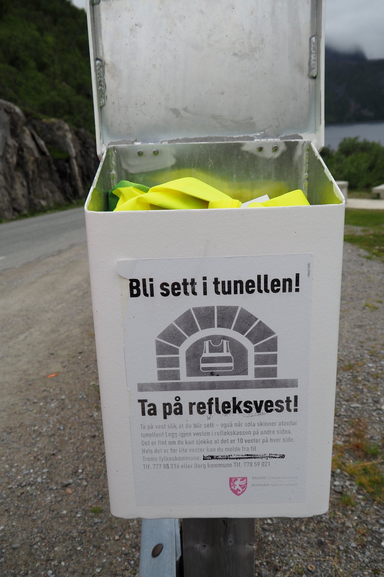 Die Tunnel entlang der Strecke sind ziemlich finster und eng. Bei einigen stehen vorher Schilder mit Schaltern für Radfahrer. Wenn die den Schalter betätigen, geht die Warnlampe am Schild an, die signalisiert, dass ein Radfahrer im Tunnel ist. Außerdem sind an den Tunneleinfahrten Boxen mit Warnwesten, auf denen steht, dass man eine nehmen soll, um besser gesehen zu werden.