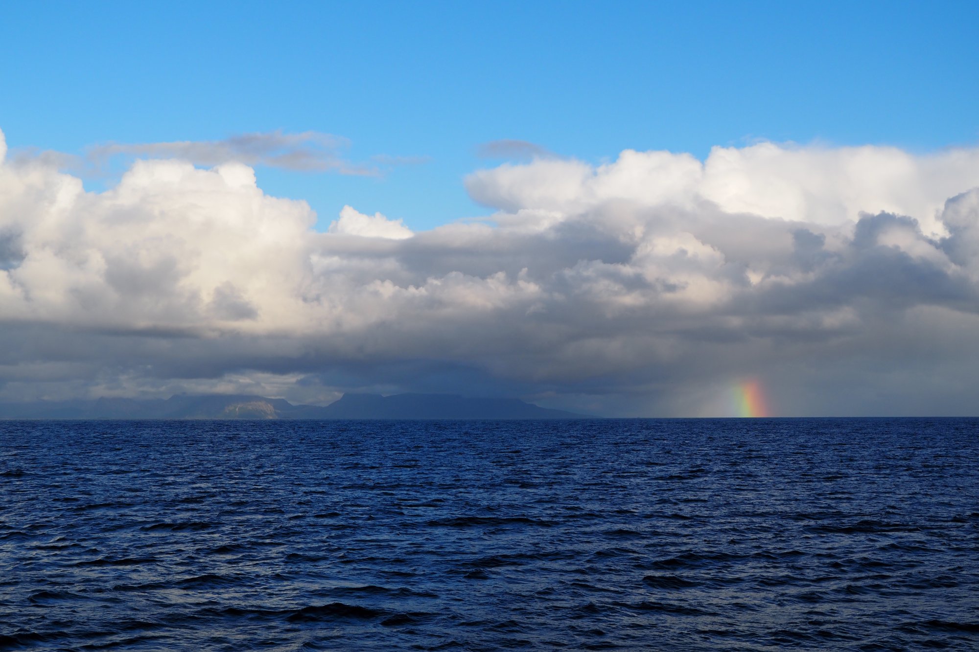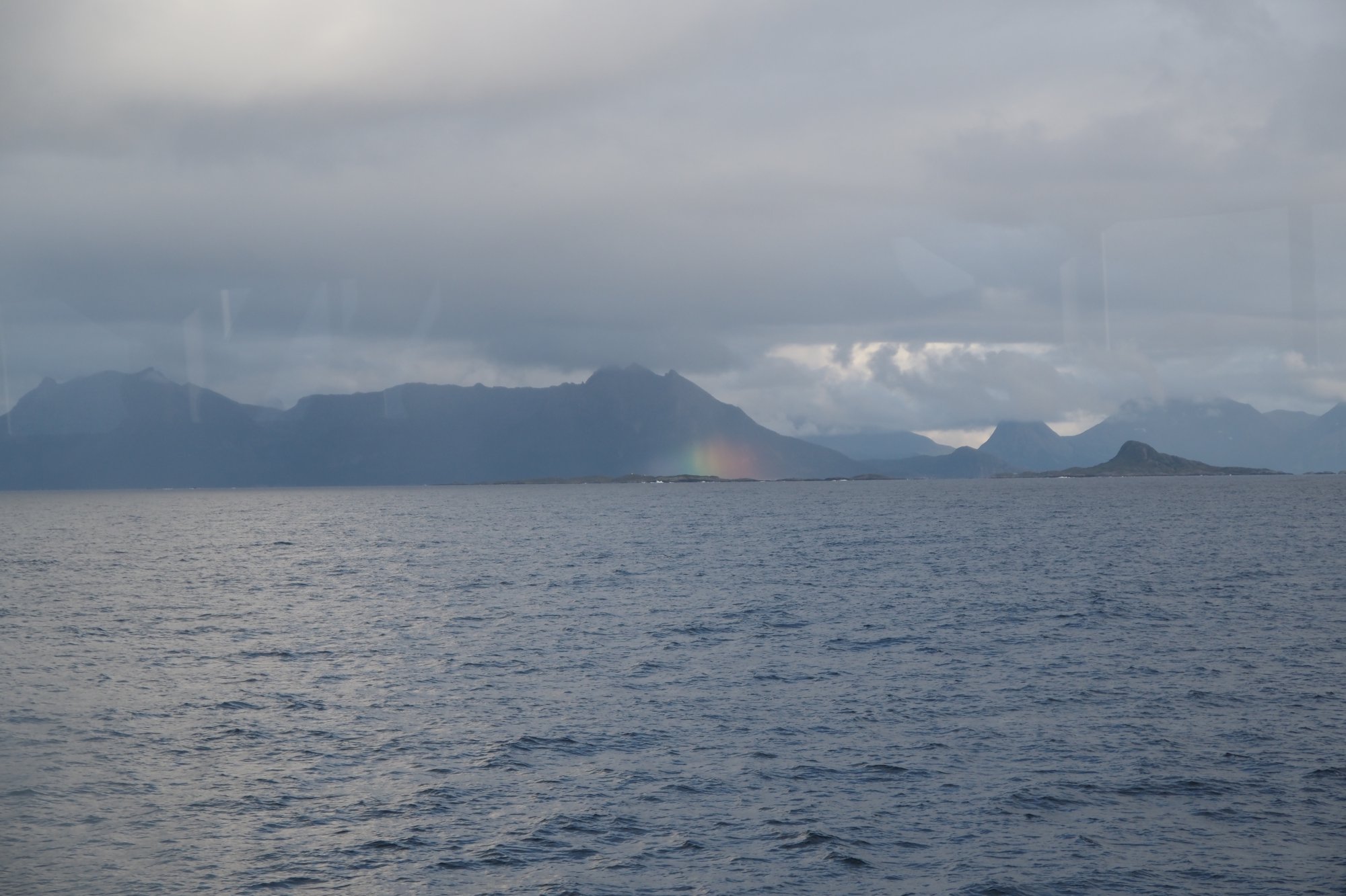 Gesättigt ging es aufs Schiff. Die Überfahrt dauerte etwa 1,5 Stunden. Wir sahen einen tollen Regenbogen, natürlich nochmal den Blick zurück auf Senja und als Empfangs-Chef wartete auf der anderen Seite ein Kormoran auf einer Stange im Wasser.
