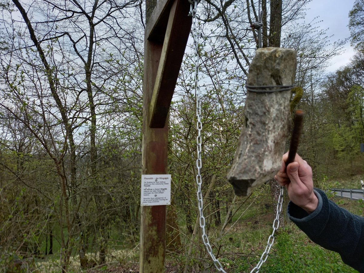 Ich kletterte aus dem Auto und wir gingen ein kleines Stück vom Auto weg zu einem Weg, der vom Parkplatz weg führte. Dort stand ein Klingstein, an dem der Herr Lebensabschnittsgefährte nach seiner musikalischen Ader suchte - ohne Erfolg.