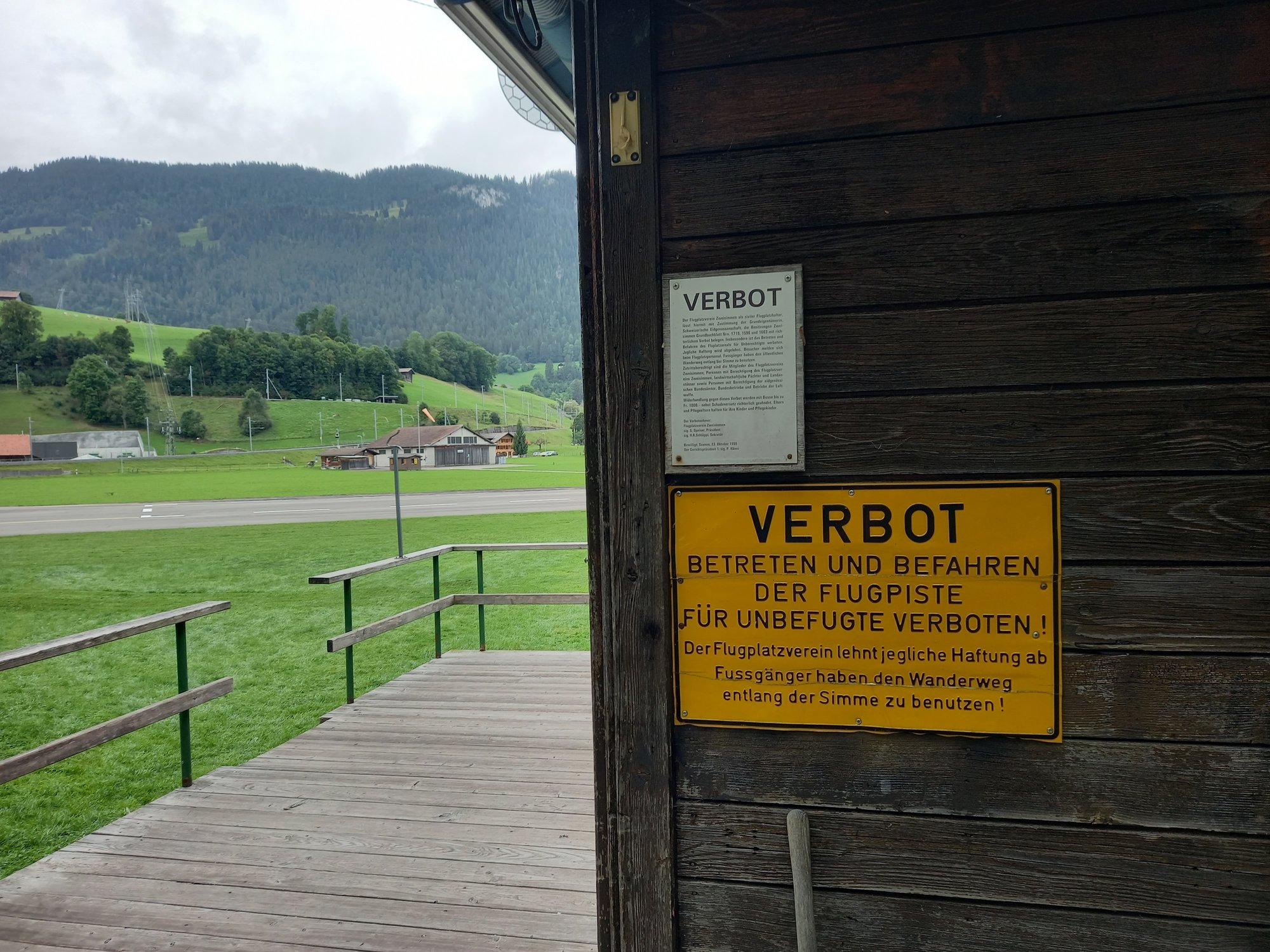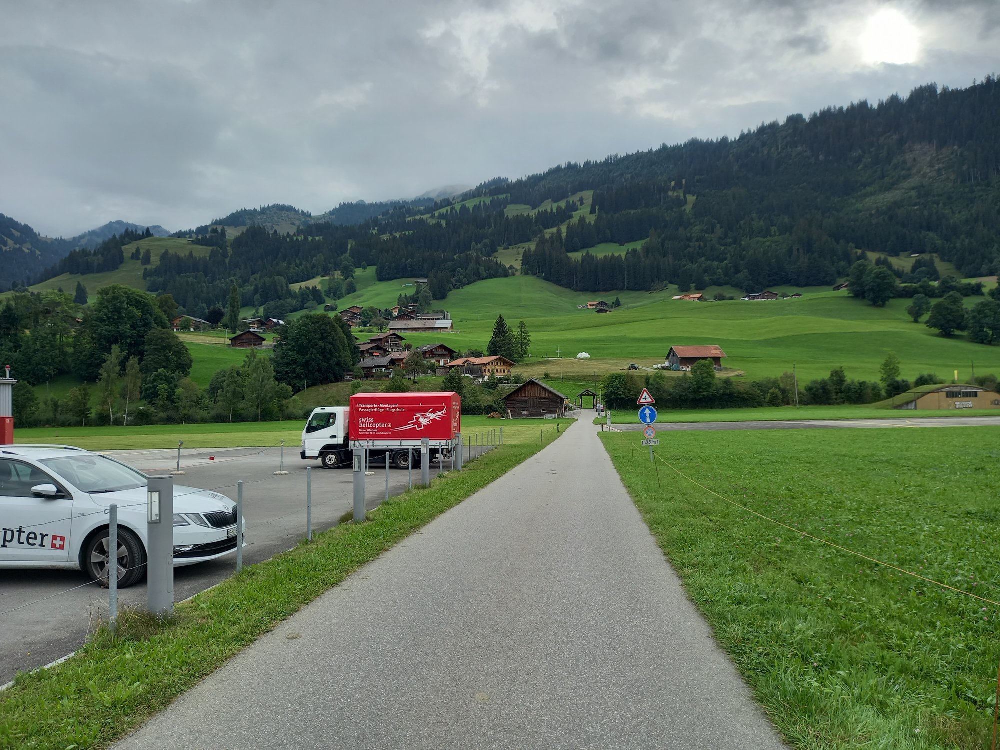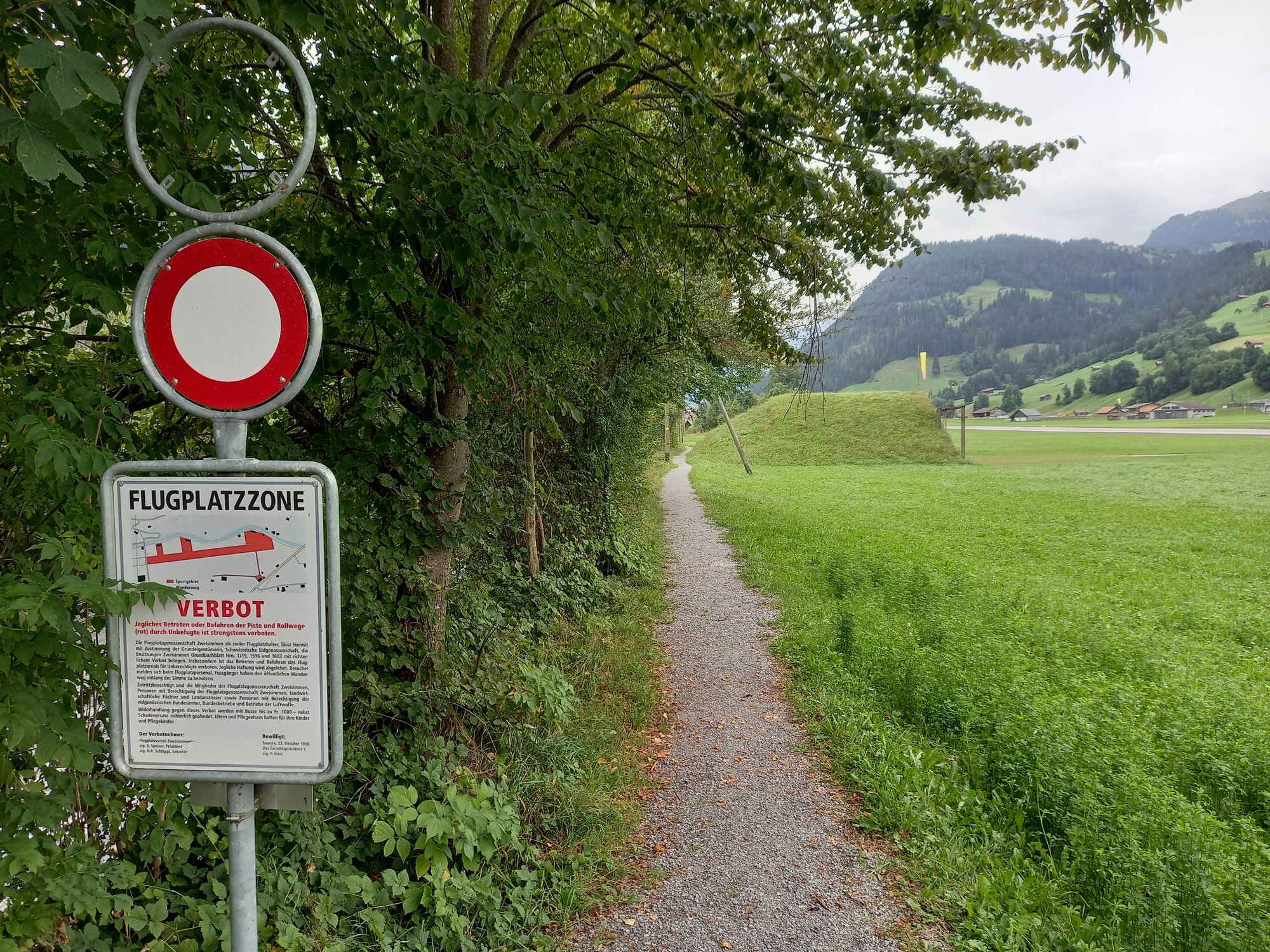 Wir laufen über die Straße am Heli-Port vorbei. Hubschrauber sind in den Bergen voll das Ding, man kommt überall schnell hin und kann überall landen und starten und so. Dann queren wir die Start- und Landebahn und laufen bis zum Ende des Flugplatzes. Bevor wir den Moosbach überqueren, geht ein schmaler Pfad am Bach entlang über das Flugplatzgelände. Das ist der offizieller Wanderweg.