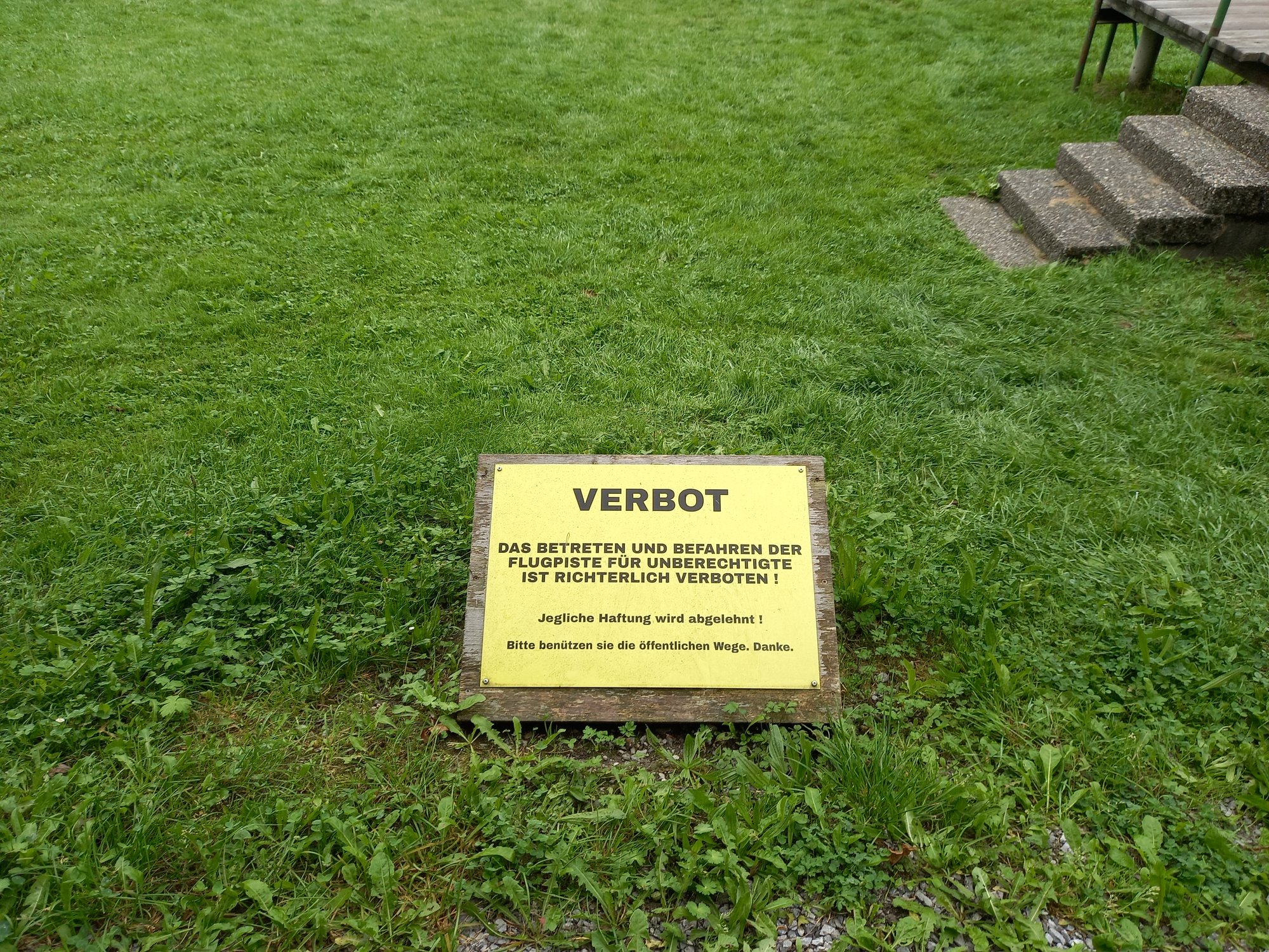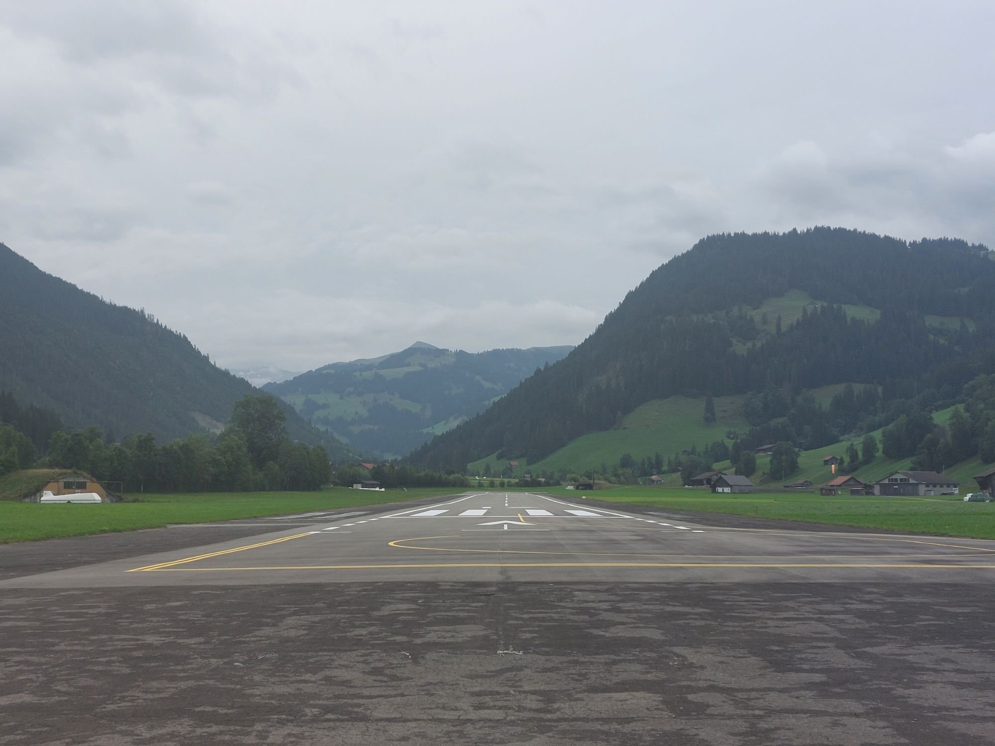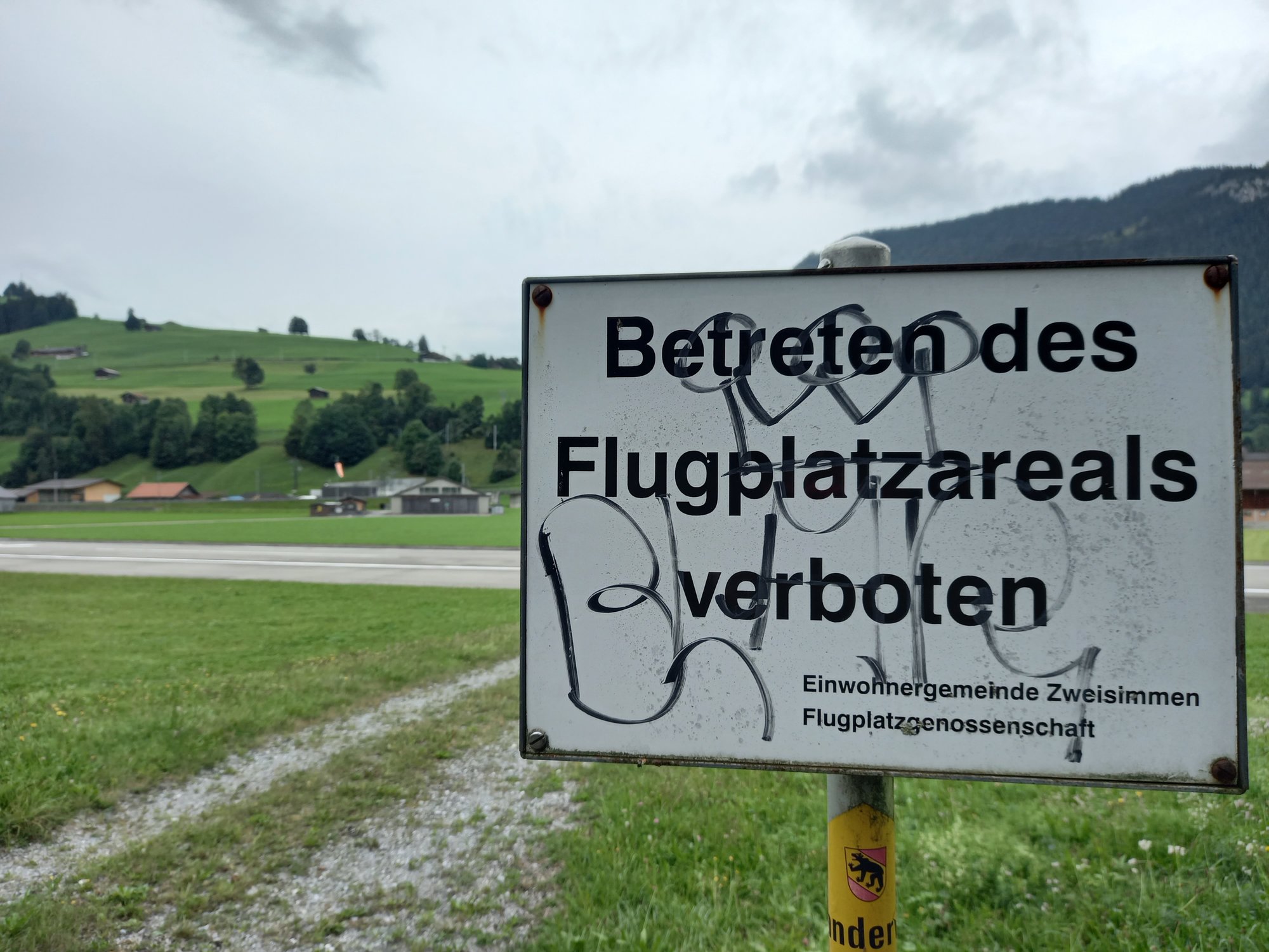 Wir laufen über die Straße am Heli-Port vorbei. Hubschrauber sind in den Bergen voll das Ding, man kommt überall schnell hin und kann überall landen und starten und so. Dann queren wir die Start- und Landebahn und laufen bis zum Ende des Flugplatzes. Bevor wir den Moosbach überqueren, geht ein schmaler Pfad am Bach entlang über das Flugplatzgelände. Das ist der offizieller Wanderweg.