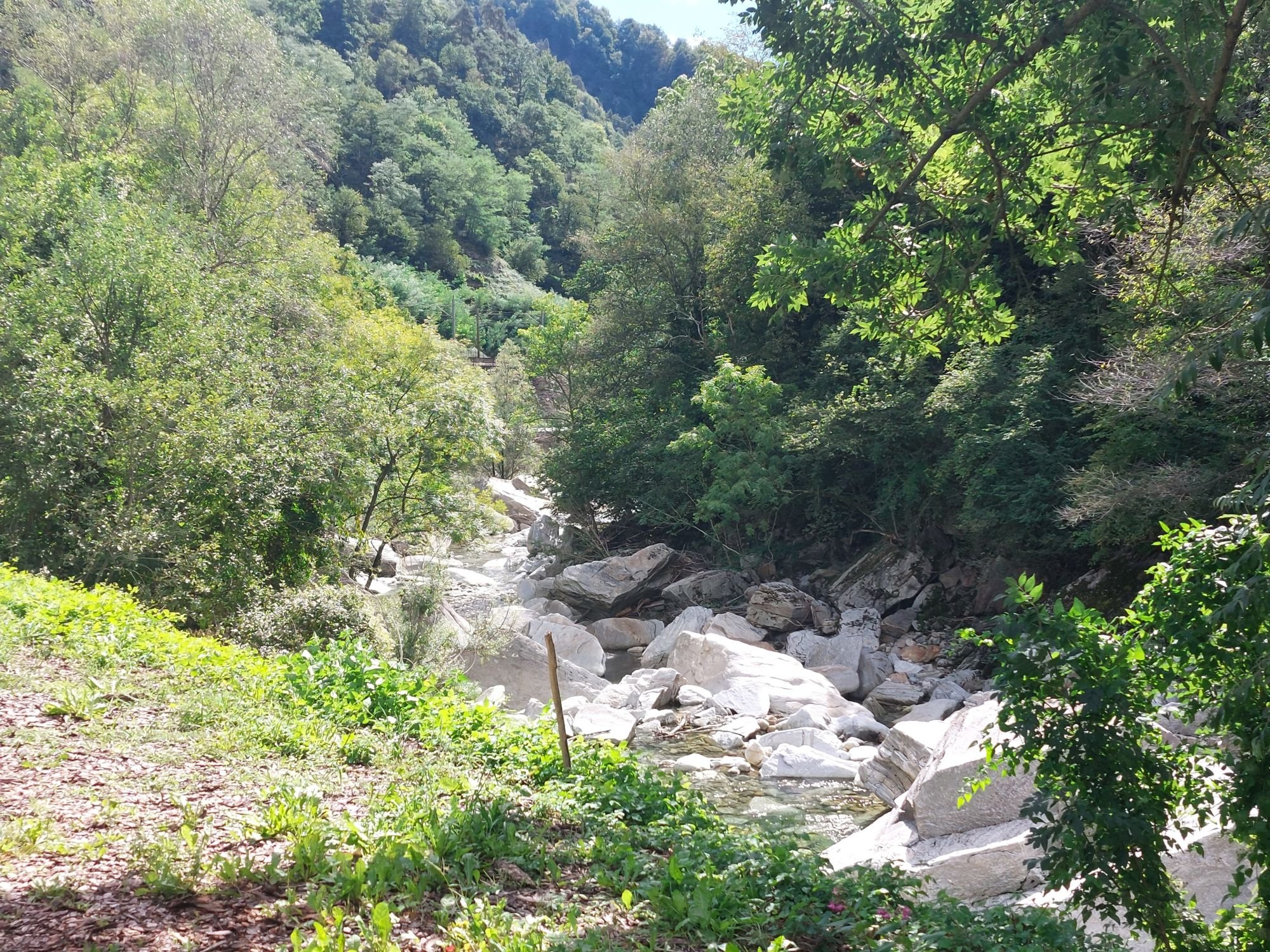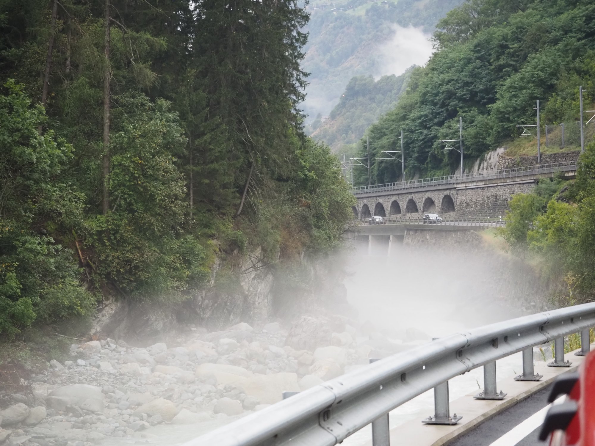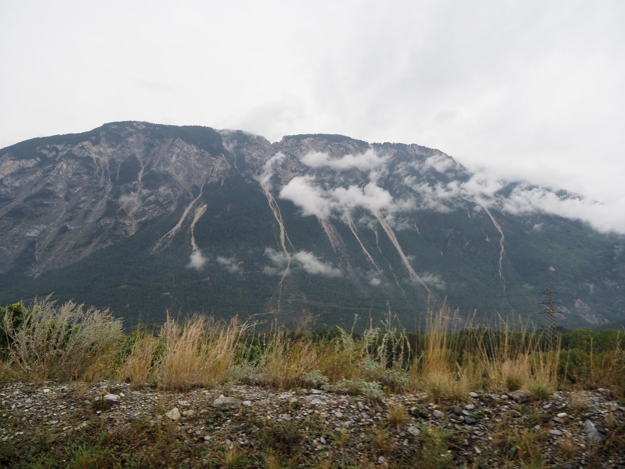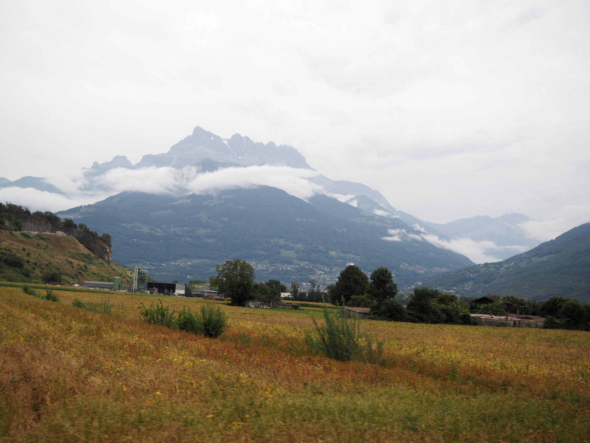 Unser Weg führt uns durchs Rhonetal. Das wäre sicherlich total toll, wenn es nicht komplett zugebaut und so wahnsinnig viel los wäre. Für die Mittagspause suchen wir ein ruhiges Plätzchen. Wir fahren bei Riddes ein Stück einen Berg hinauf und stellen uns in eine Parkbucht. Anschließend bleiben wir auf der Südseite der Rhone und fahren auf einer kleinen Nebenstraße immer am Fluss entlang. Hier sind wir zwar deutlich langsamer, aber dafür meist allein und viel gemütlicher unterwegs.