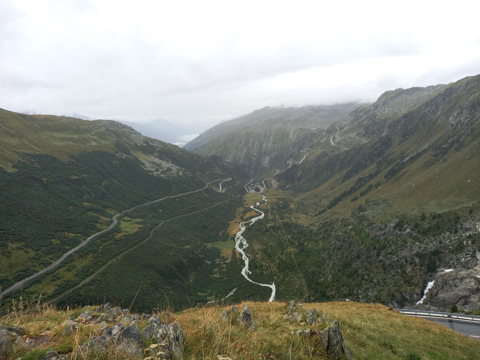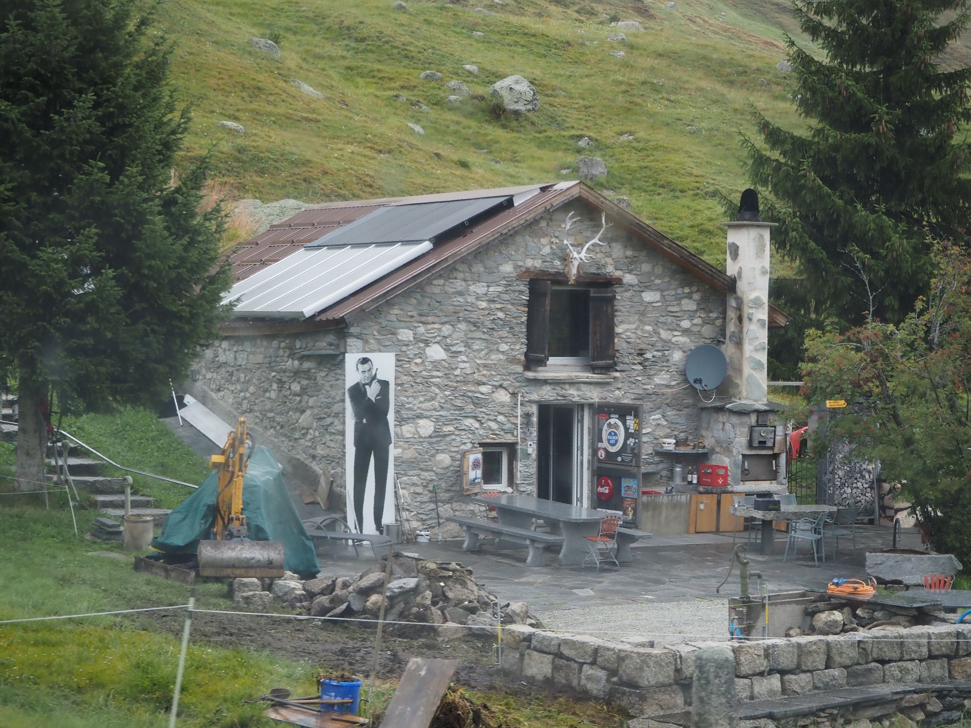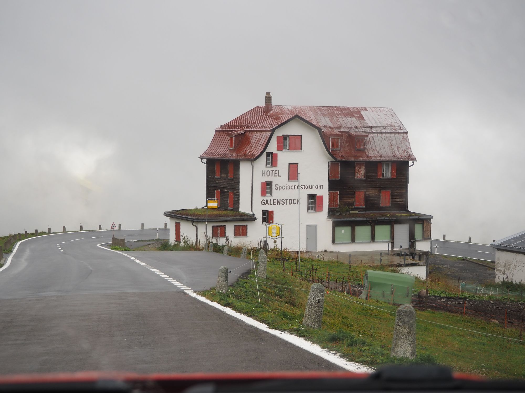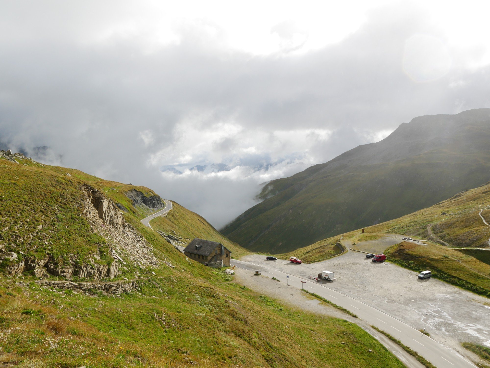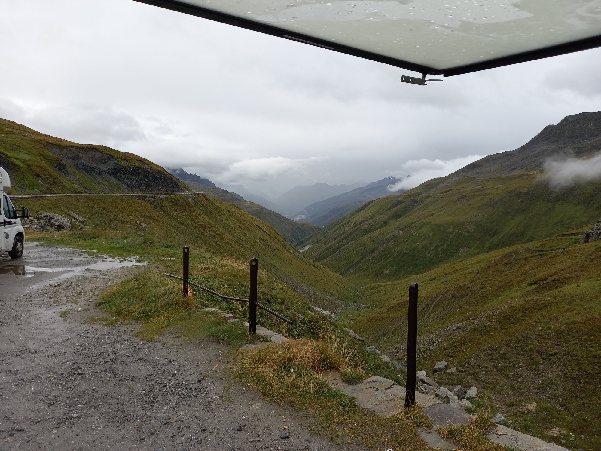 Die Aussicht aus dem Camper macht sich hingegen ganz gut. Auch wenn das zerlegte Geländer direkt neben uns nicht gerade vertrauenserweckend ist. Generell wirkt alles hier an dieser Passstraße ziemlich verlassen und verwarlost. Man bekommt ein wenig den Eindruck, die Glanzzeit der schweizer Alpen sei vorbei, zumindest die des zweithöchsten komplett in der Schweiz gelegenen Passes, der darüber hinaus eine Hauptrolle in einem James-Bond-Film gespielt hat.