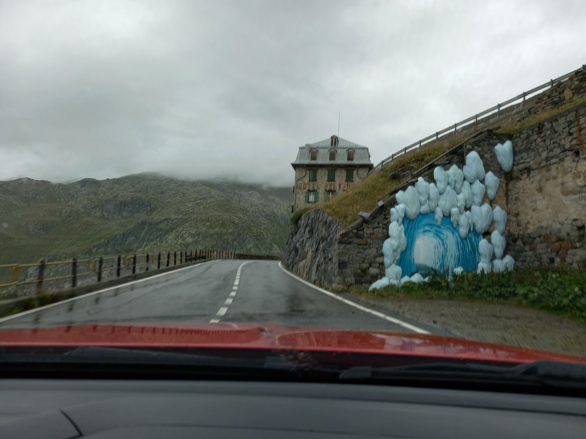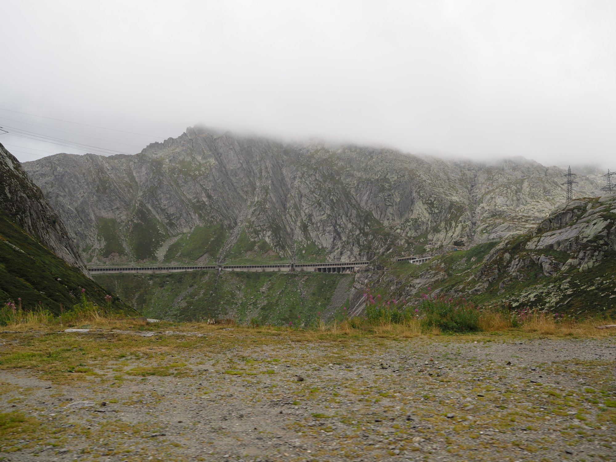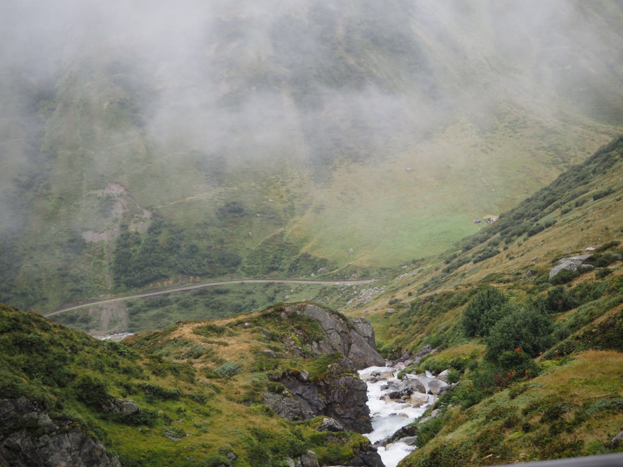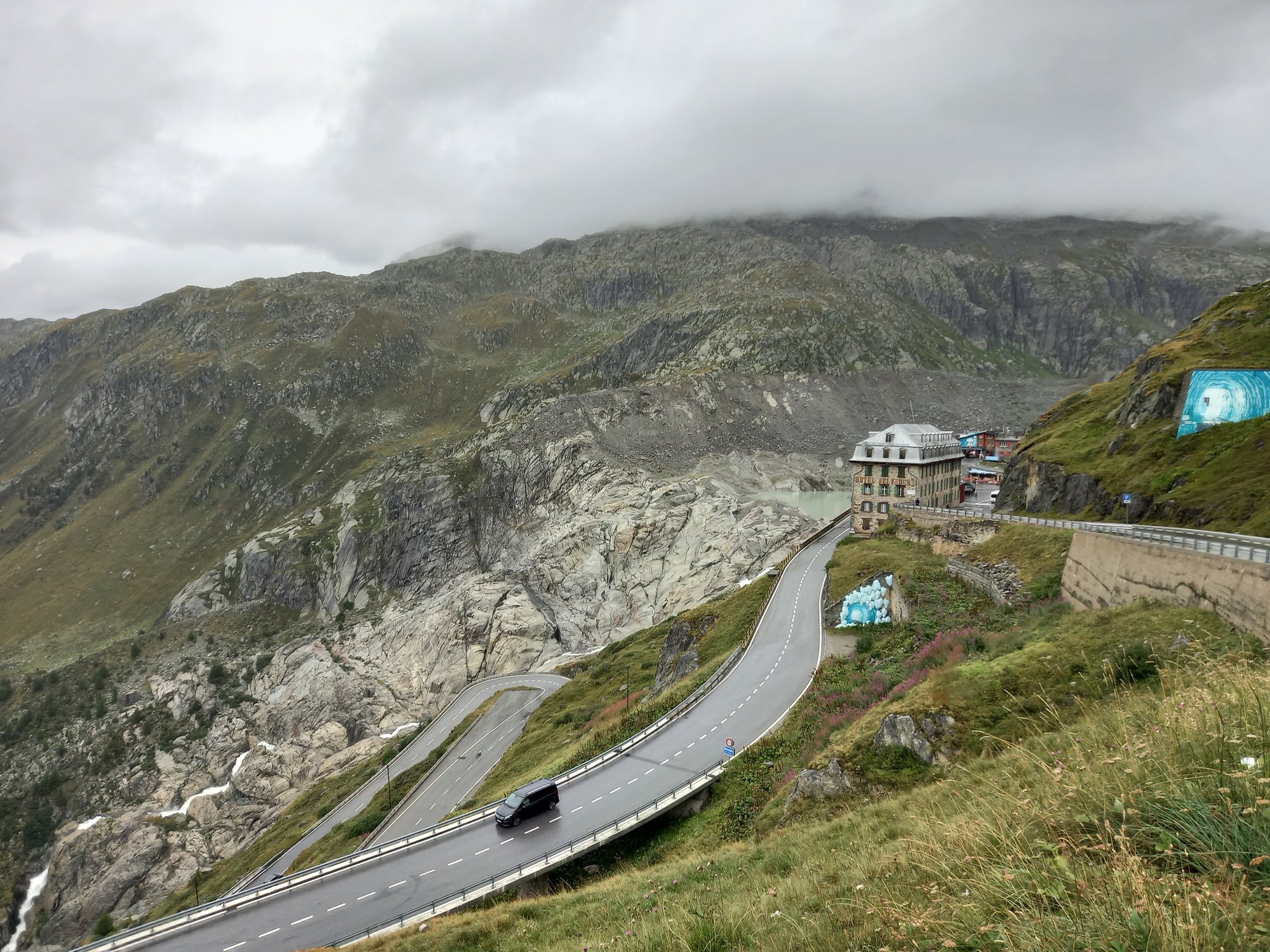 Die Aussicht aus dem Camper macht sich hingegen ganz gut. Auch wenn das zerlegte Geländer direkt neben uns nicht gerade vertrauenserweckend ist. Generell wirkt alles hier an dieser Passstraße ziemlich verlassen und verwarlost. Man bekommt ein wenig den Eindruck, die Glanzzeit der schweizer Alpen sei vorbei, zumindest die des zweithöchsten komplett in der Schweiz gelegenen Passes, der darüber hinaus eine Hauptrolle in einem James-Bond-Film gespielt hat.