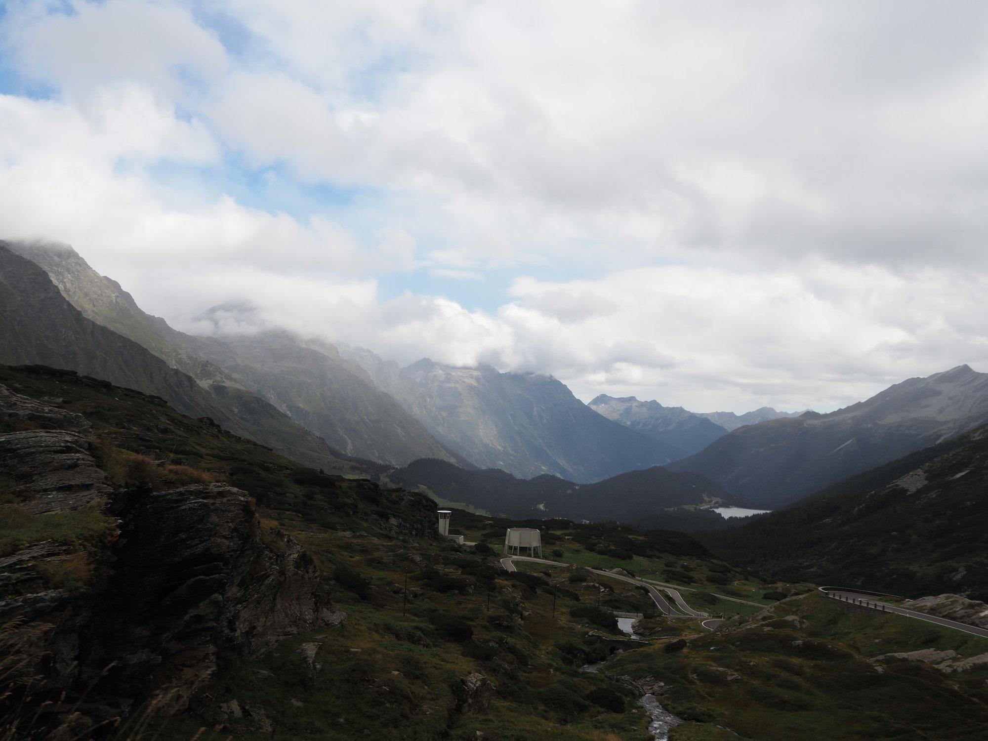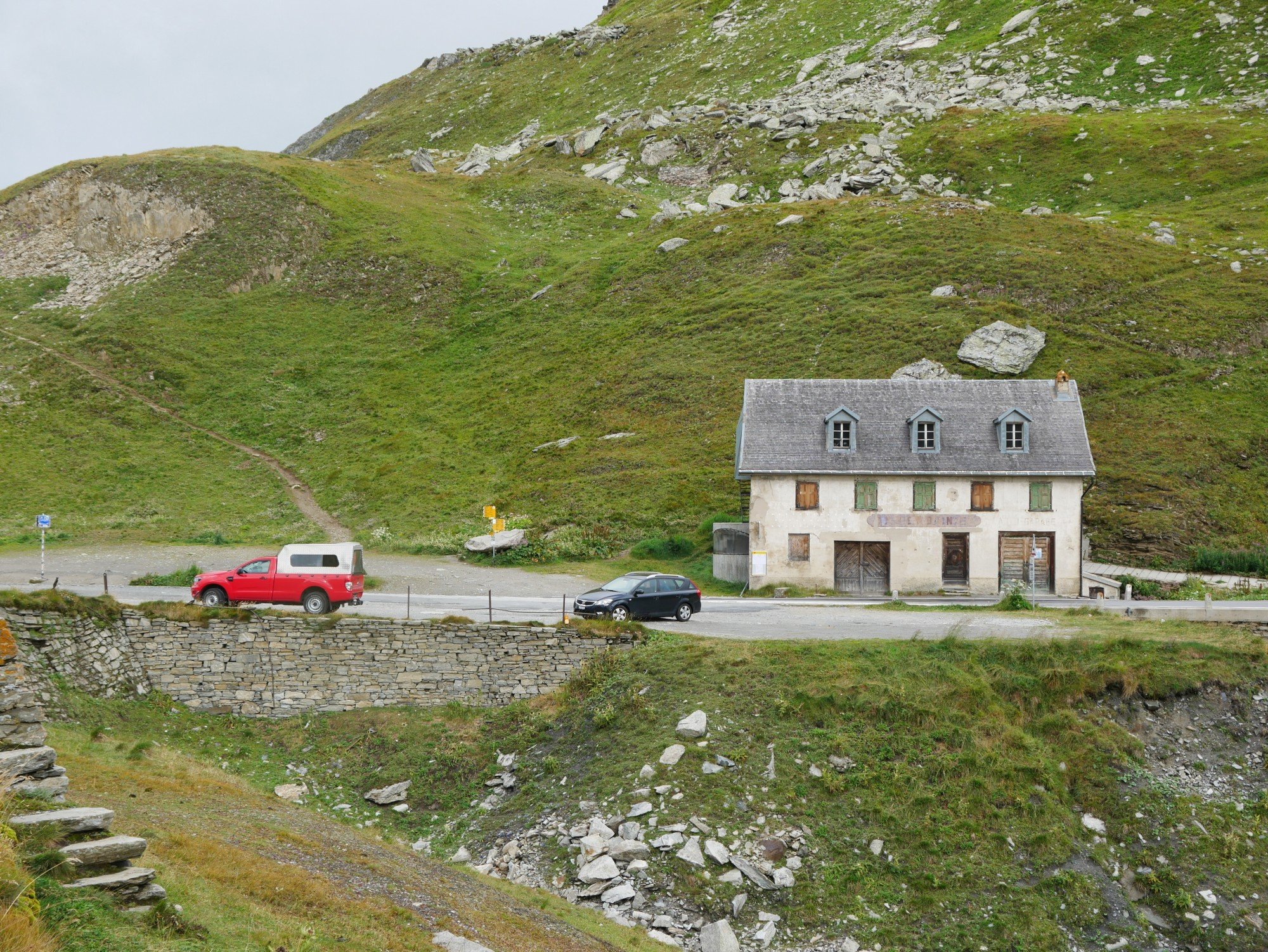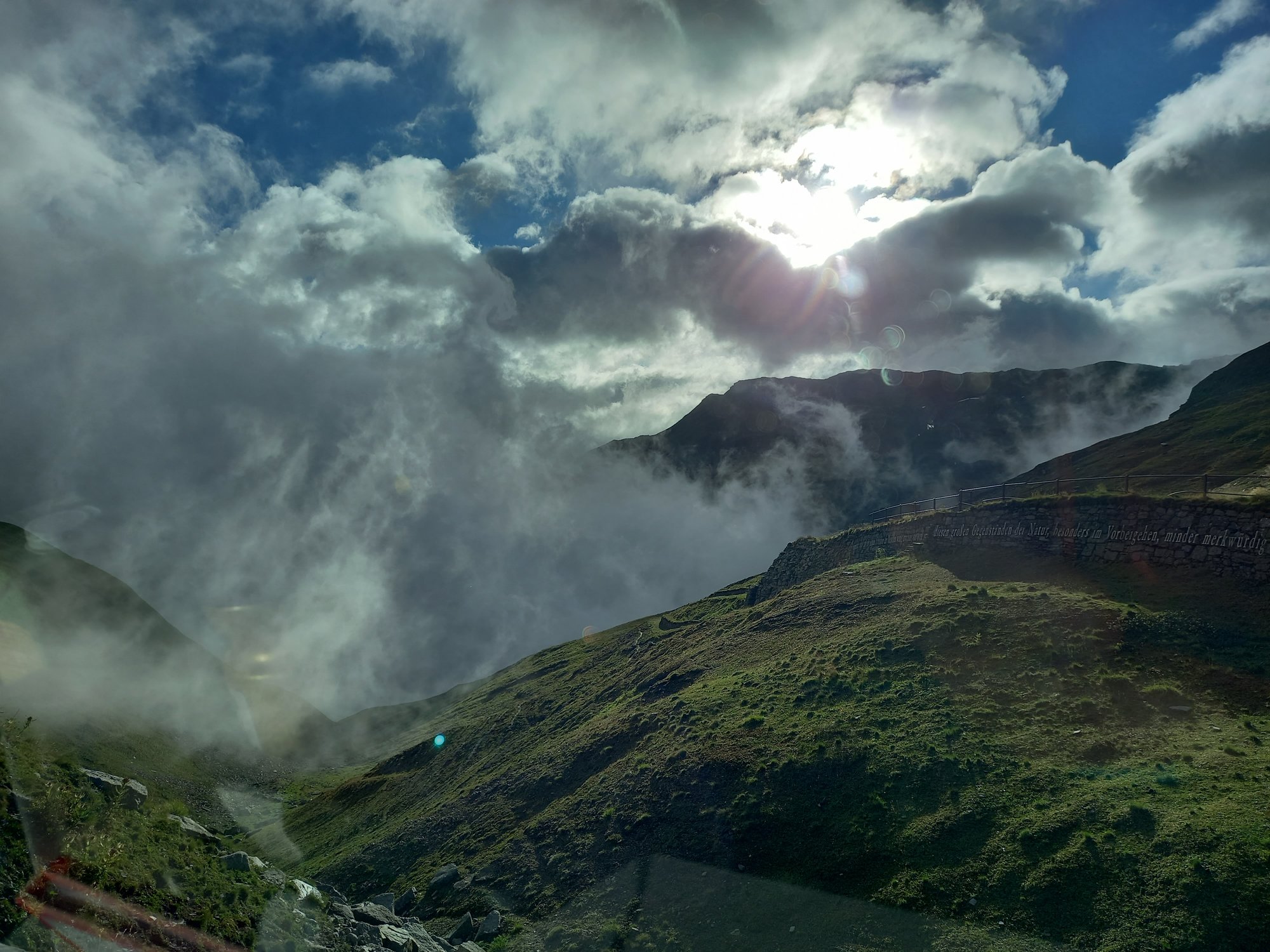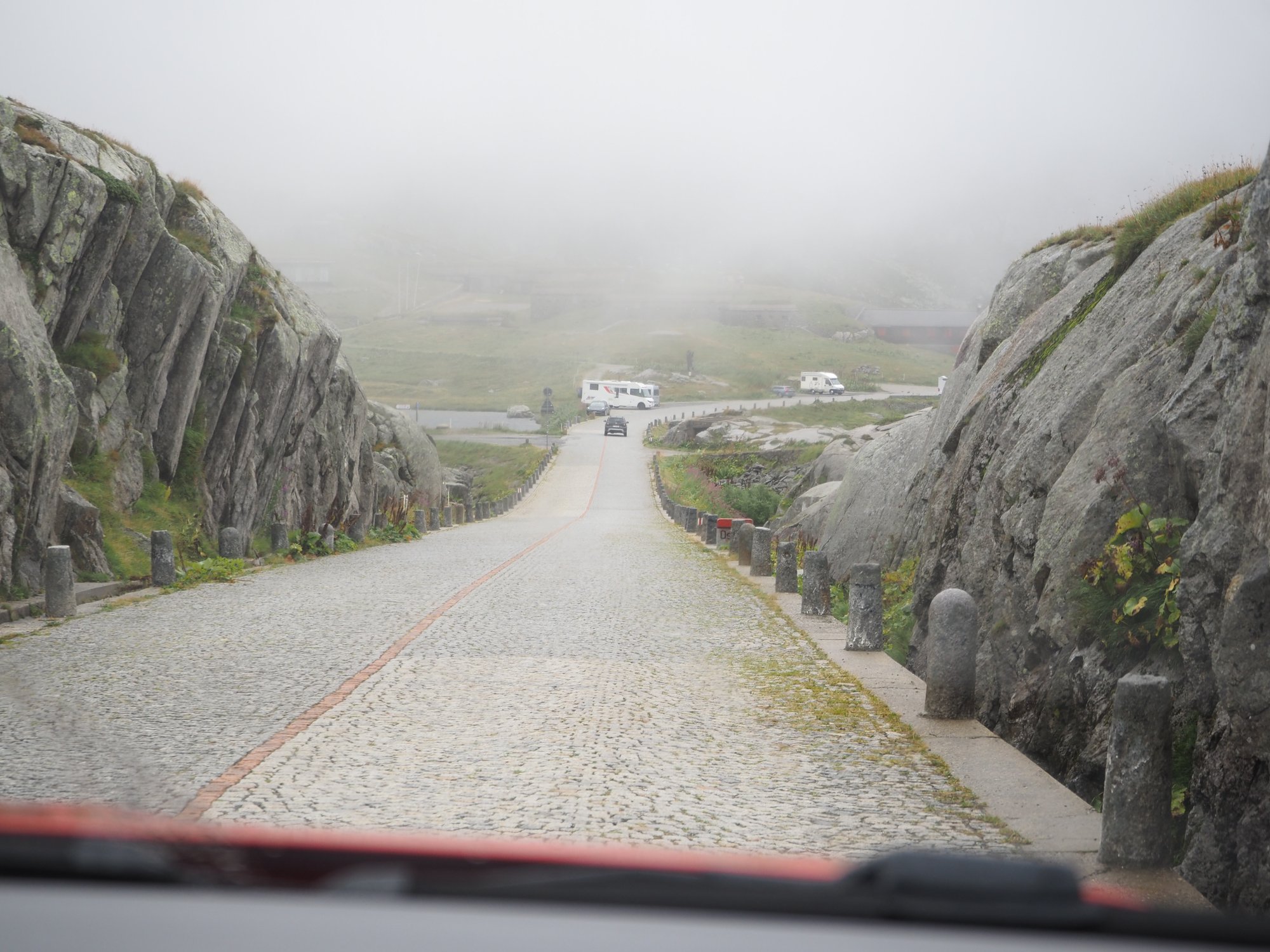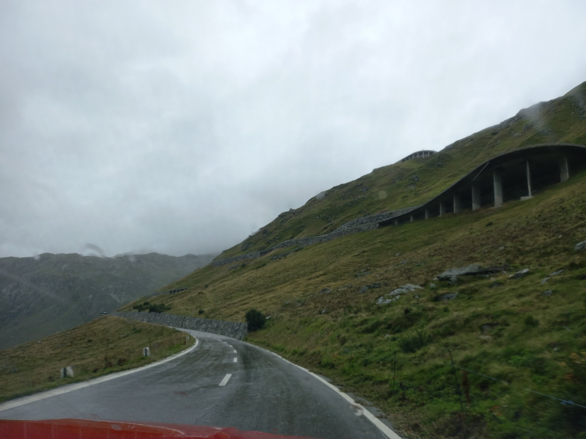 Die Aussicht aus dem Camper macht sich hingegen ganz gut. Auch wenn das zerlegte Geländer direkt neben uns nicht gerade vertrauenserweckend ist. Generell wirkt alles hier an dieser Passstraße ziemlich verlassen und verwarlost. Man bekommt ein wenig den Eindruck, die Glanzzeit der schweizer Alpen sei vorbei, zumindest die des zweithöchsten komplett in der Schweiz gelegenen Passes, der darüber hinaus eine Hauptrolle in einem James-Bond-Film gespielt hat.