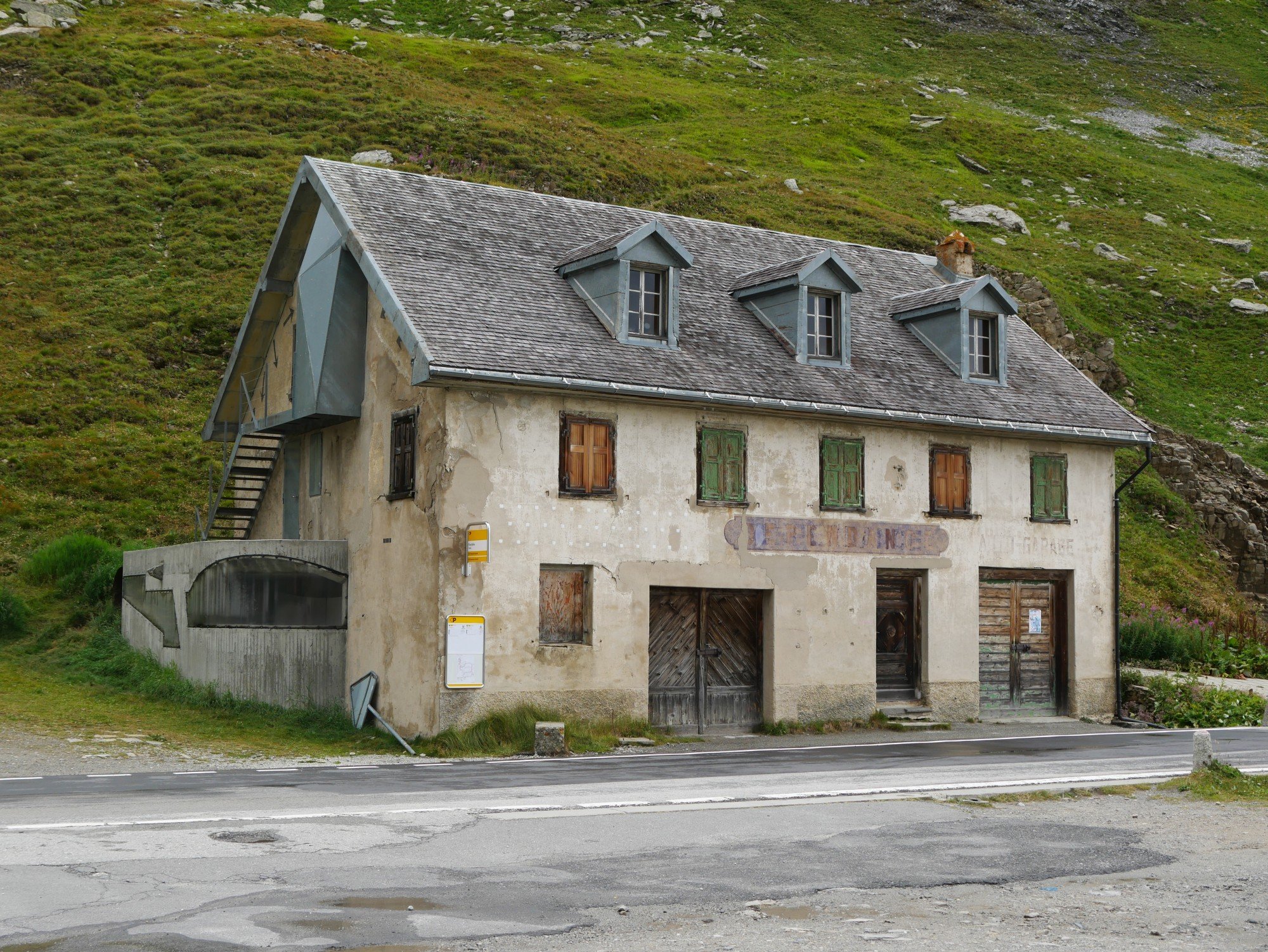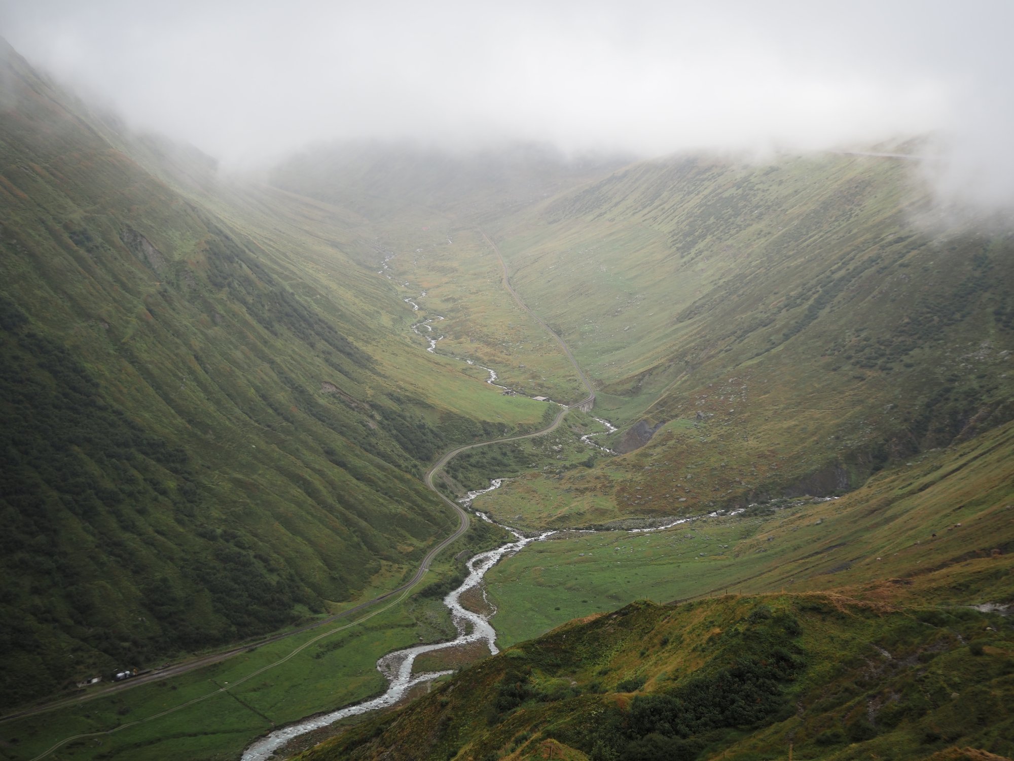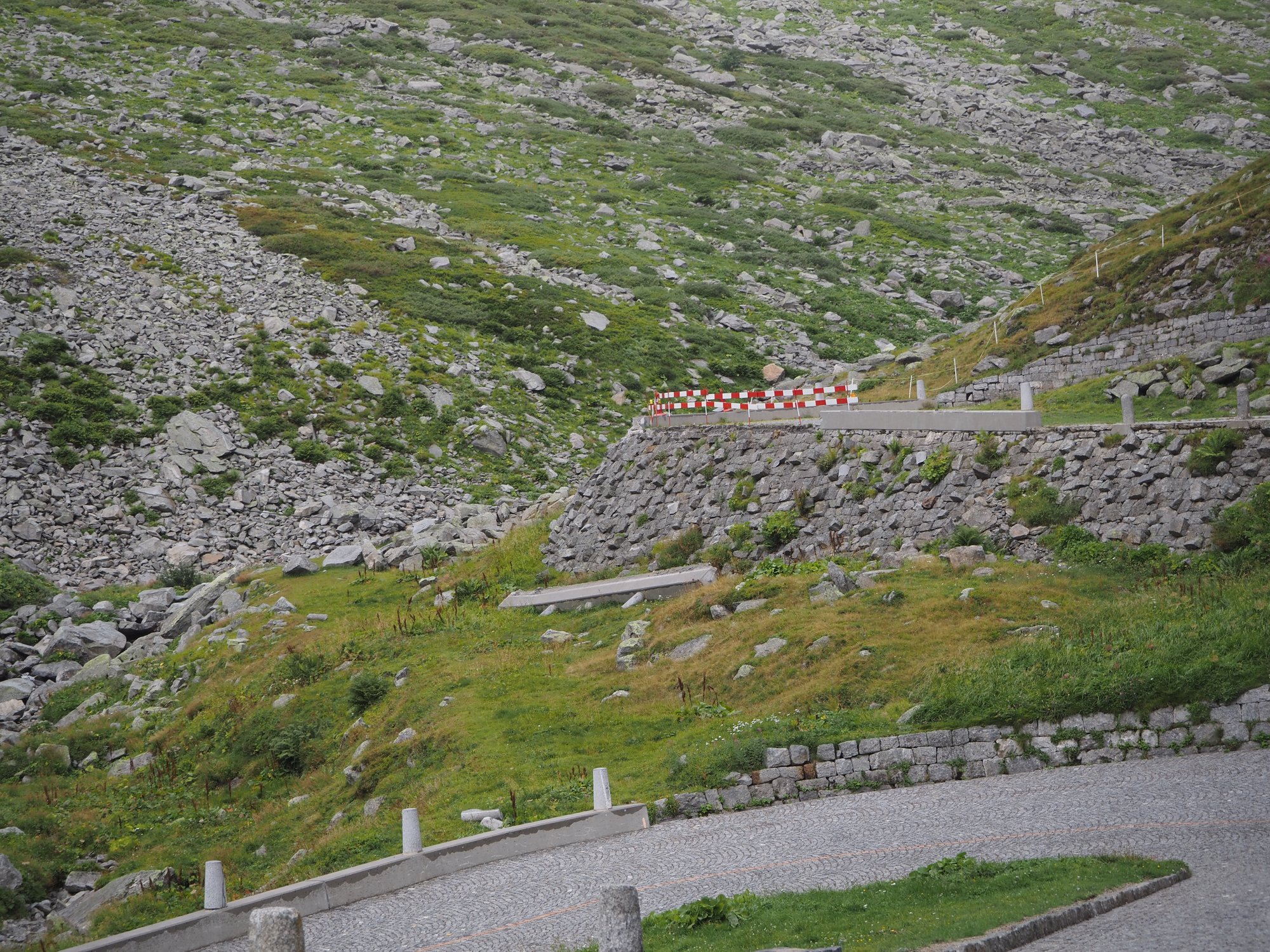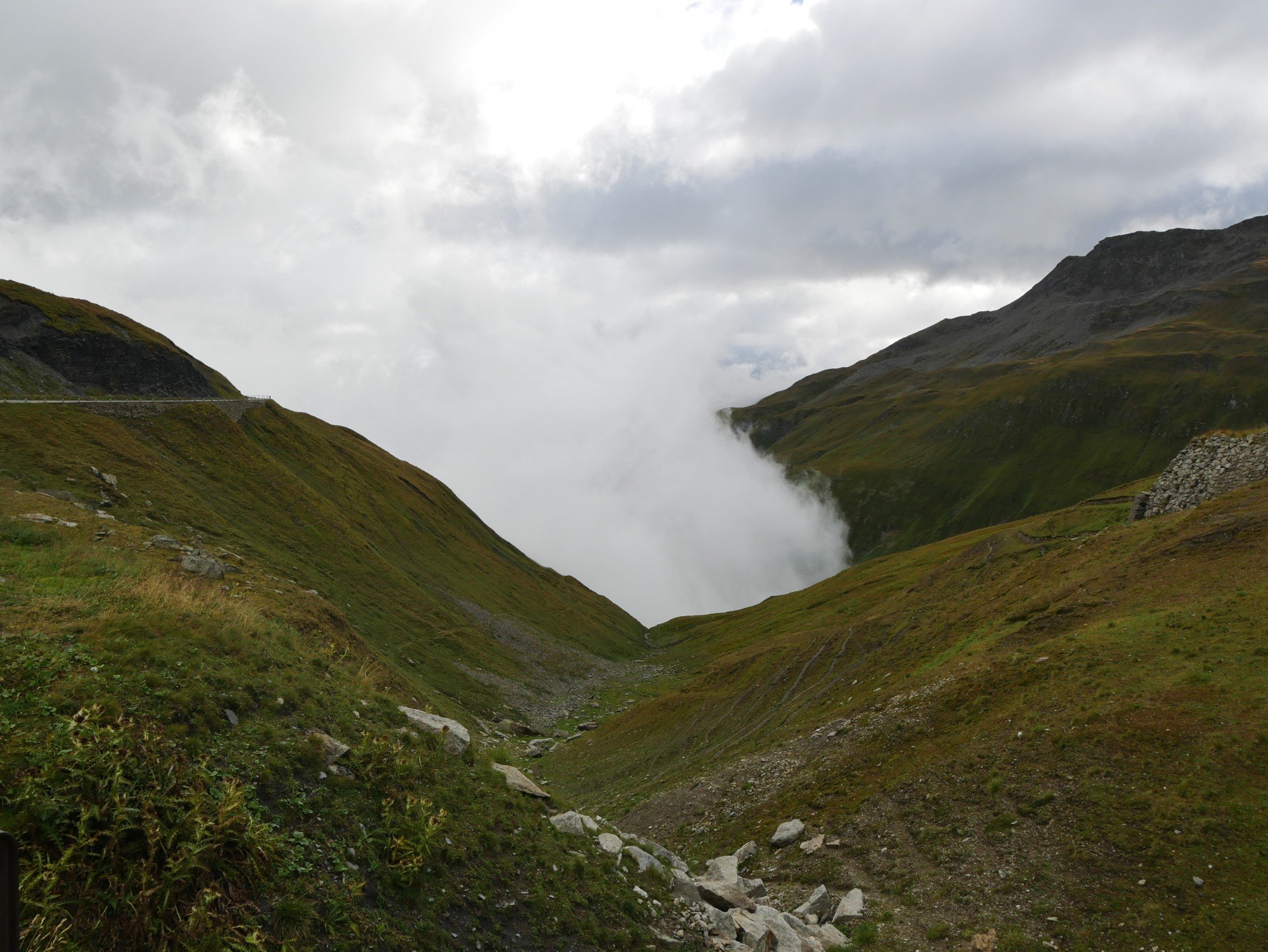 Die Aussicht aus dem Camper macht sich hingegen ganz gut. Auch wenn das zerlegte Geländer direkt neben uns nicht gerade vertrauenserweckend ist. Generell wirkt alles hier an dieser Passstraße ziemlich verlassen und verwarlost. Man bekommt ein wenig den Eindruck, die Glanzzeit der schweizer Alpen sei vorbei, zumindest die des zweithöchsten komplett in der Schweiz gelegenen Passes, der darüber hinaus eine Hauptrolle in einem James-Bond-Film gespielt hat.