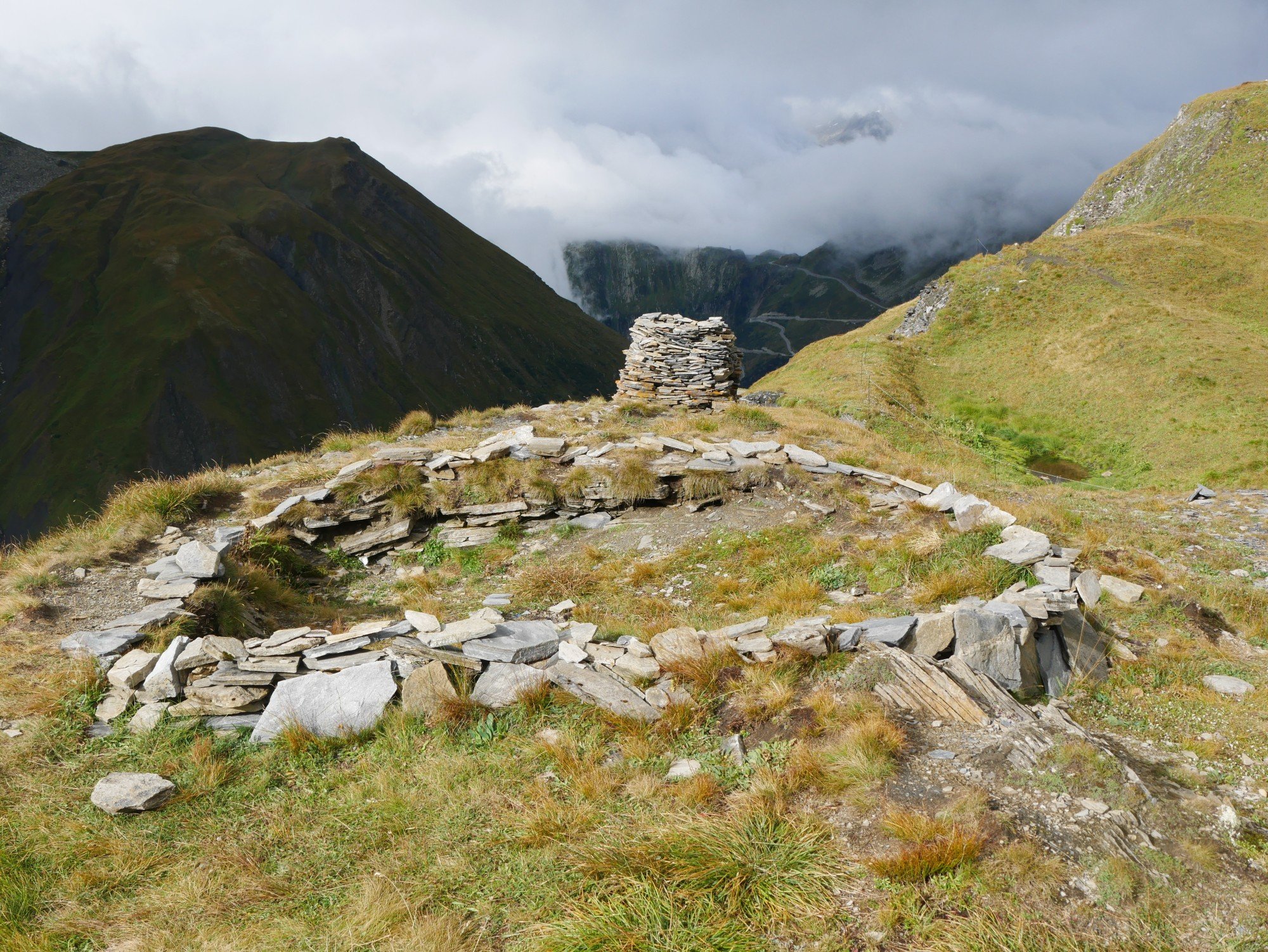 Leider ist das Wetter zu schlecht, vor allem zu windig, um die Drohne zu fliegen. Wir fahren daher weiter zum Parkplatz am Pass, wo wir die Nacht verbringen wollen.