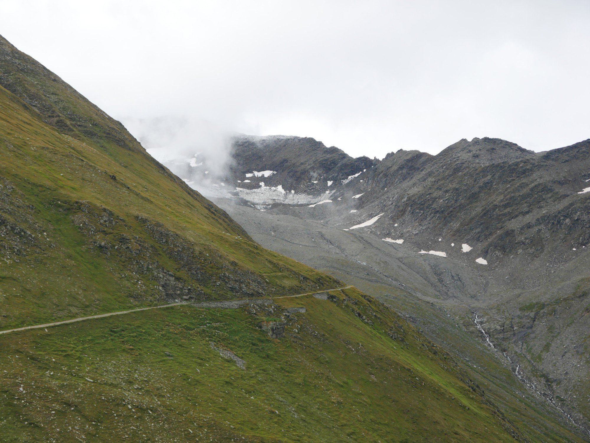 Oberhalb vom Hotel Belvédère legten wir einen Knipsstopp ein. In den 80er Jahren ging der Rhonegletscher übrigens noch direkt am Hotel vorbei und weiter runter, vor 150 Jahren bis nach Gletsch. Heute ist ein Teil des Gletschers abgedeckt, damit touristische Führungen in der Gletscherhöhle auch weiterhin stattfinden können. Selbst der Fußweg vom Hotelparkplatz zur Gletscherzunge ist kostenpflichtig.