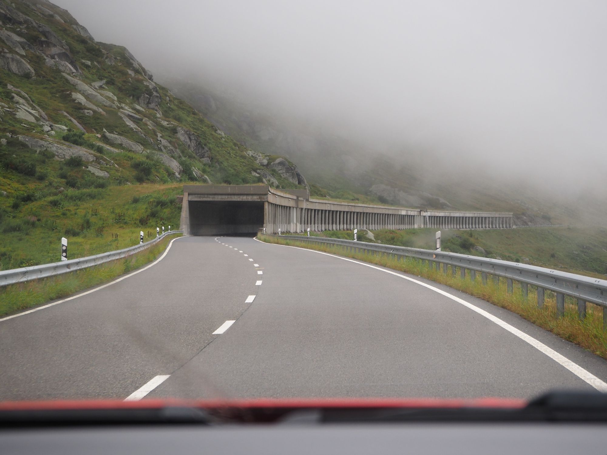 Eigentlich hatten wir überlegt, noch einmal auf dem teuren Campingplatz zu übernachten, auf dem wir unsere erste Nacht in der Schweiz verbracht haben. Jetzt stellt sich die Situation aber ein wenig anders dar. Da wir nun schon für die Autobahn bezahlt haben, können wir sie auch noch ein wenig nutzen. Wir haben nämlich keine Lust mehr und das Wetter ist immer noch mistig. Also fahren wir zurück durch den Tunnel und dann weiter auf der Autobahn Richtung Norden.
