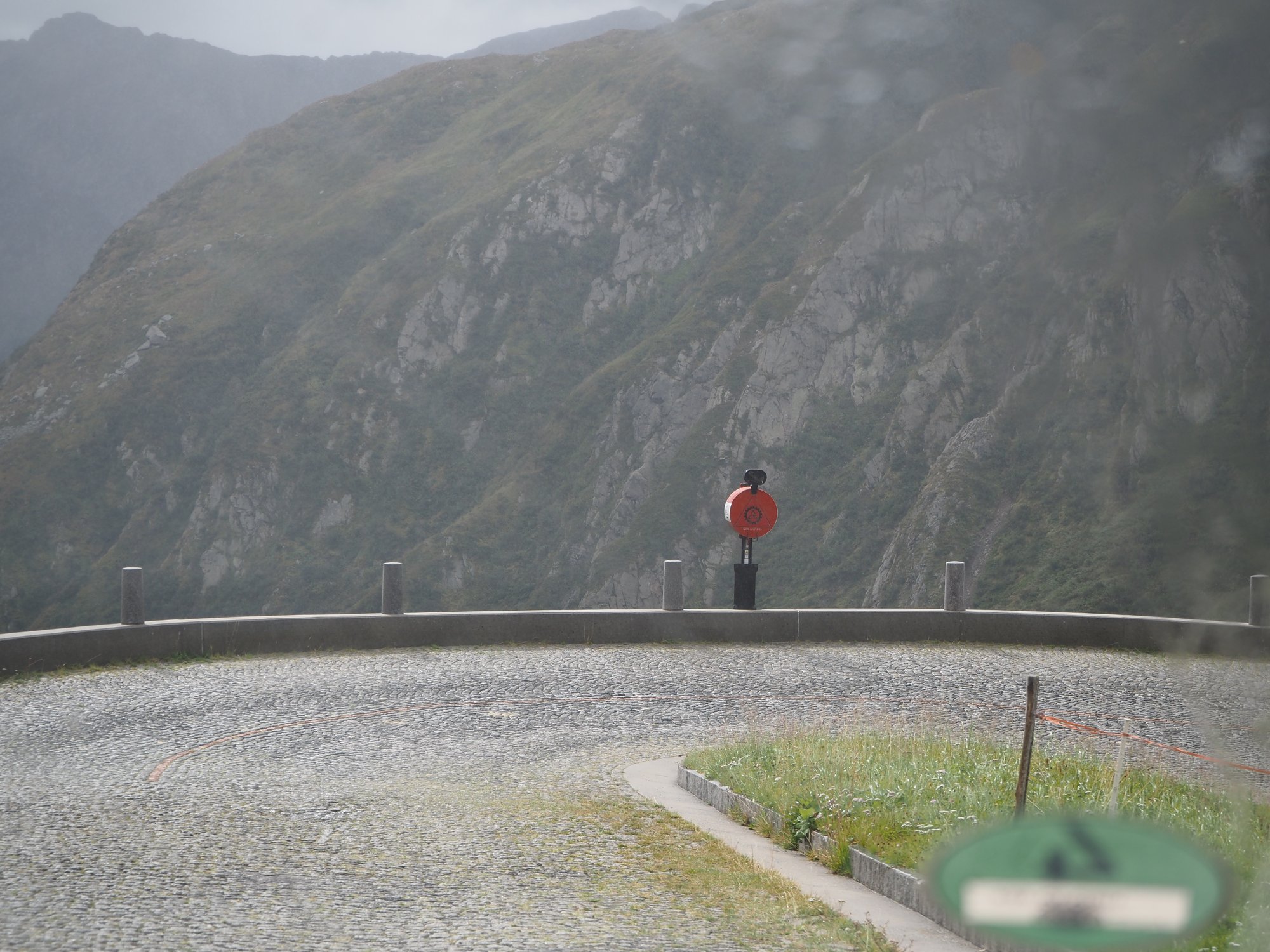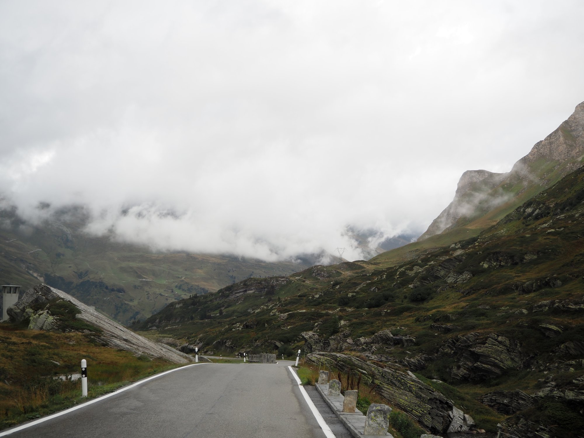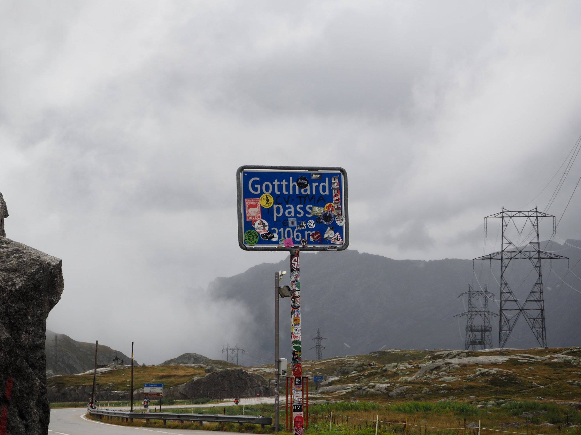 Besonders schön ist es dort oben nicht. Es ist laut durch den Verkehr, alles steht voller Strommasten und Windräder und das Wetter ist auch mistig. Nachdem ich das Pass-Schild geknipst und gefilmt habe entdecken wir eher zufällig die alte Passstraße, die Tremola. Kurzentschlossen fahren wir die.