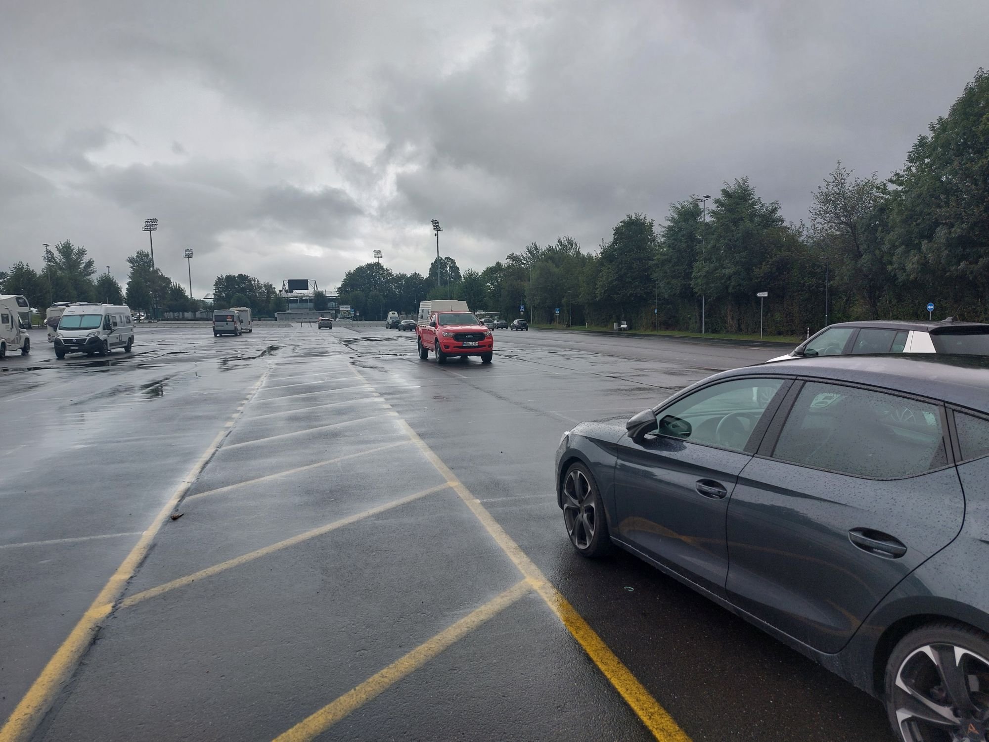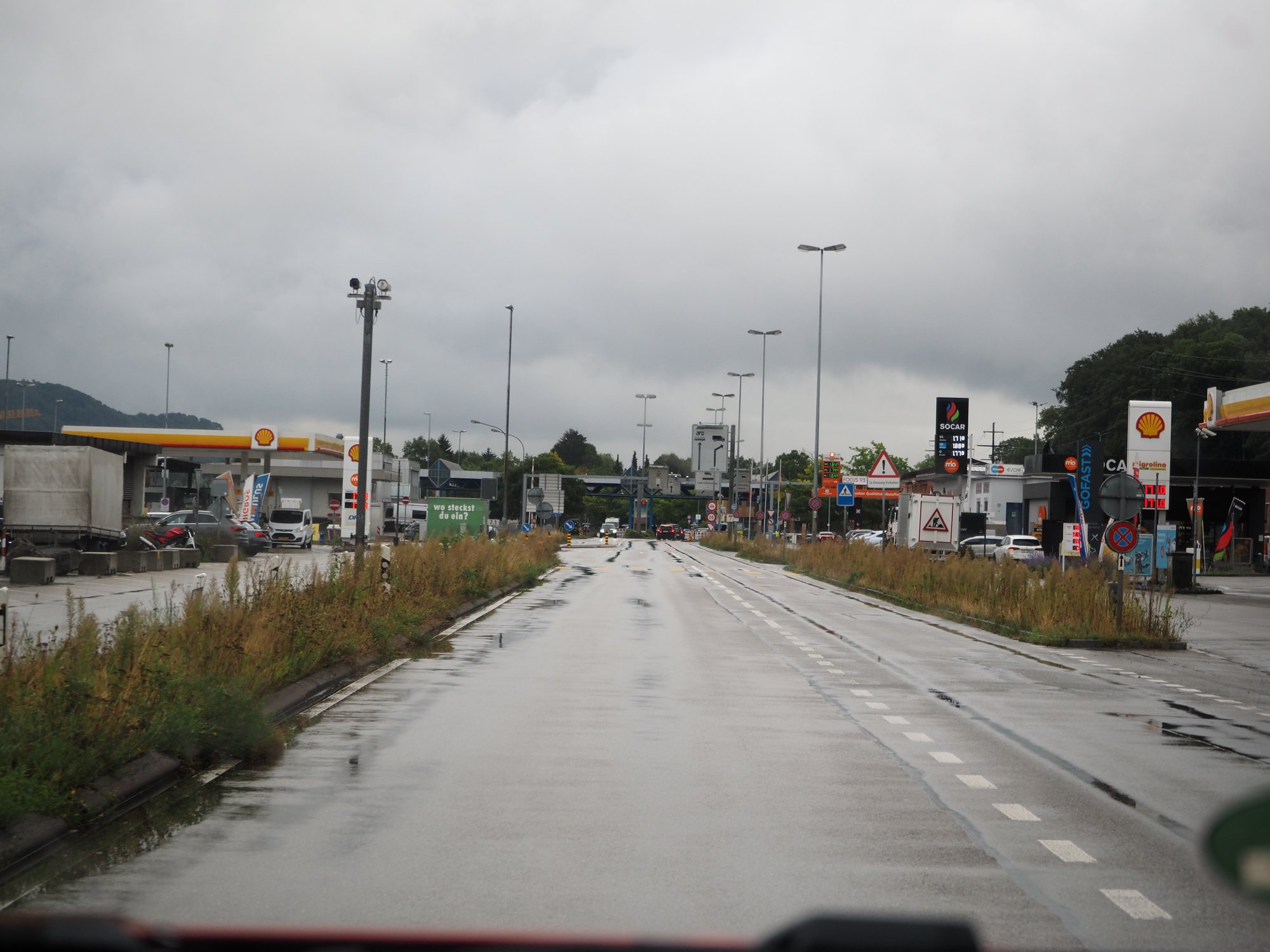 Der Himmel weint, weil wir die Schweiz verlassen. Wir nehmen die Autobahn, bezahlt haben wir ja, und fahren westlich am Bodensee vorbei. Damit sich unsere hektisch gekaufte Vignette lohnt, fahren wir auch noch einen Umweg über Winterthur und Schaffhausen, wir haben nämlich eine Abfahrt verpasst. Ich - als Navigator - hatte nämlich erst einen Kaffee, wir mussten heute Morgen ja so hektisch aufbrechen. Auf dem ersten Parkplatz beseitigen wir diesen Mangel.
