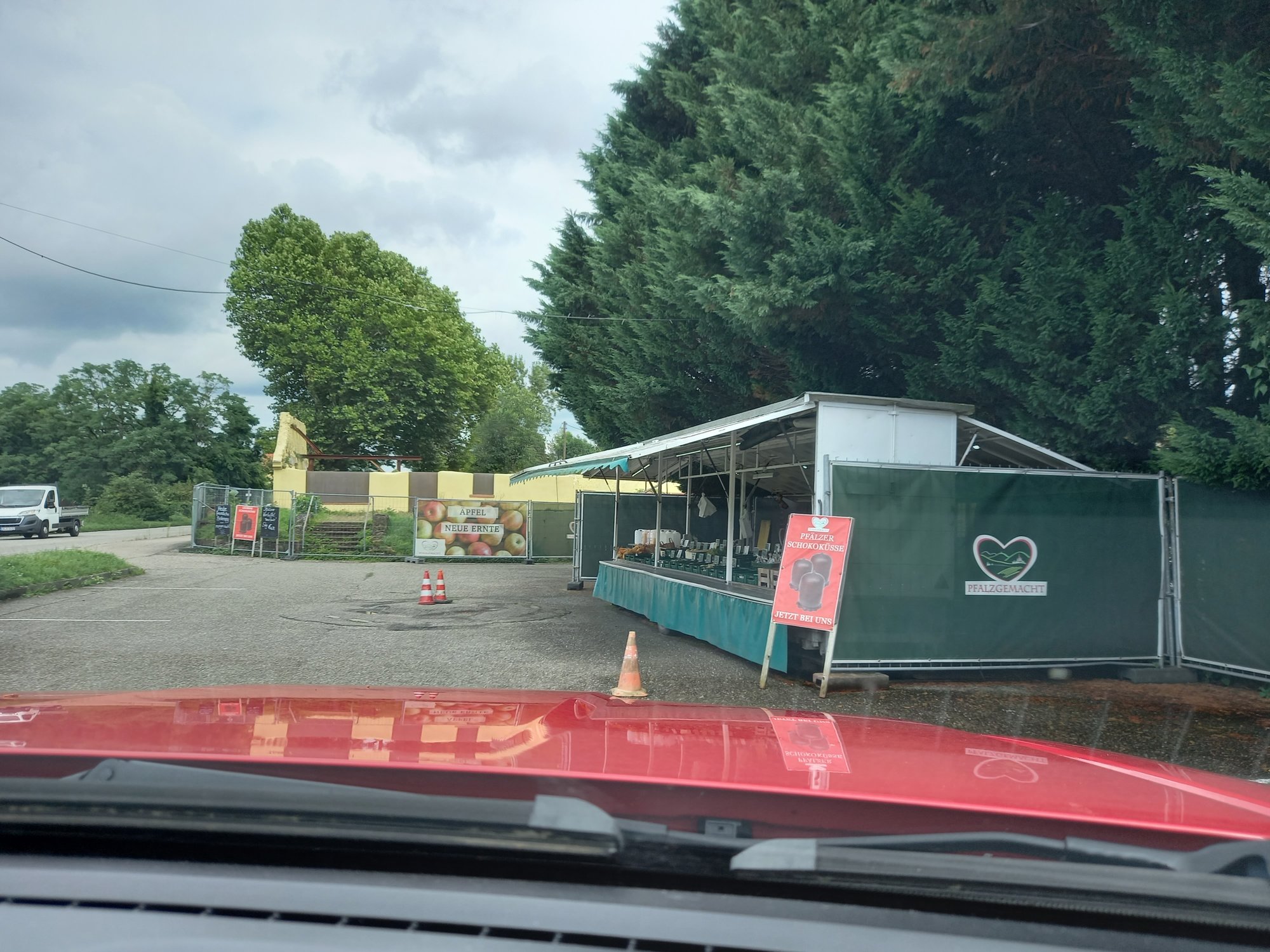 An der L 560 zwischen Graben-Neudorf und Wiesental, ich glaube, wir hatten keine Lust mehr auf Autobahn, entdecke ich am Straßenrand einen Obst- und Gemüsestand, der auf seiner Tafel mit Schokoküssen wirbt. Ich will Schokoküsse!