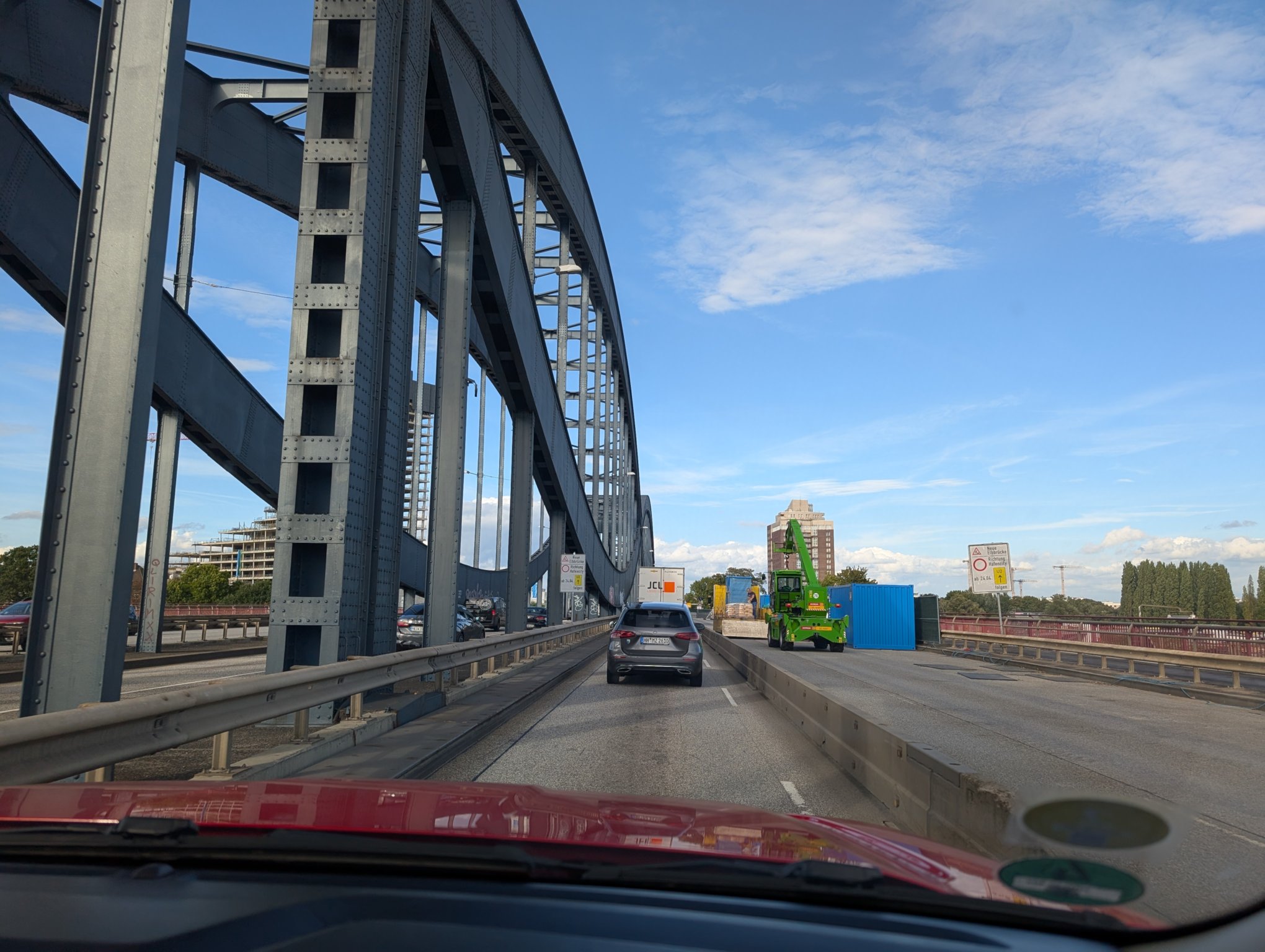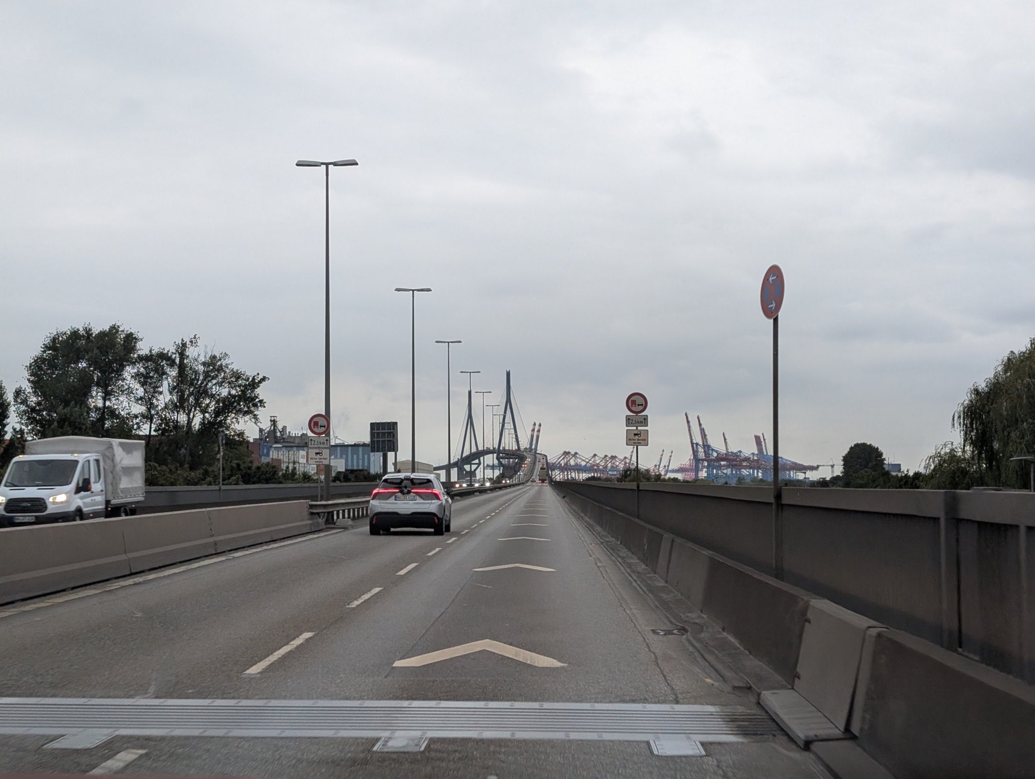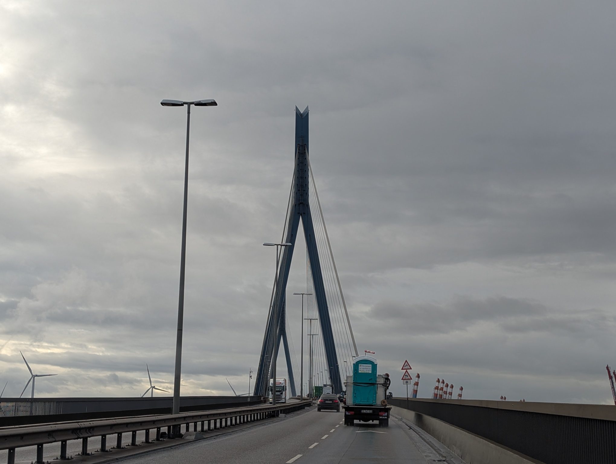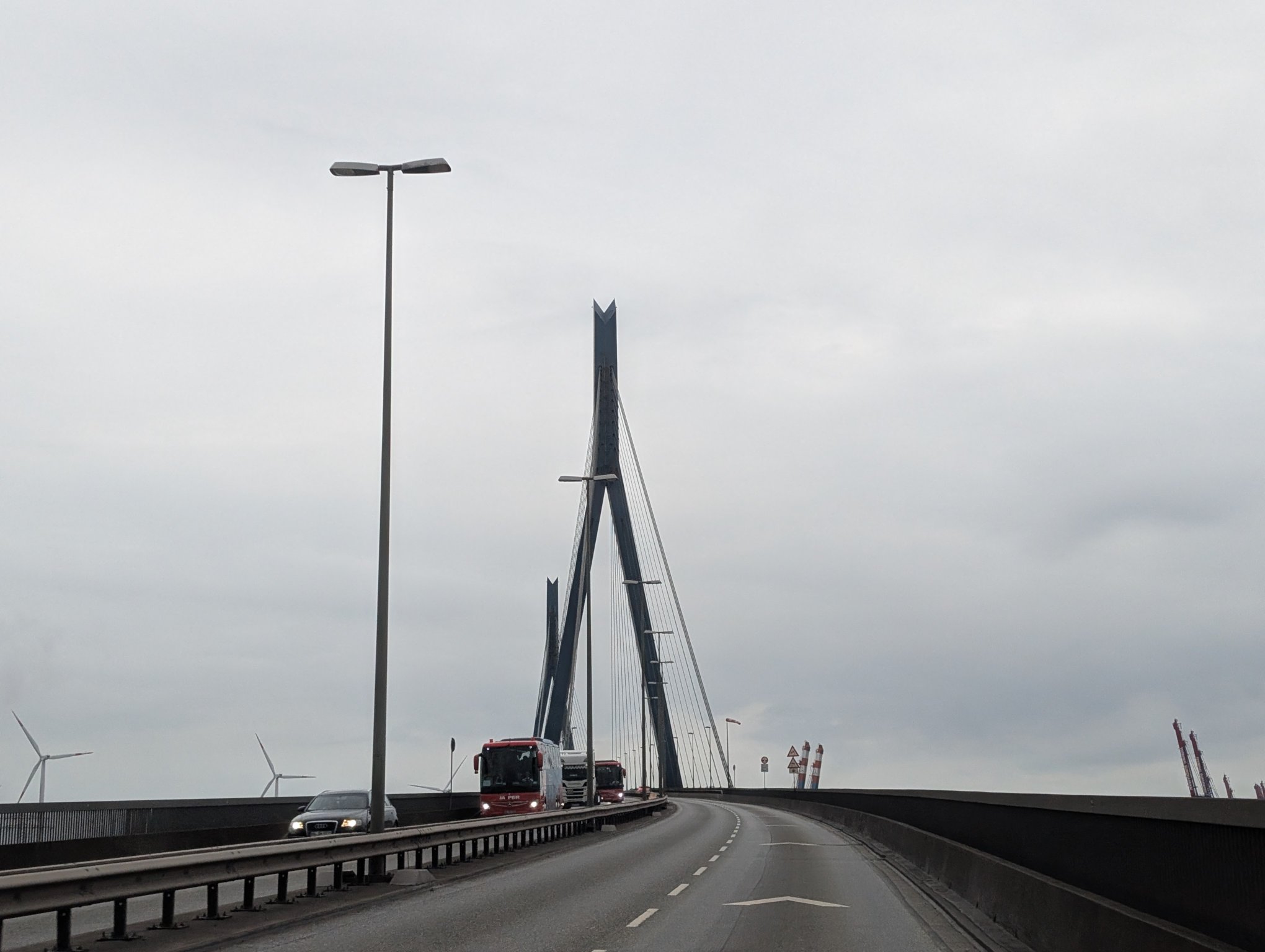 Wir müssen durch Hamburg fahren, was zu Zeiten von Feierabendverkehr schonmal etwas länger dauern kann. Aber dafür fahren wir über die Köhlbrandbrücke, was ich persönlich durchaus ein Highlight finde.