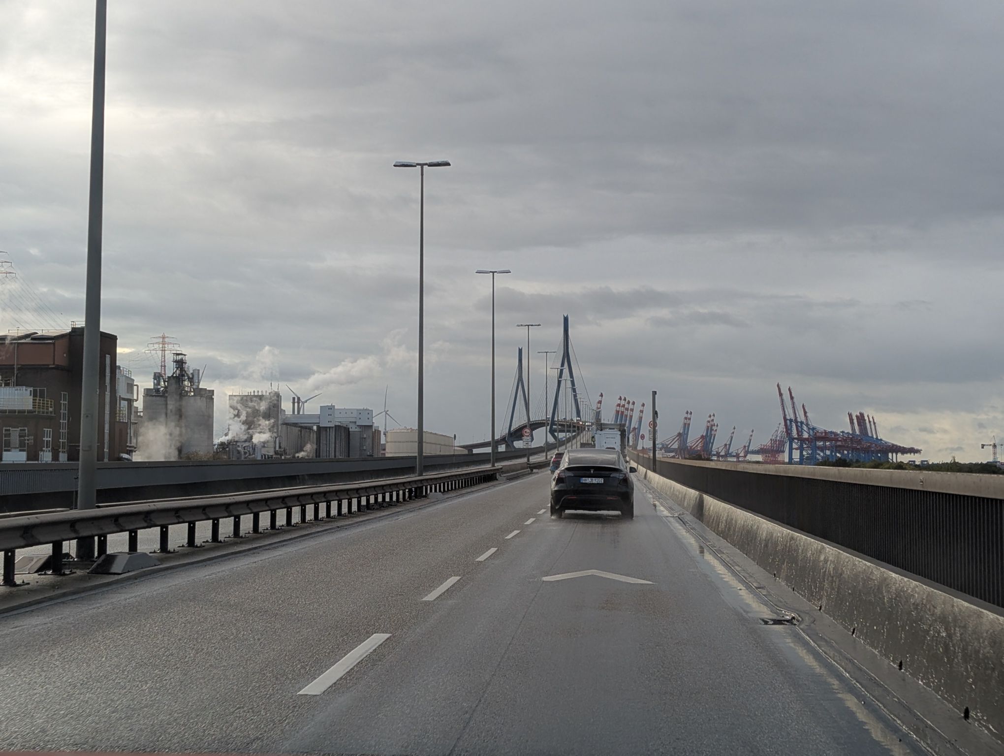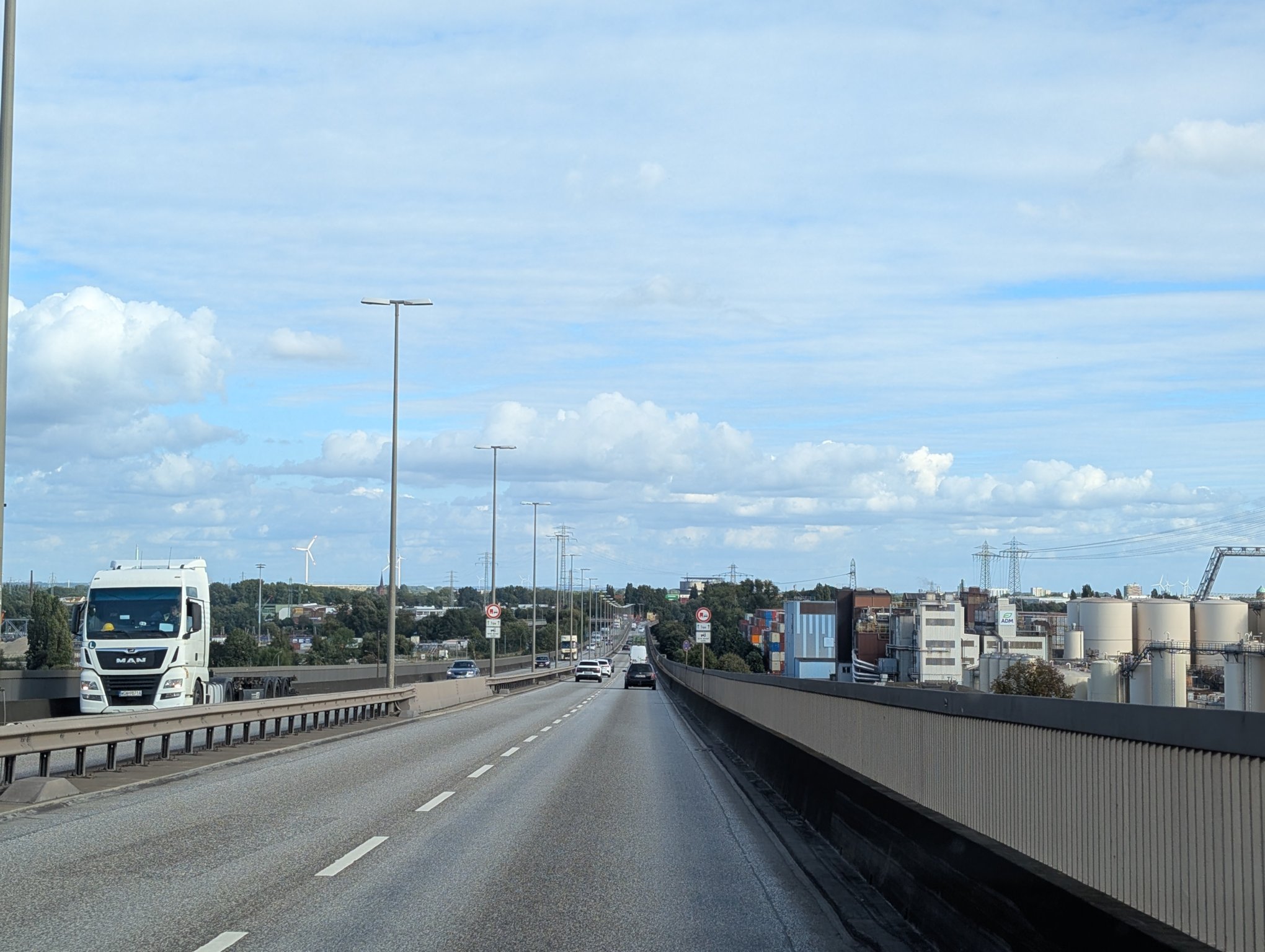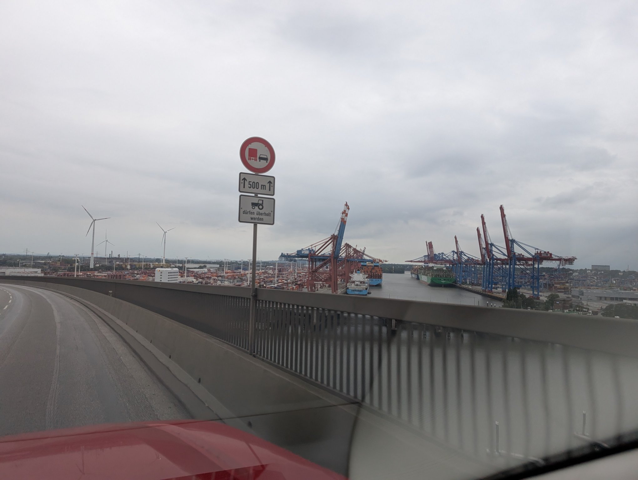 Wir müssen durch Hamburg fahren, was zu Zeiten von Feierabendverkehr schonmal etwas länger dauern kann. Aber dafür fahren wir über die Köhlbrandbrücke, was ich persönlich durchaus ein Highlight finde.