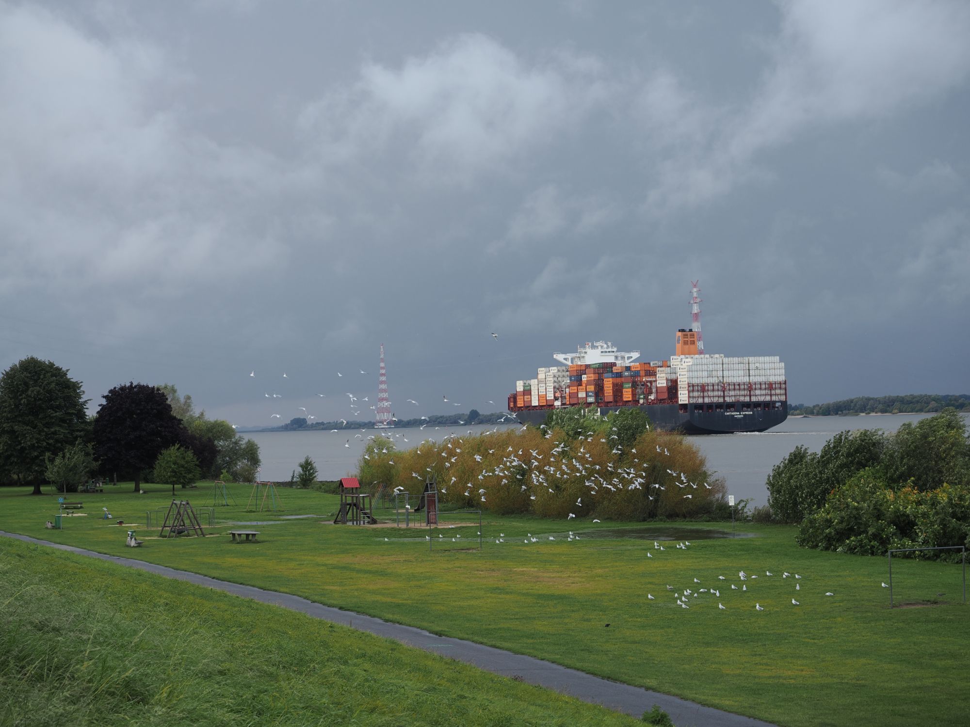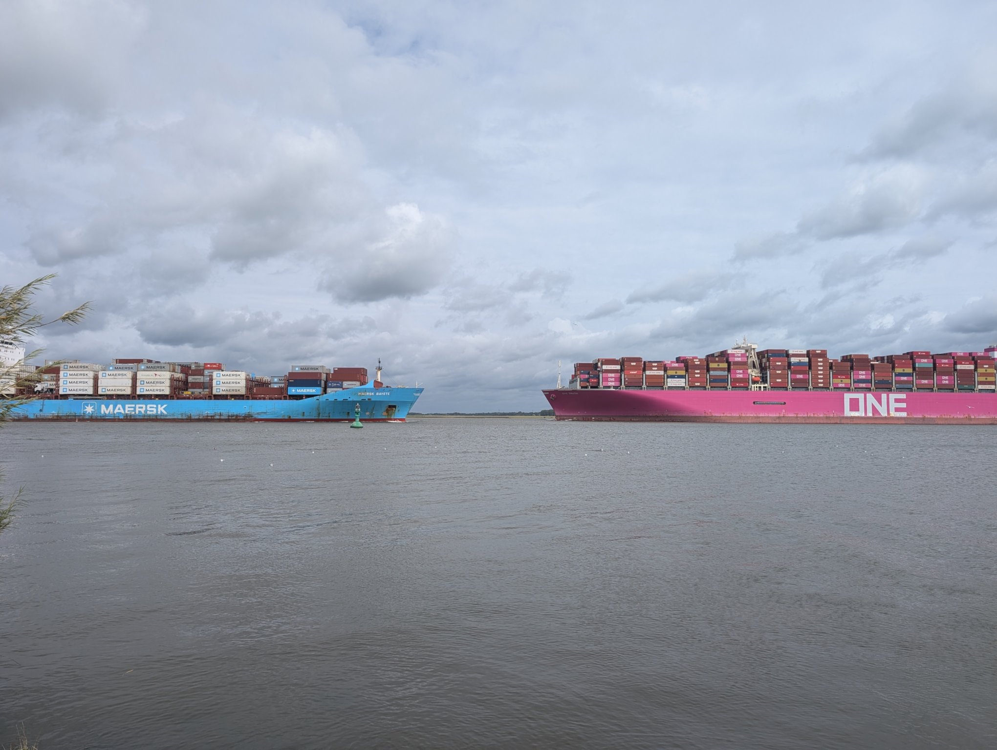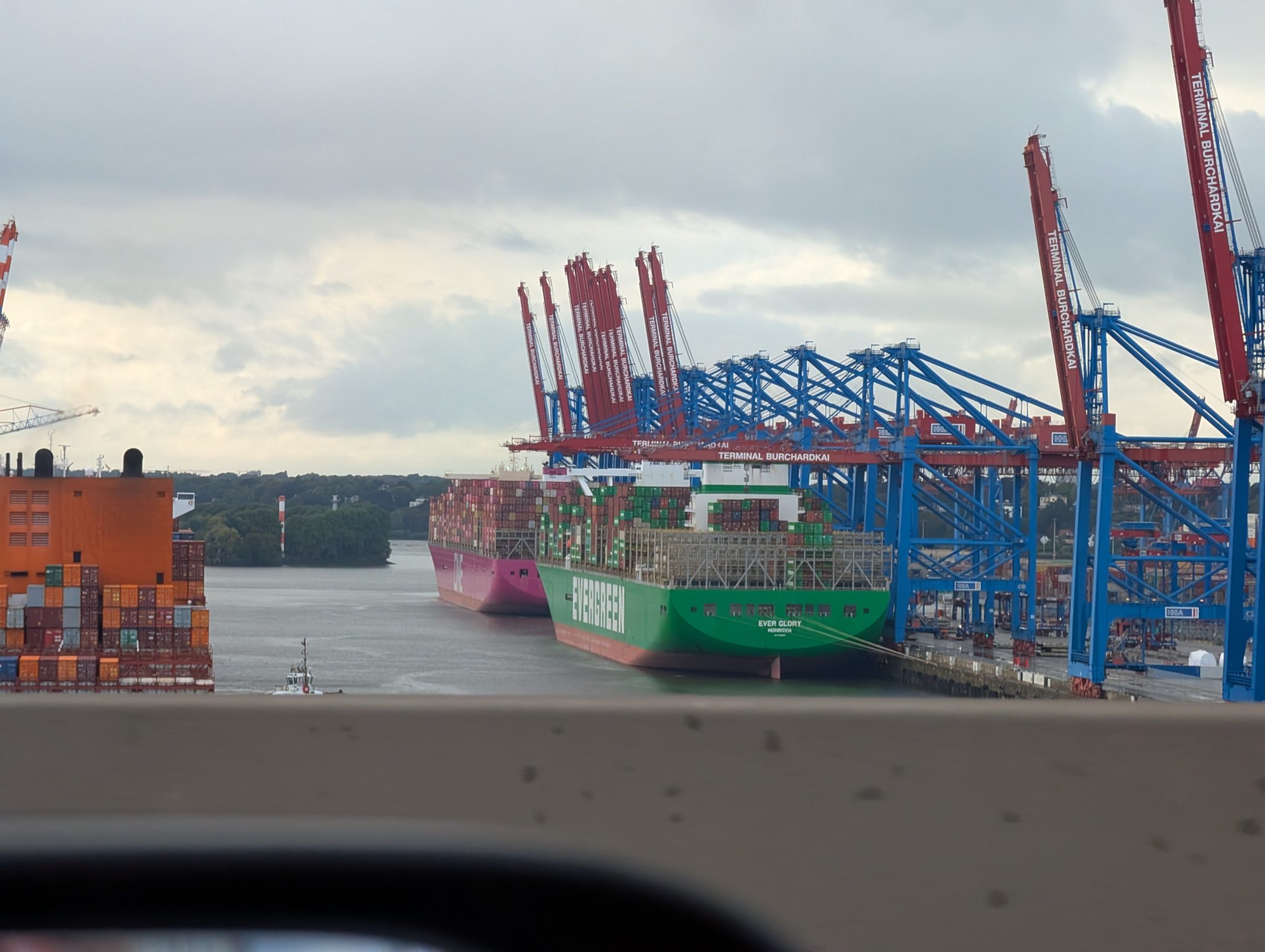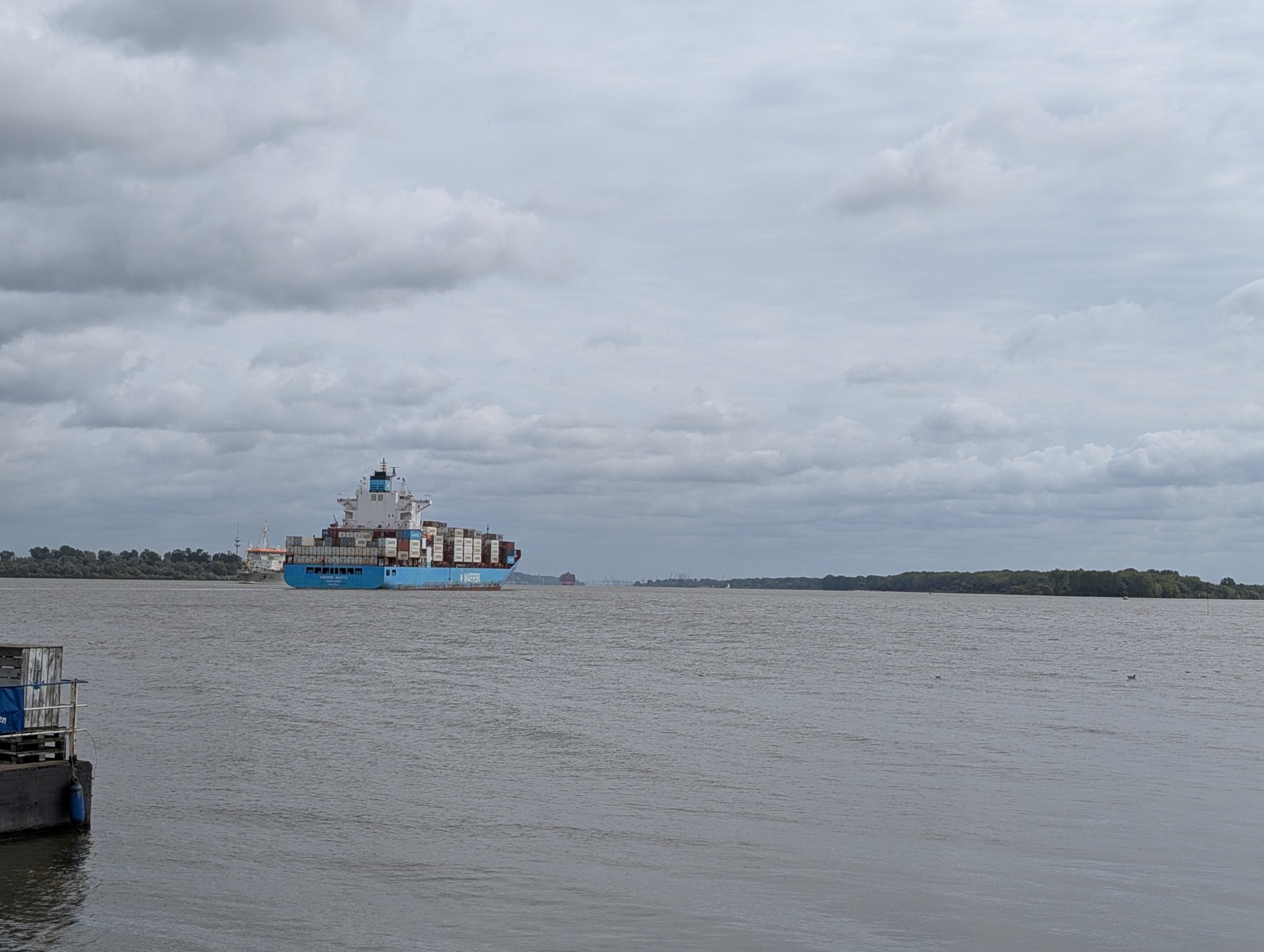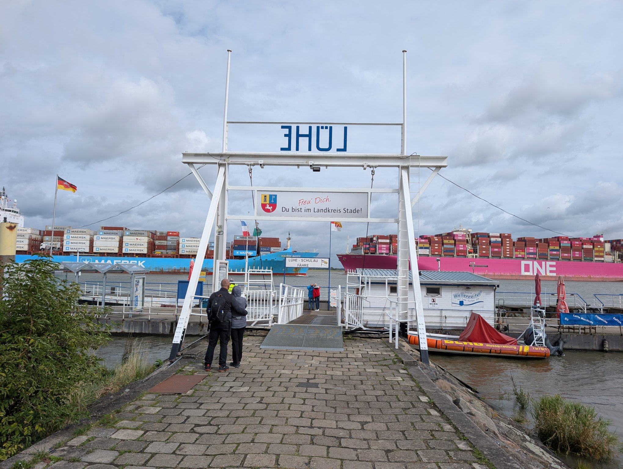 Anschließend laufen wir noch ein bisschen herum. Zunächst gehen wir zum Fähranleger, es kommen nämlich gerade zwei Containerschiffe an, aus jeder Richtung eines.