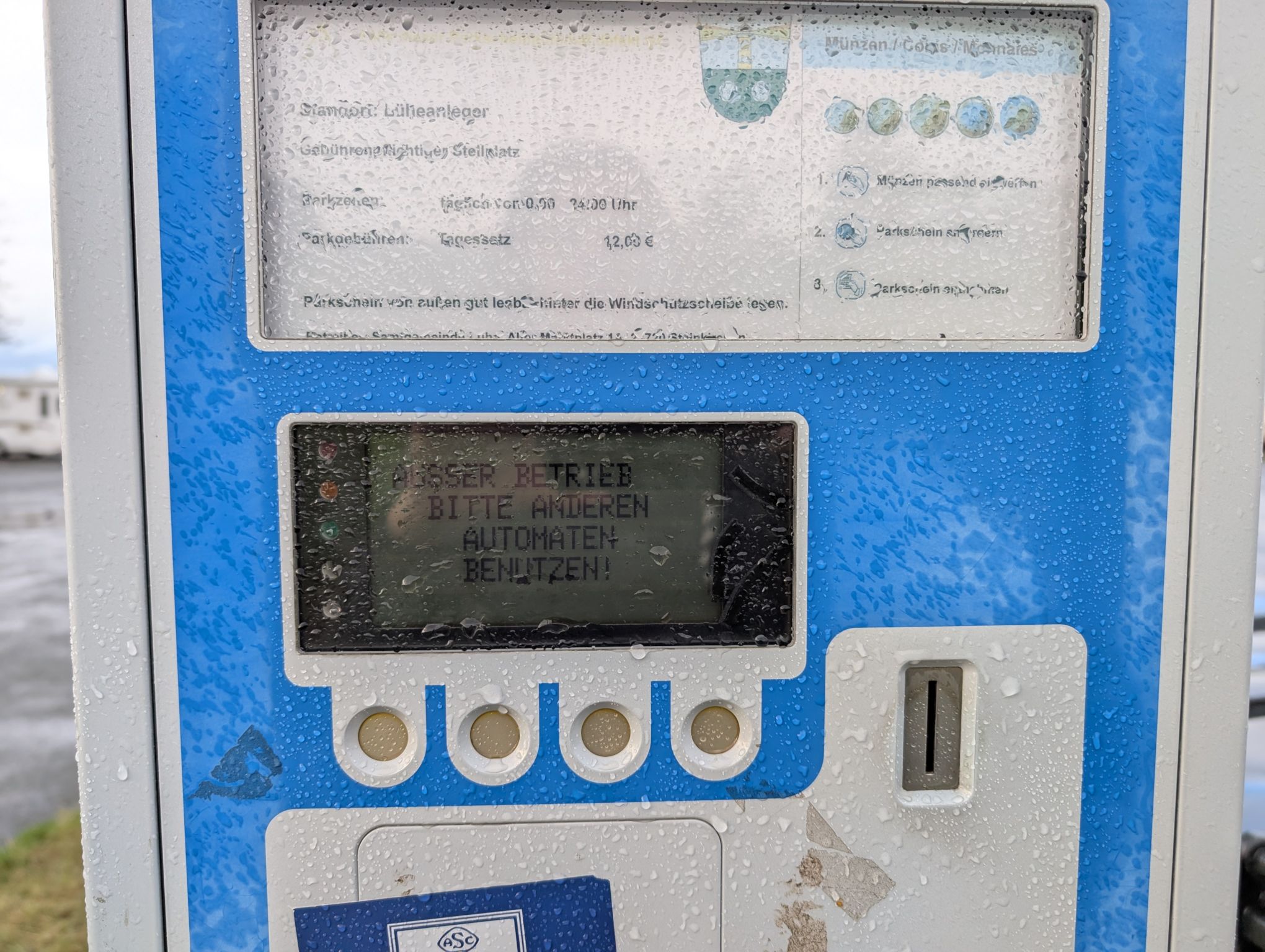 Der Bezahlautomat am Stellplatz ist außer Betrieb. Der zweite Automat bietet keinen Wohnmobiltarif an, weswegen wir sogar kostenlos hier stehen.