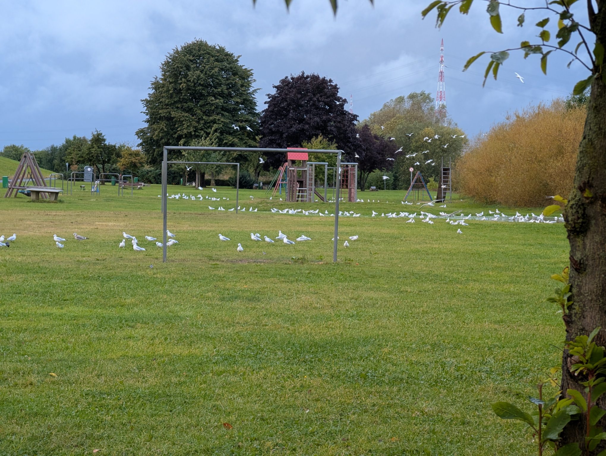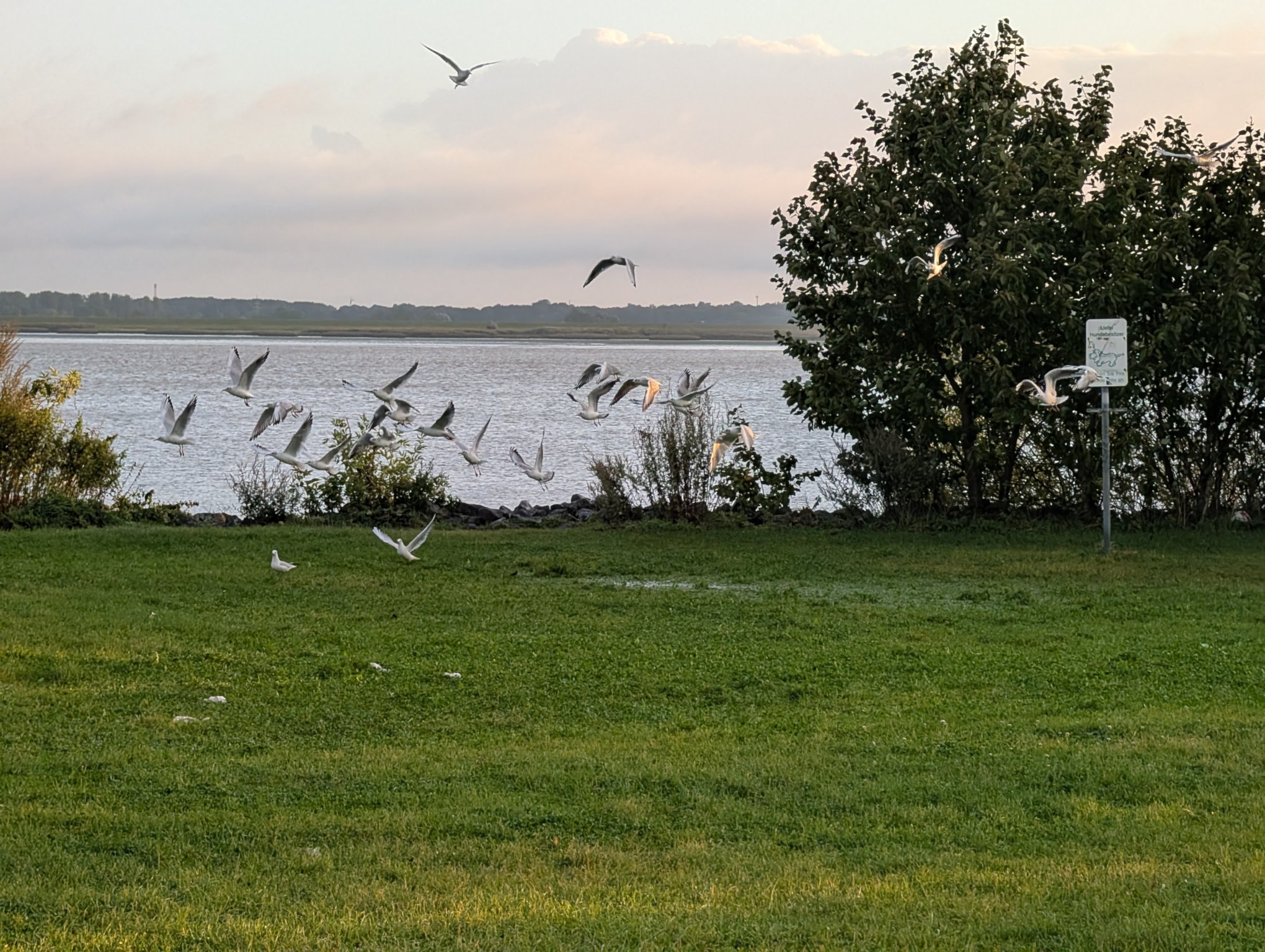 Der Stellplatz liegt zwischen dem Deich und der Elbe. Bei Sturmfluten ist hier natürlich kein Stehen möglich. Aber das aktuelle Tief, das den witzigen Namen Zack trägt, sorgt zwar für ordentlich Wind und auch ein wenig Hochwasser, aber für eine Sturmflut reicht es nicht. Der Wind ist noch recht kräftig. Die Möwen haben auf der Wiese eine ziemlich große Pfütze, auf der sie herumpaddeln.