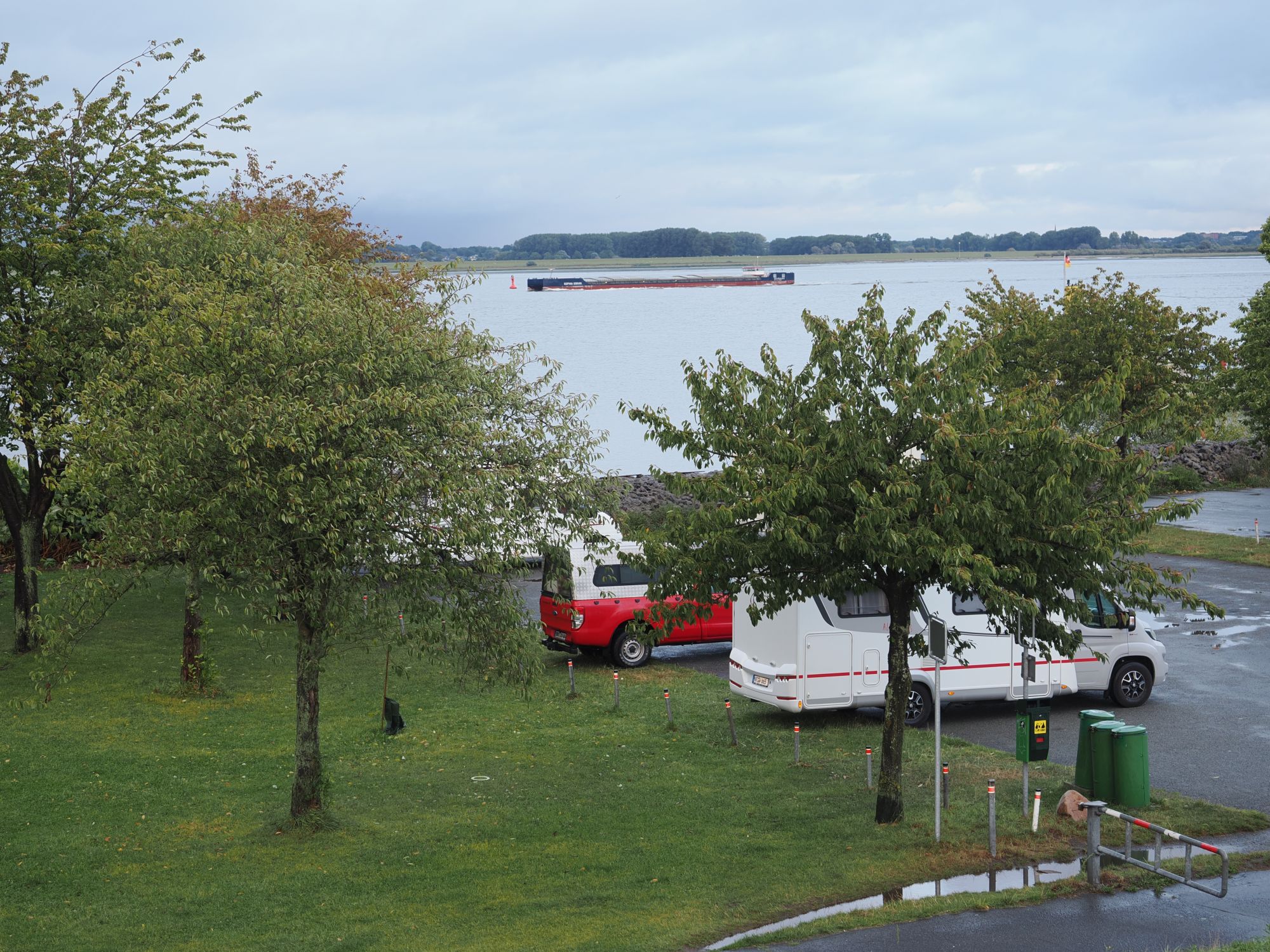 Anschließend gibt es heißen Tee und Abendbrot. Ab und zu hört man die Schiffe auf dem Fluss vorbeiwummern, ansonsten ist es angenehm ruhig auf dem Platz.