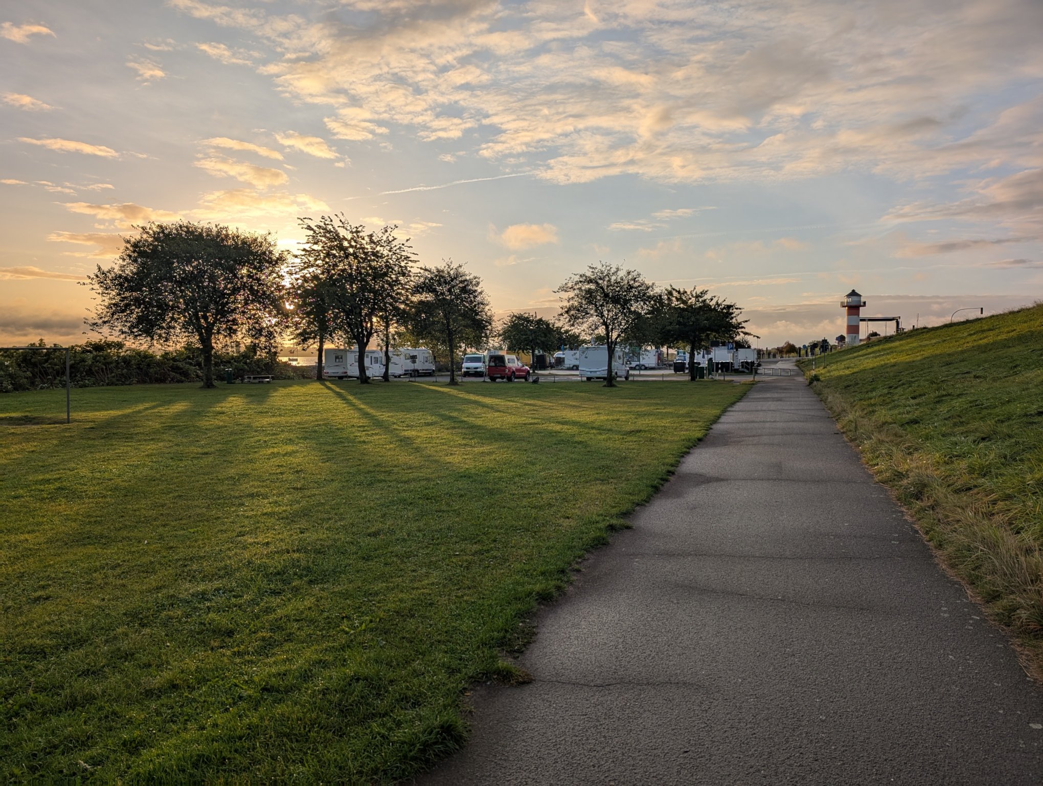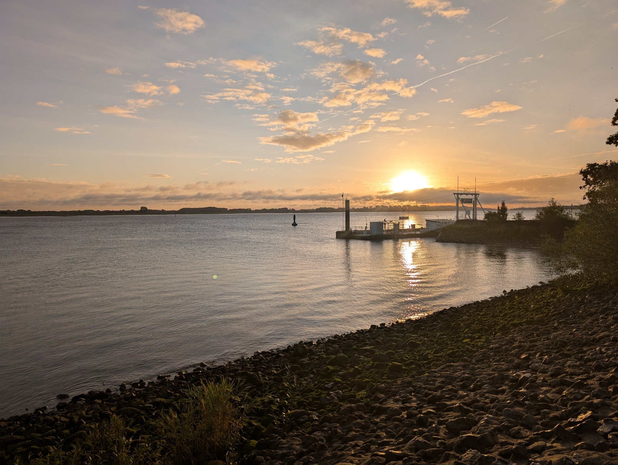 Wie immer an Arbeitstagen im Camper geht der Herr Lebensabschnittsgefährte morgens alleine eine Runde. Der Sonnenaufgang über der Elbe ist richtig toll.