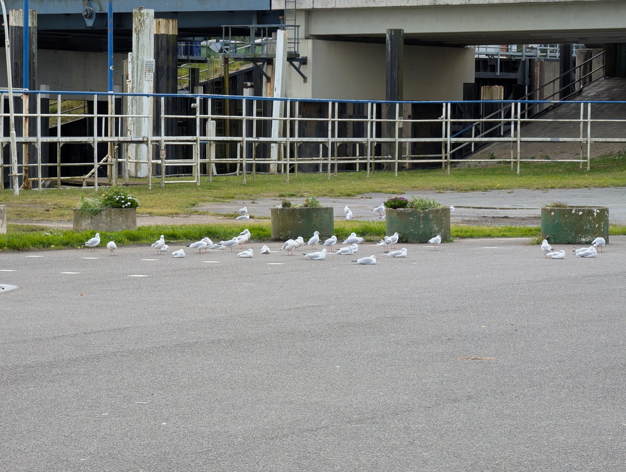 Den hinteren Teil des Pkw-Parkplatzes haben die Lachmöwen gebucht. Ein Teil von ihnen hat aber nur einen Steplatz auf dem Geländer des Sperrwerks, wo sie ordentlich aufgereiht sitzen.