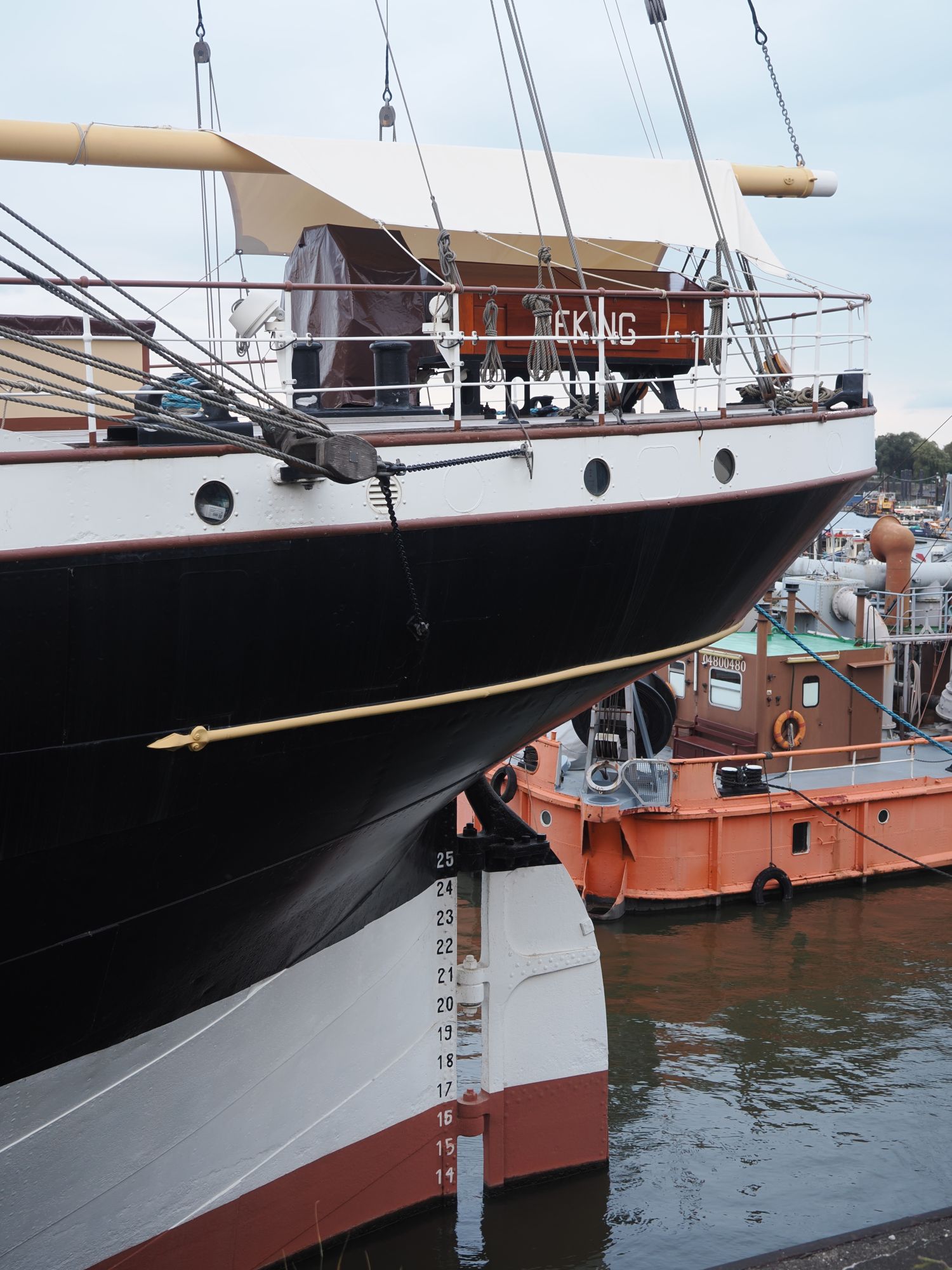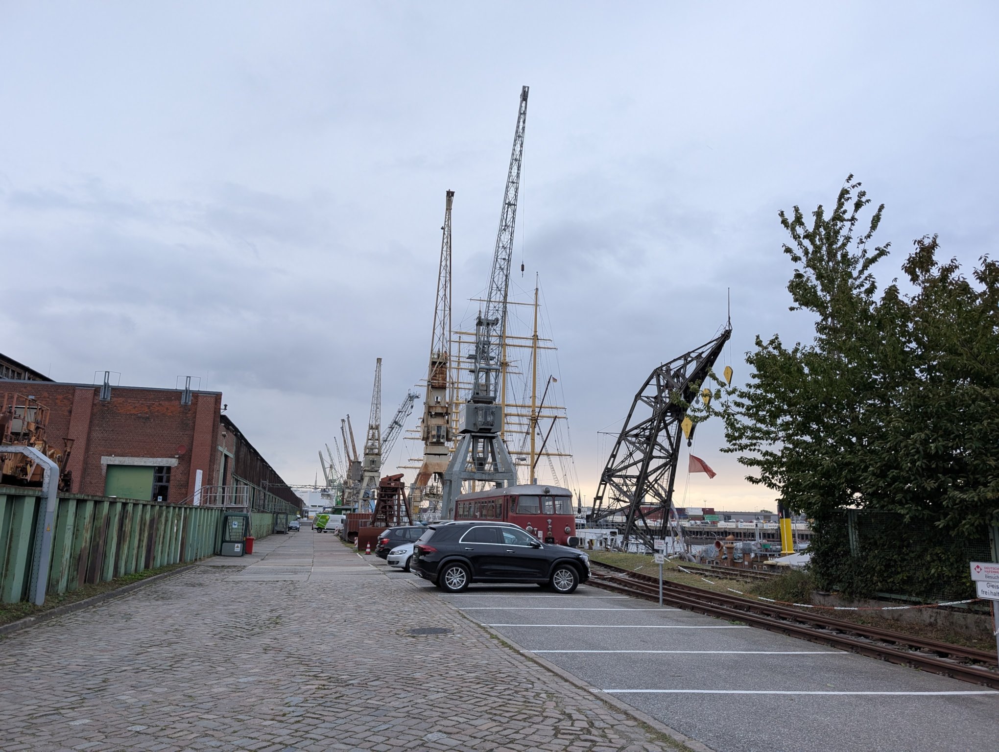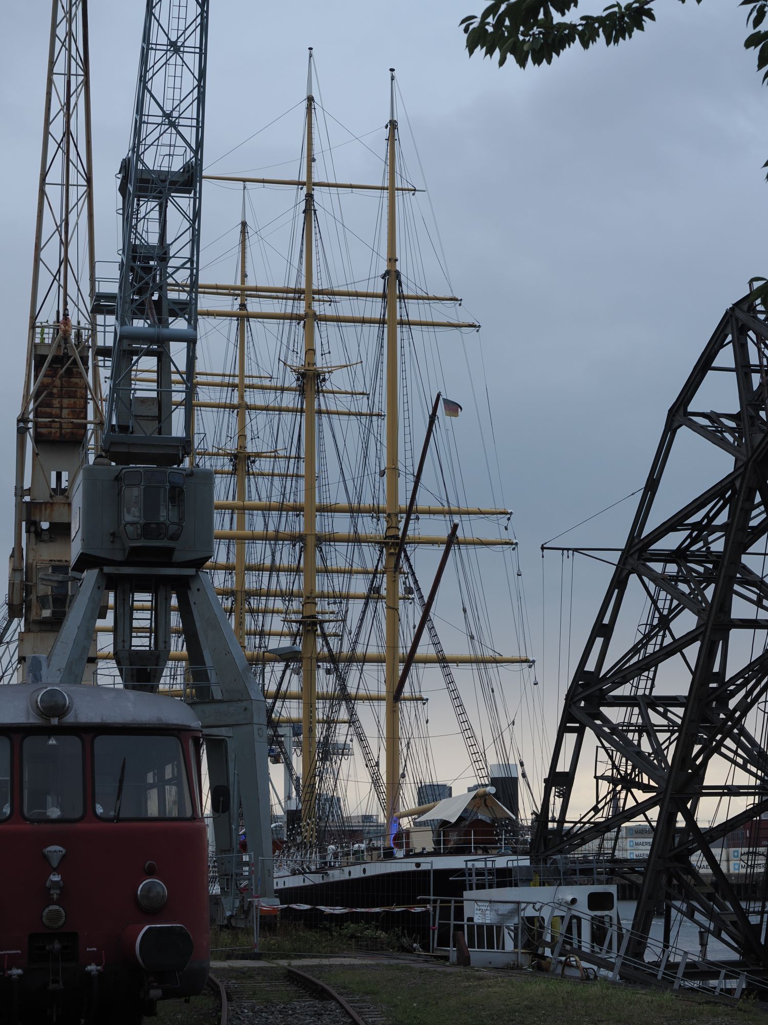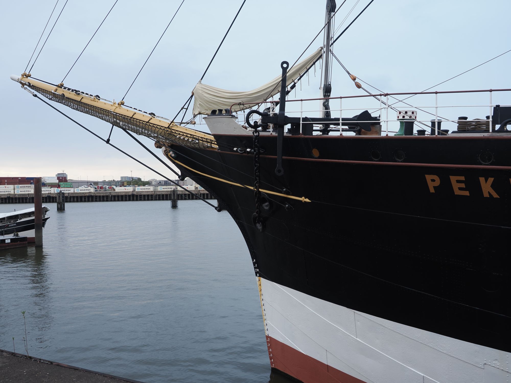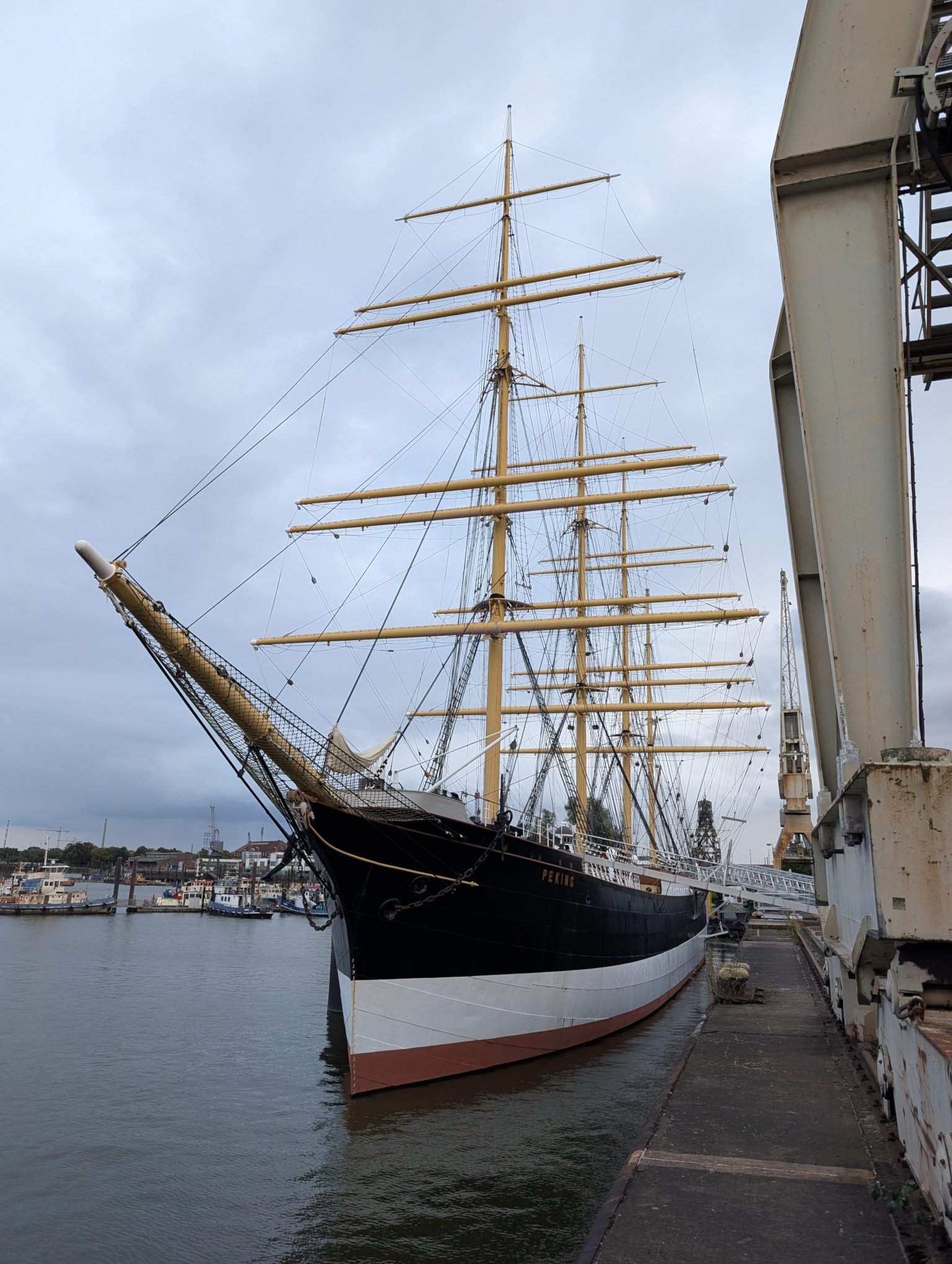 Schon gestern ist uns aufgefallen, dass wir an der Zufahrt zum Hafenmuseum vorbeigefahren sind. Heute wollen wir dort einmal anhalten. Zwar ist es für einen Museumsbesuch schon zu spät, aber aufs Außengelände kommen wir auch so drauf. Und dort an der Kaikante liegt die Peking, eine Viermastbark, die bis 2022 recht aufwändig restauriert wurde und nun hier als Museumsschiff liegt. Auch das haben wir neulich erst in einer Doku gesehen.