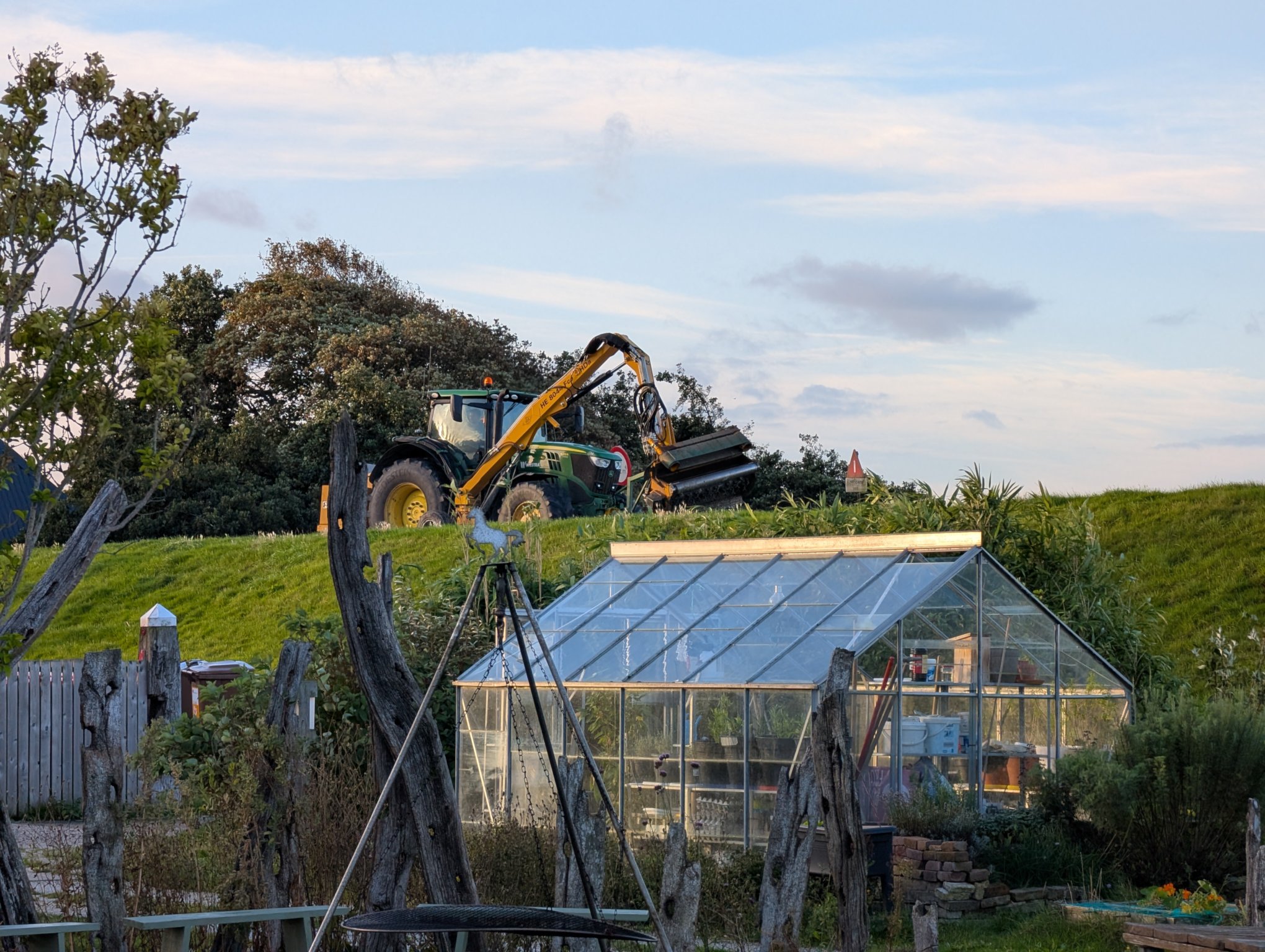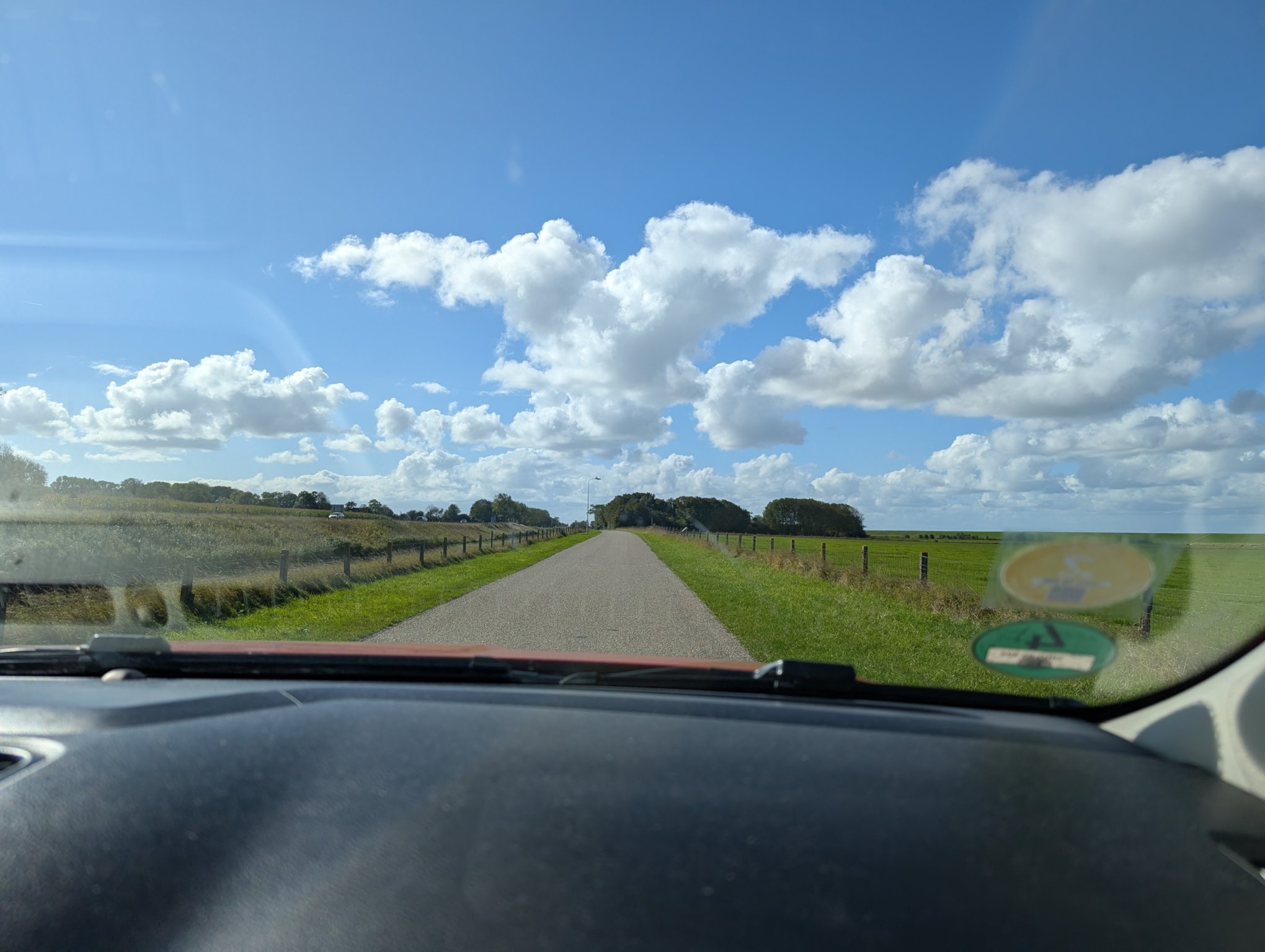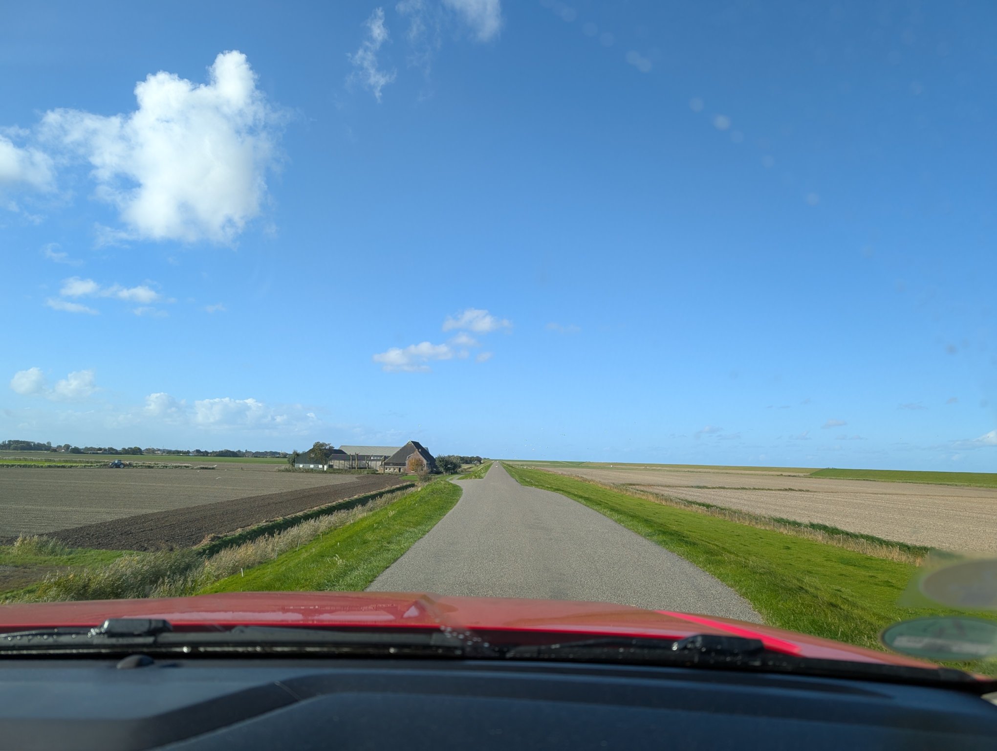 Der letzte Morgen auf dem kleinen, schnuckeligen Stellplatz mit einem Blick aus dem Camper auf den klaren Himmel. Begleitet wird der Morgen von lautem Maschinengeräusch, der Deich wird gemäht.