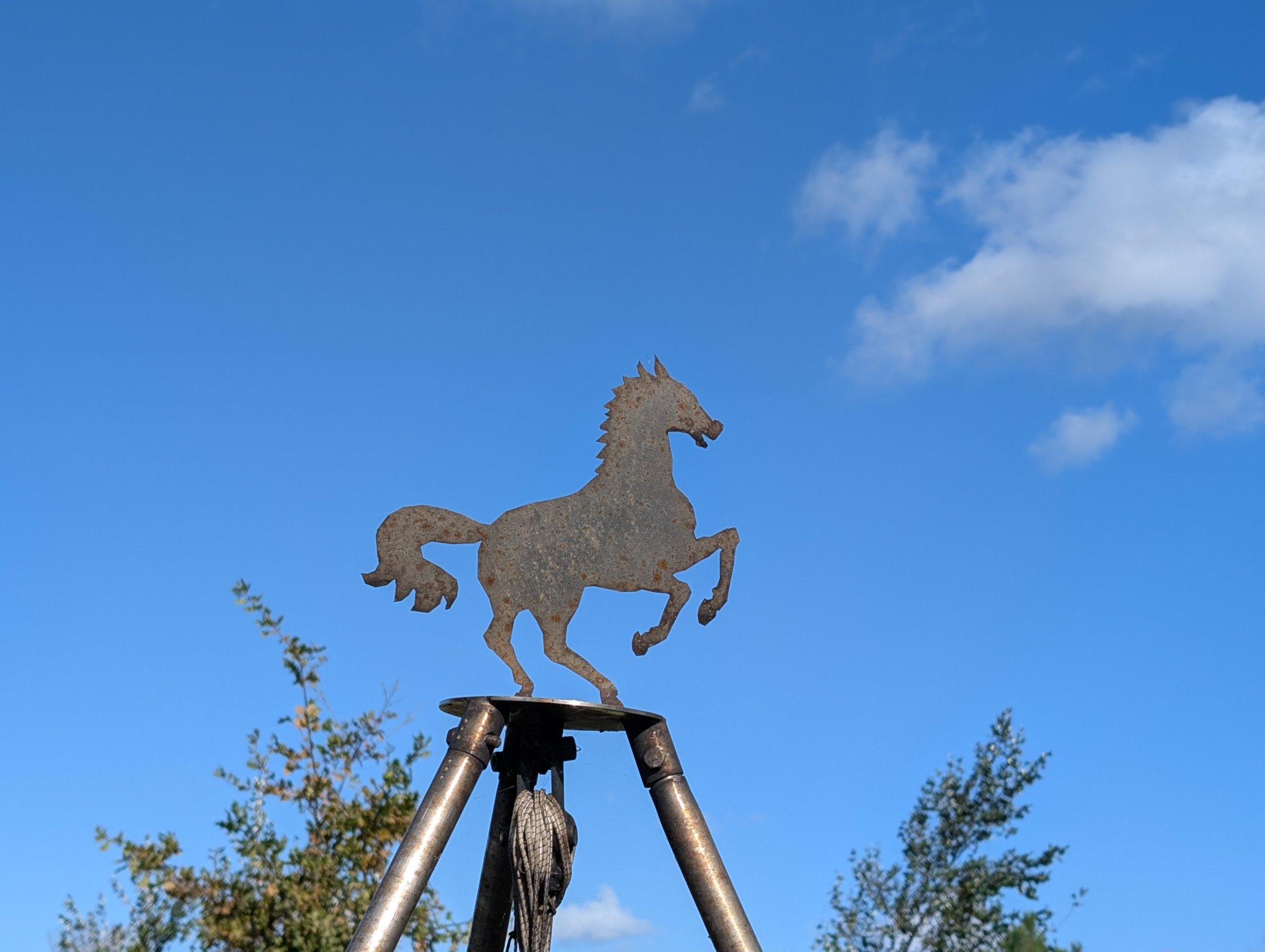 Erst jetzt bei Abreise fällt mir auf, dass der Grill auf dem Grillplatz mit einer Pferdefigur geschmückt ist. Sehr hübsch. Wir werfen unseren Müll die in die jeweiligen Tonnen und fahren los.