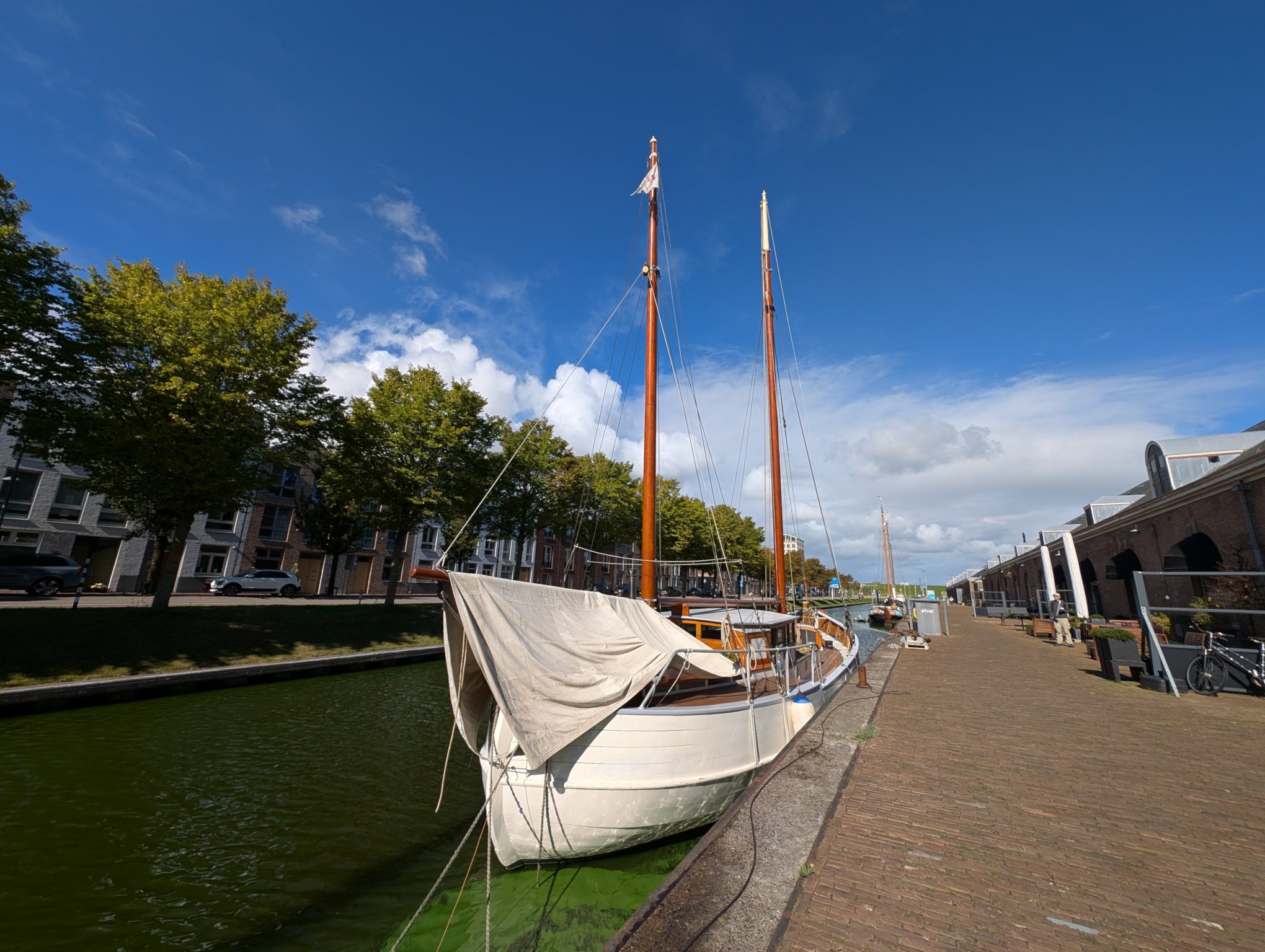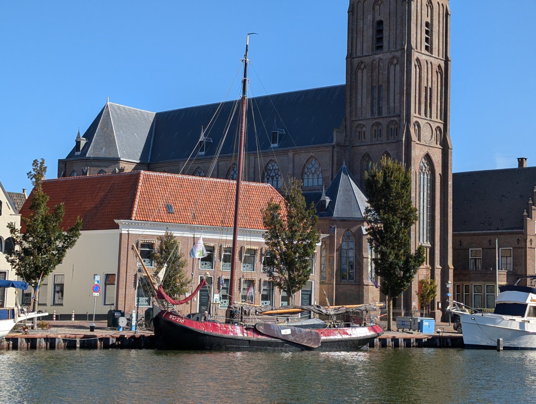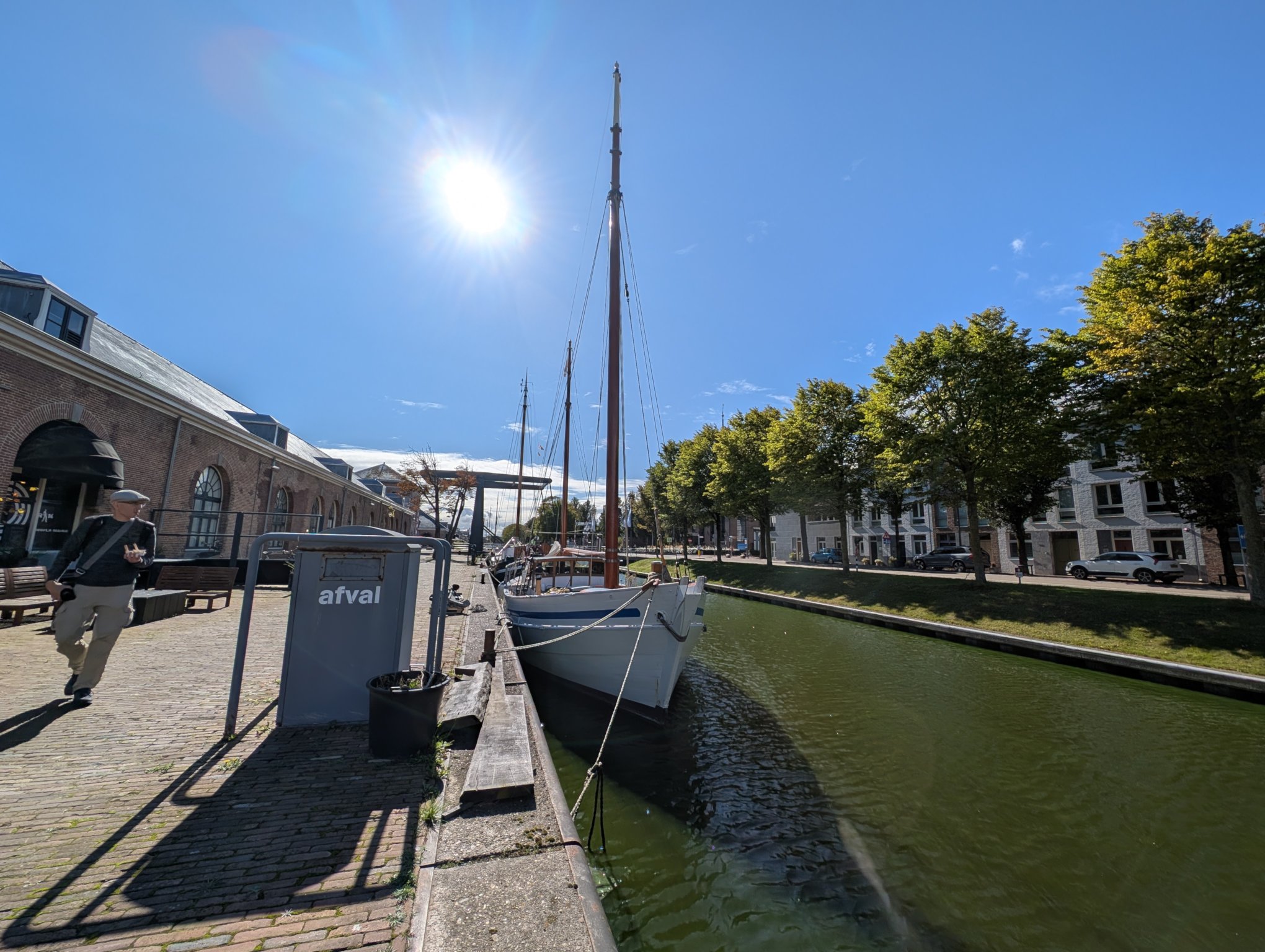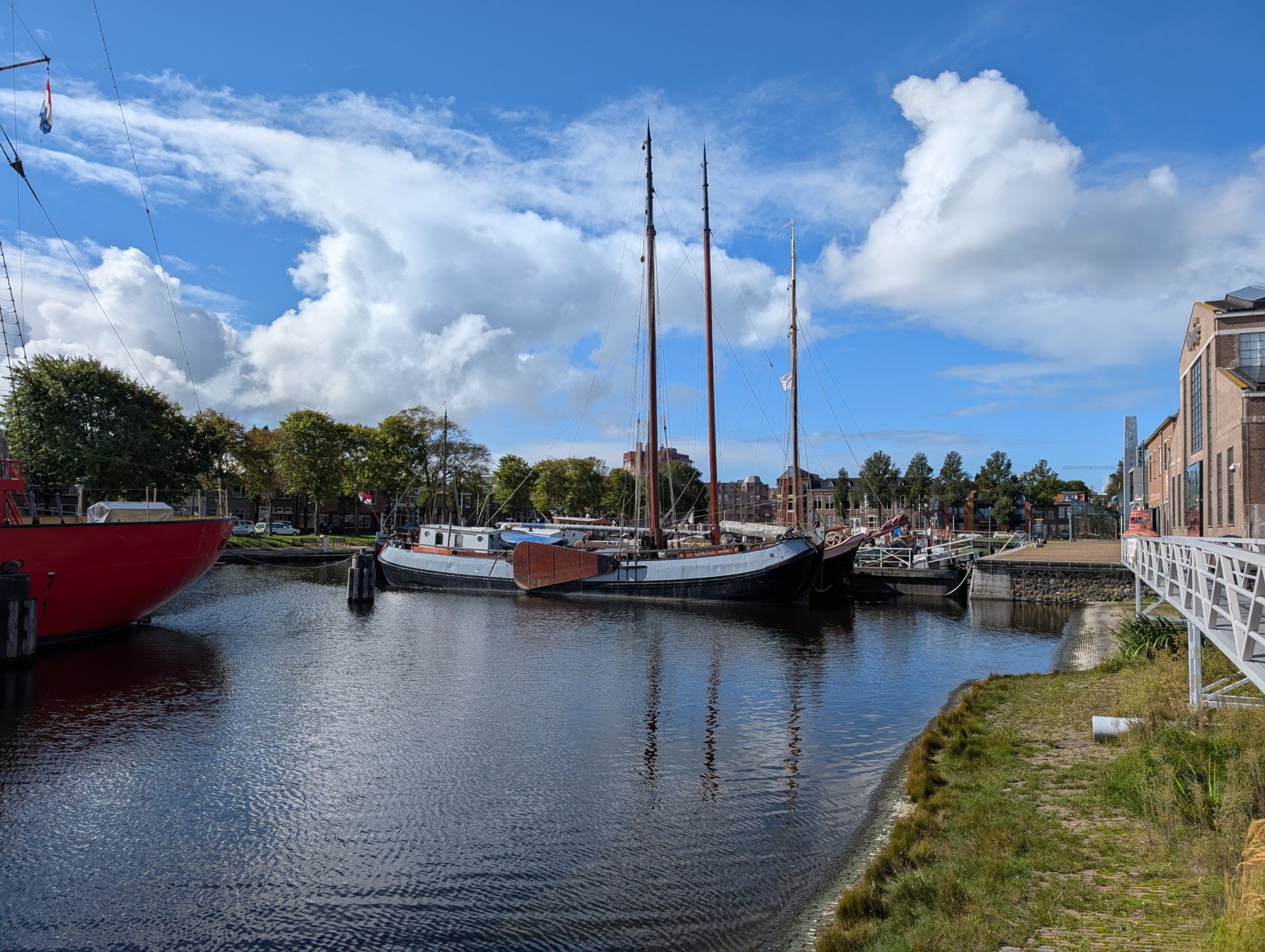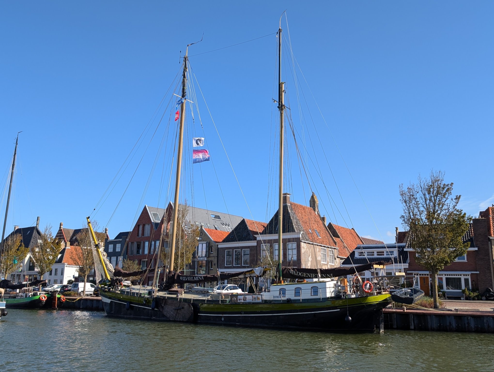 Eine meiner Follower*innen im Fedivers hat mich auf das Schiff De Wilhelmina aufmerksam gemacht. Und wie es der Zufall so will, ist sie das erste Schiff, das wir sehen, als wir vom Parkplatz zur Gracht gehen.