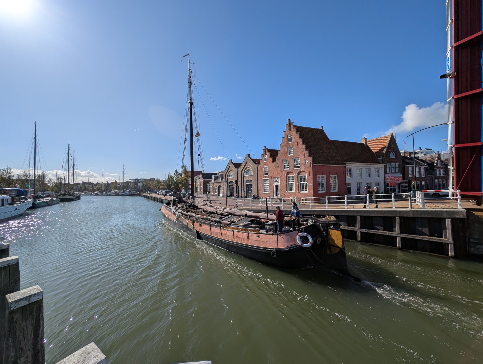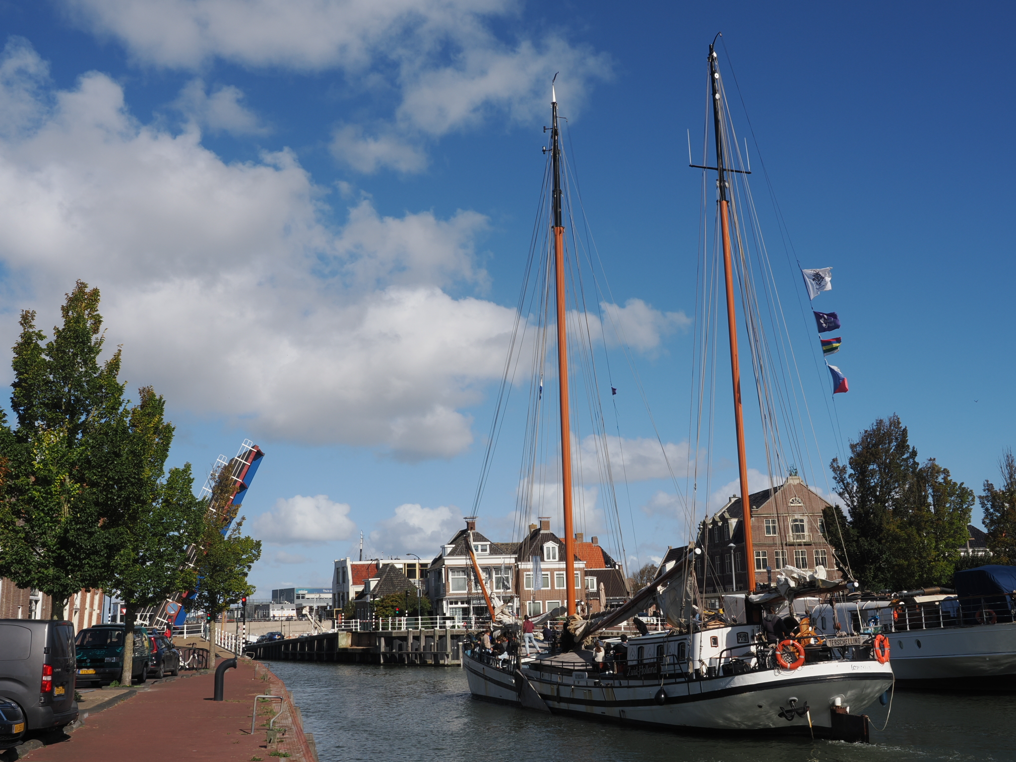 Wir gehen am Zuiderhaven entlang Richtung Süden und zurück über die Vorstraat. Dort müssen wir an der Klappbrücke über die Zufahrt zum Zuiderhaven warten, da gerade ein Boot diese passiert.