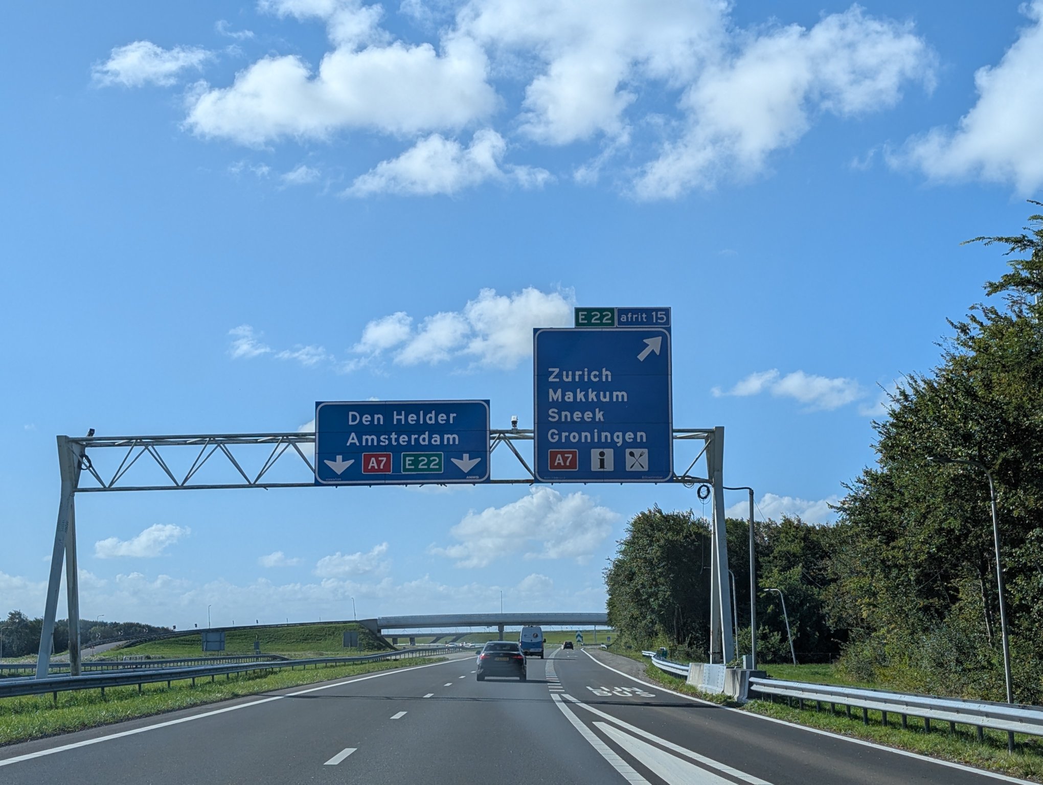 Unser Auto steht auf dem Parkplatz vom Supermarkt Albert Heijn. Dort gehen wir noch einkaufen und dann fahren wir weiter. Unser Ziel ist heute die Insel Texel. Dafür müssen wir über den Afsluitdijk (Abschlussdeich) fahren. Wir könnten aber auch nach Zürich fahren.