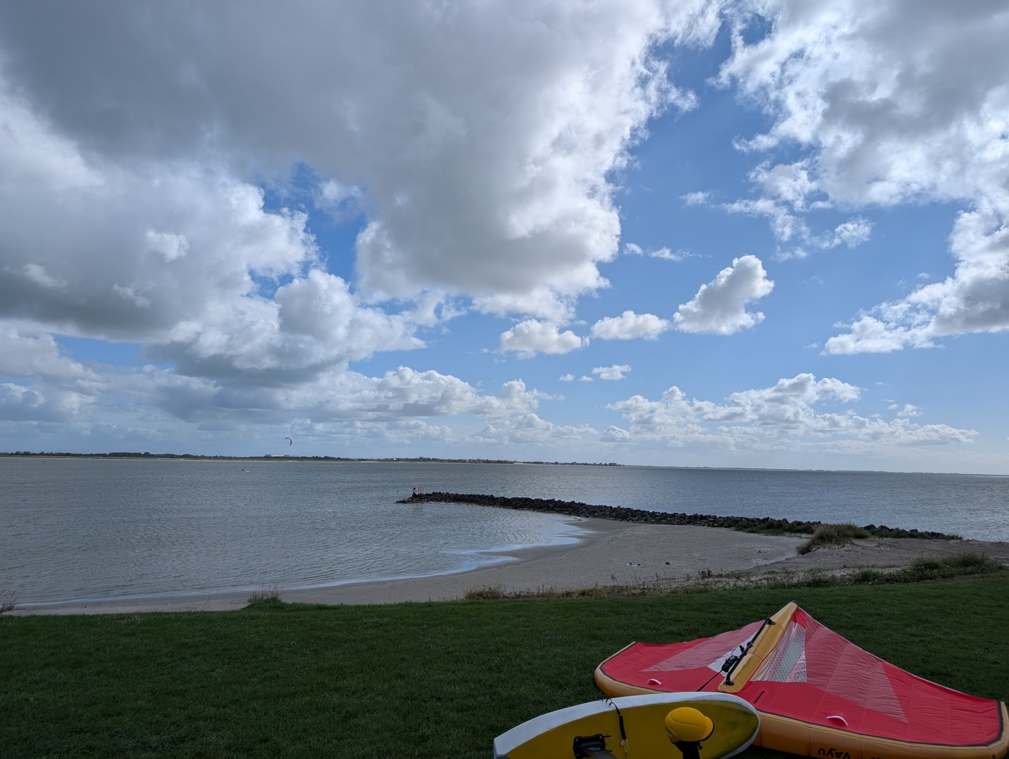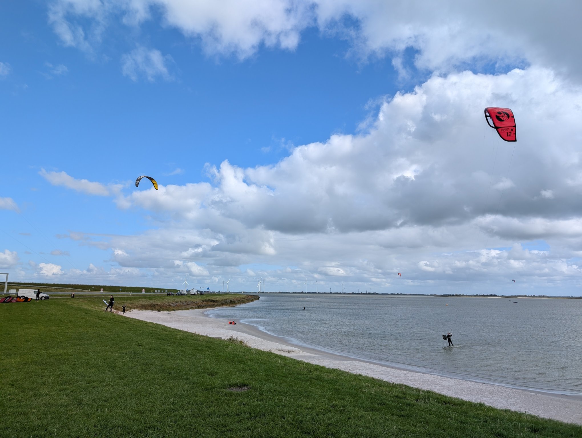 Bevor wir das östliche Sperrwerk und die Klappbrücke passieren, gibt es einen Rastplatz, wo wir für ein Mittagessen anhalten. Der Ort ist auch Surfspot. So gibt’s zum Essen auch Unterhaltungsprogramm