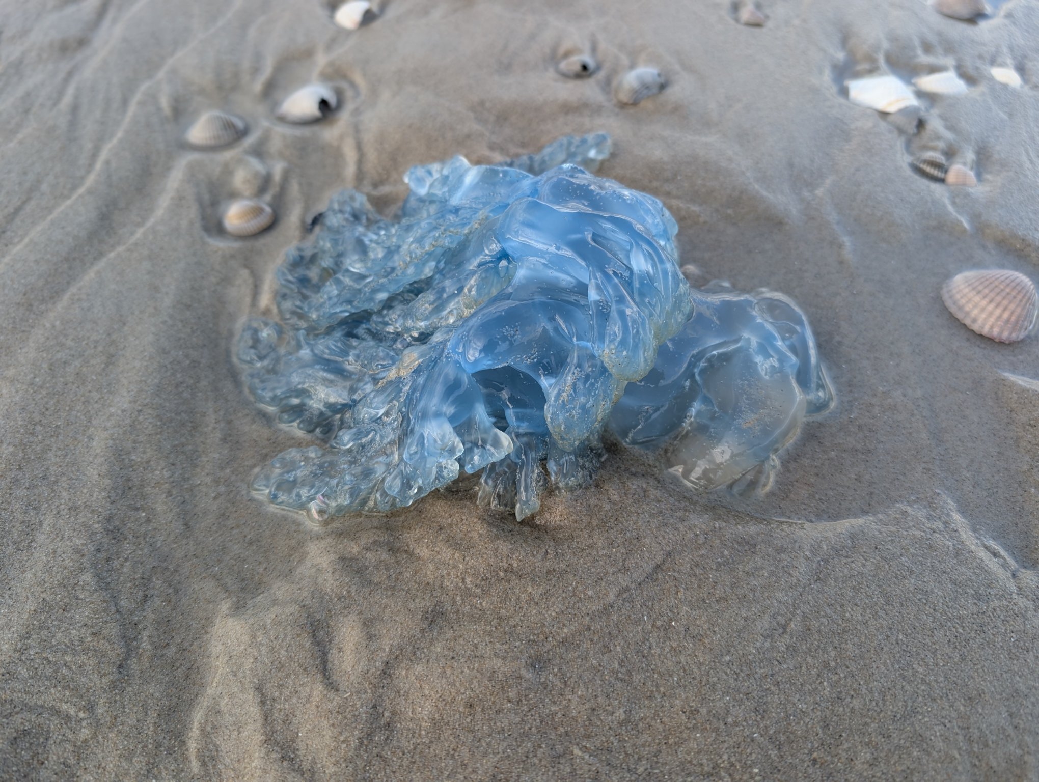 Am Strand liegen ziemlich viele blaue Quallen herum. Die sind ganz schön groß, bis zu 30 cm Durchmesser. Beim Schwimmen möchte man denen nicht begegnen, die können schon ein wenig Aua machen.